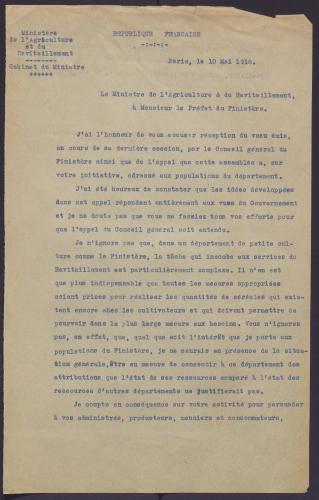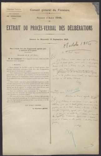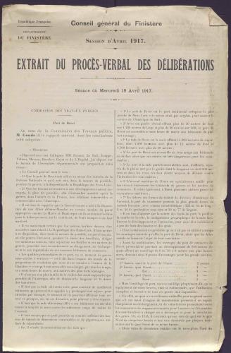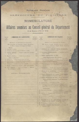 1915 En 1915, le Conseil prend des mesures pour donner « secours en nature aux populations victimes de la guerre ». Session d'avril 1915. 1 N 228 Session d'avril 1915. 1 N 228 PrécédentSuivant 1916 En 1916, le Conseil décide de mettre en place un plan d’organisation agricole pour le lendemain de la guerre. Session d'août 1916. 1 N 229 1917 En 1917, le Conseil rédige un document concernant le port de Brest et la défense du territoire national. Séance d'avril 1917. 1 N 230 Séance d'avril 1917. 1 N 230 PrécédentSuivant 1918 Face à la crise céréalière que traverse le Finistère en 1918, le Conseil (à la demande de l’Etat) appelle les cultivateurs et les consommateurs à rester prudent. Appel aux agriculteurs et consommateurs. 1 N 231 Retourner à la frise chronologique