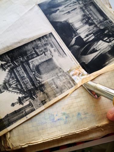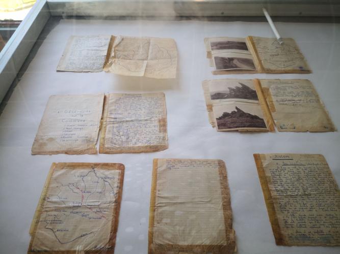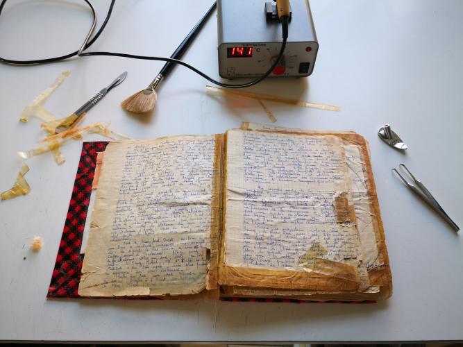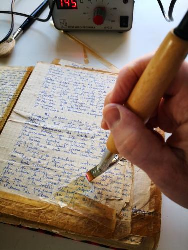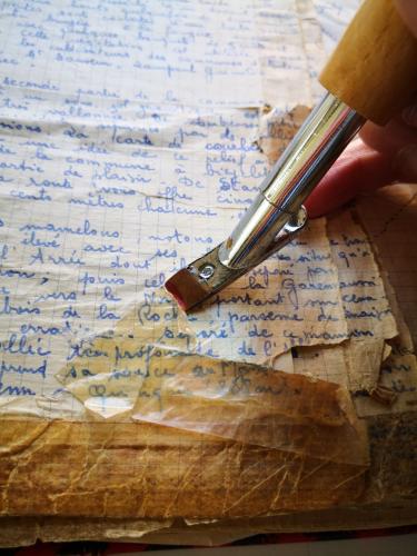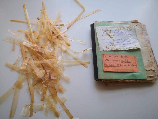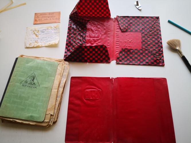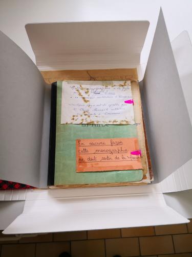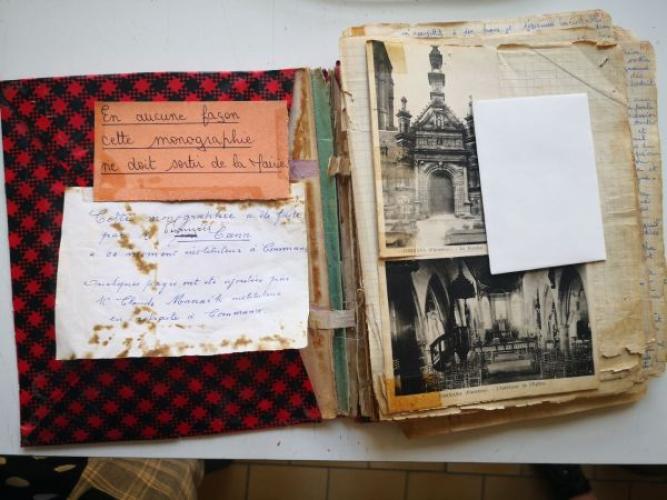 Une pépite au coeur du fonds Certains documents suscitent parfois une émotion particulière... Ce cahier, avec sa couverture de plastique à carreaux rouge et noir qui fait tout son charme, a été transmis par la secrétaire de mairie lors de la prise en charge du dépôt des archives de la commune. Conservé précieusement dans son bureau, ce document est le fruit du travail d’un instituteur qui y a consigné à la plume, les éléments géographiques et historiques sur la commune : le relief, le climat, l’hydrographie, la population, les éléments sur la vie économique. Le cahier, rédigé approximativement entre 1946 et 1970, est illustré de cartes dessinées à la main, de cartes postales et de photos. On apprend (vue n°10) que située sur le flanc nord des Monts d’Arrée, au cœur du Finistère, la commune souffre « d’un vent à peu près continuellement; même en été on supporte un lainage". Autre particularité locale : "le crachin et la brume". On découvre au fil des pages, les notes historiques rédigées par l'instituteur, des transcriptions de documents anciens, la description du déroulement d'un mariage (vue n° 91). Il nous indique qu'en 1946, il existait 17 fumières à Commana (vue n°111), et on ressent son émotion (vue n°122) lorsqu'il indique à côté de la liste des "Morts pour la France" des deux conflits "Quelle hécatombe"... A noter : Il s’agit ici d’un document très rare dans les fonds déposés par les communes du Finistère. Découvrir le document Un document restauré au sein de l'atelier des Archives départementales Ce cahier était fragilisé par de nombreuses consultations, par le poids des images collées, et par les bandes de scotch qui fixaient les photos et cartes postales. L'équipe de l'Atelier de restauration a dans un premier temps défait la reliure et méticuleusement retiré tout ce qui pouvait contribuer à altérer les pages, décollé à la spatule chauffante toutes les bandes de scotch, mis à plat les pages et les documents gondolés, procédé à un nettoyage minutieux de l'ensemble. Toutes les pièces ont ensuite été assemblées à nouveau pour lui redonner son aspect d’origine. En règle générale, les couvertures en plastique sont supprimées et remplacées par des matériaux de conservation. Mais dans ce cas précis, la couverture à carreaux faisait en partie le charme de ce document original. La couverture en plastique à carreaux a donc été conservées dans une chemise tampon insérée entre le cahier et le plastique, l'ensemble a été conditionné dans un étui de conservation. Après la restauration, la numérisation a permis de mettre en ligne les images et de rendre accessible à tous ce document. Dans les coulisses de la restauration ... Cahier décousu, photos recollées au scotch .. Désassemblage du cahier : deux couvertures plastiques ! ! Opération de chirurgie minutieuse à la spatule chauffante Je décolle, tu décolles, il décolle !!! Travail de patience et de précision Décollage des photos Eradication du scotch ! Mise à plat Sens dessus dessous ? Mais non ! Tout beau, tout propre ! Cahier préservé pour une durée indéterminée ! PrécédentSuivant