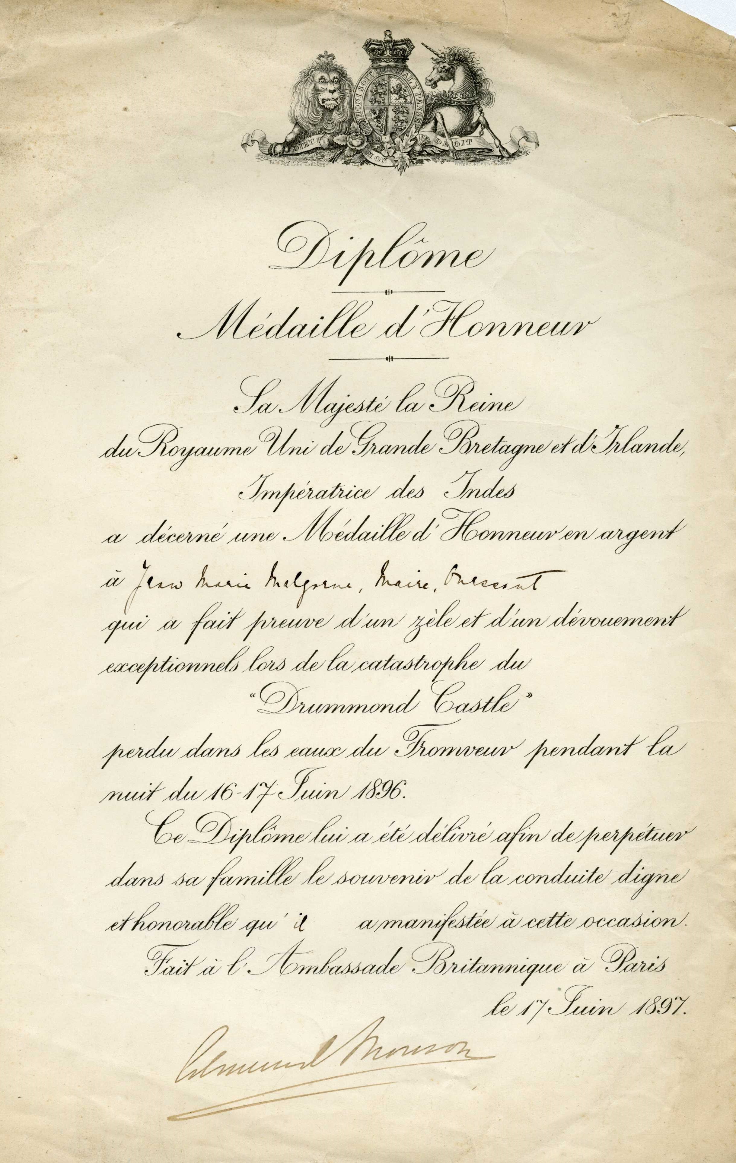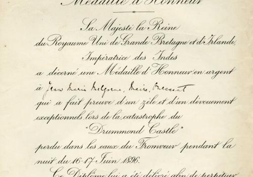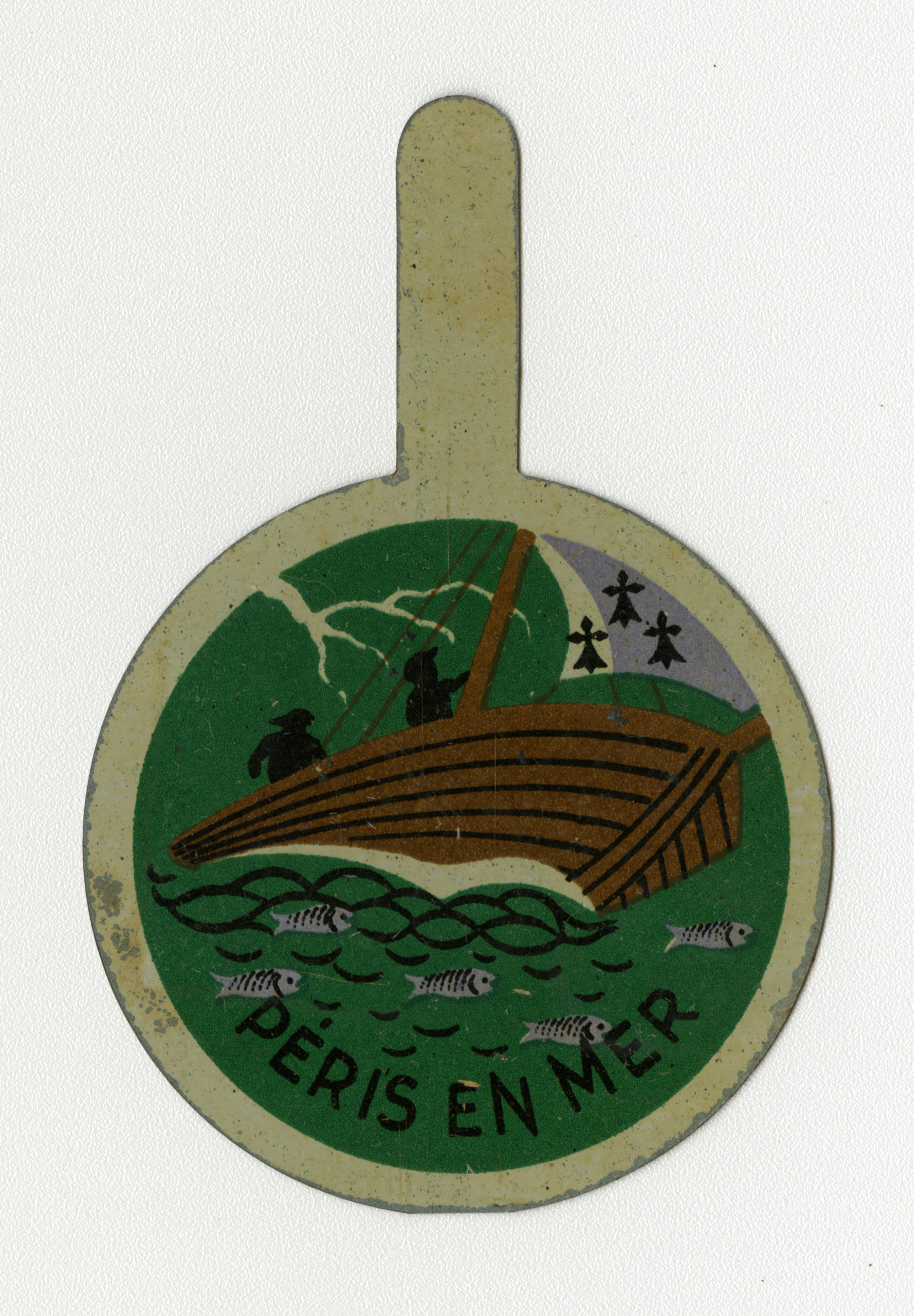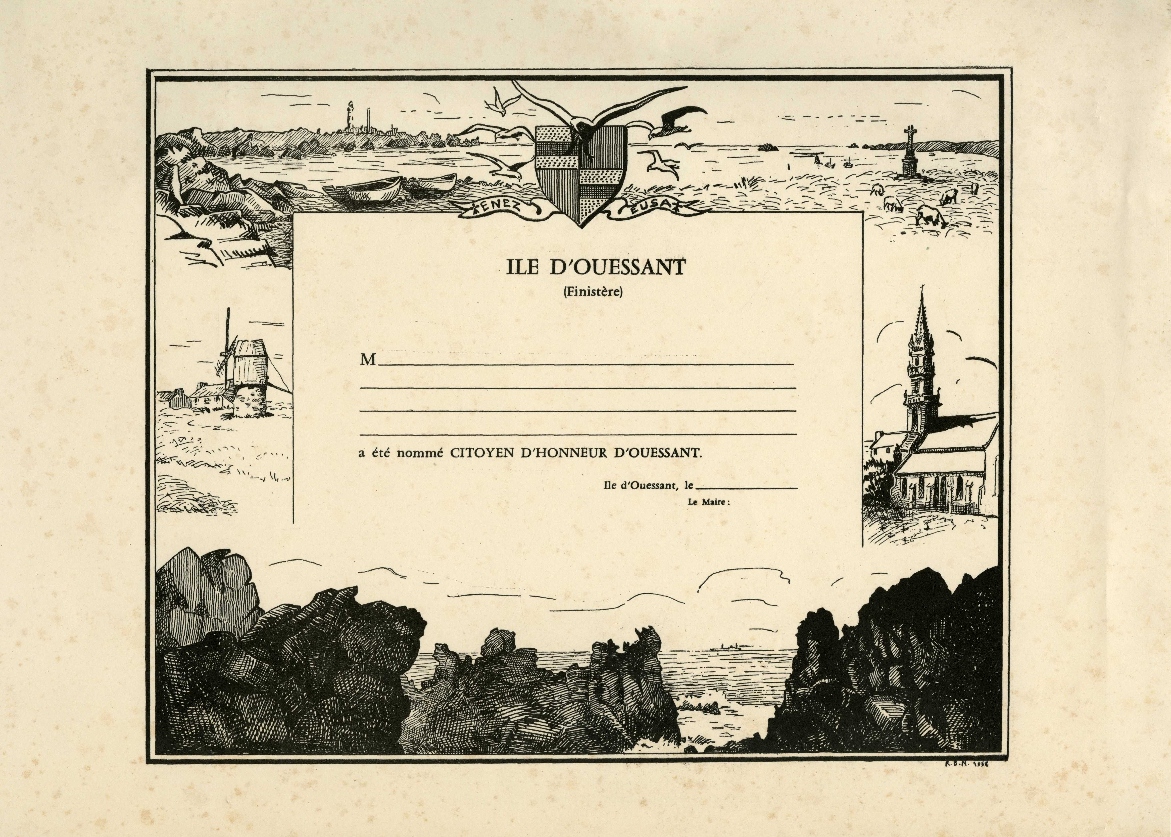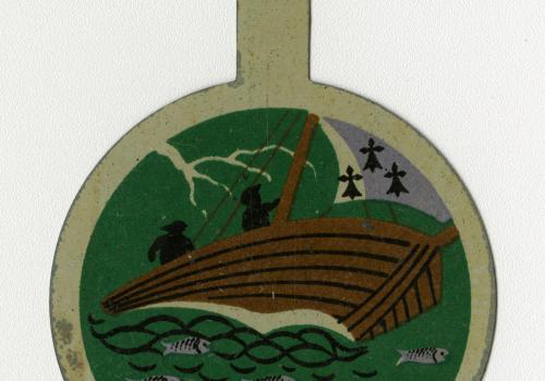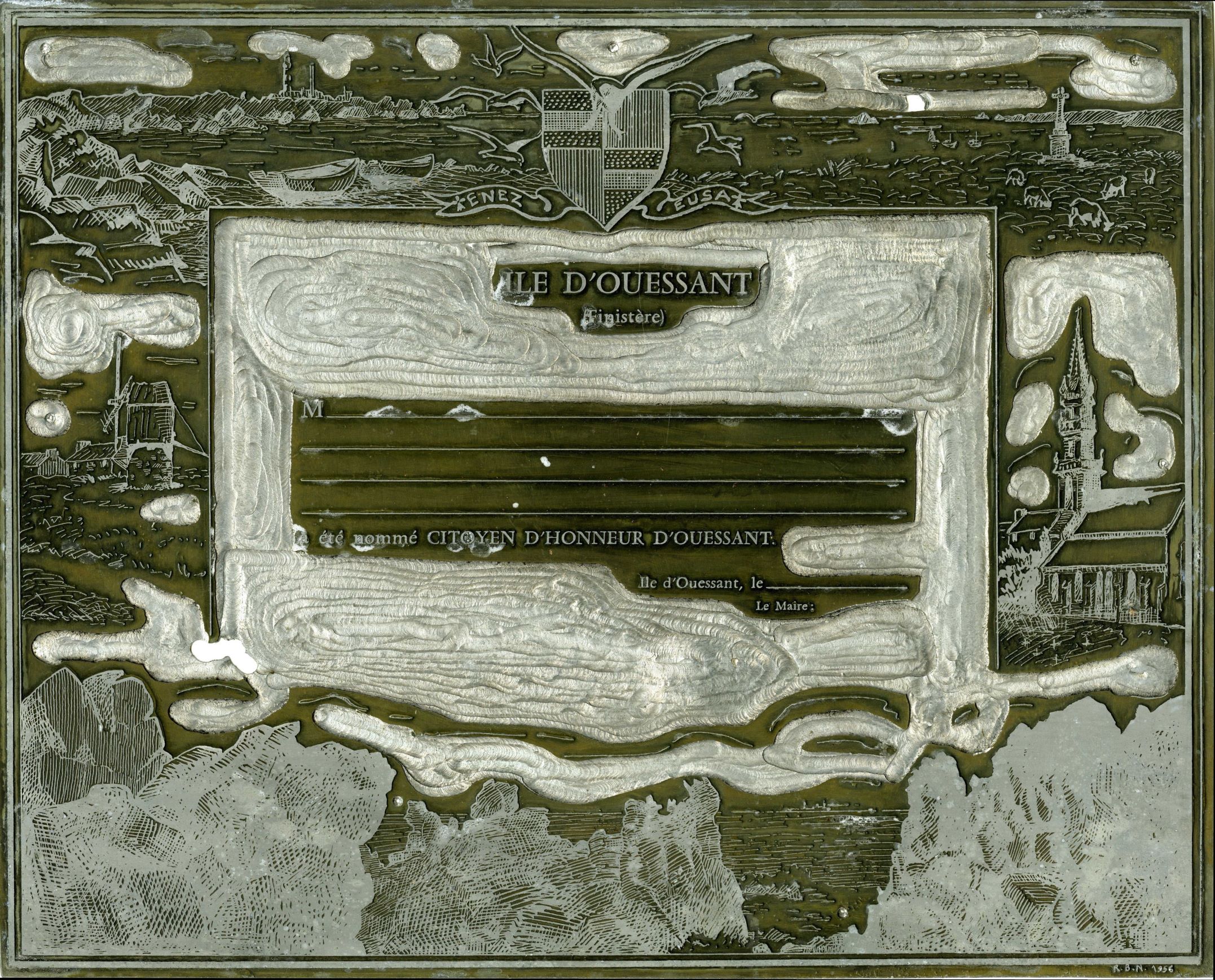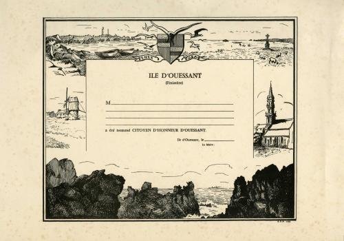 Une collecte mémorable Départ aux aurores de Quimper pour l’embarquement à Brest Certaines opérations de collecte laissent des souvenirs impérissables. En général, organiser une collecte consiste à caler un rendez-vous pour prendre en charge un ensemble de cartons préparés à l’avance par les agents communaux, par les archivistes du département ou par un prestataire. Les opérations de collecte se complexifient singulièrement quand la commune se situe sur une île : une bonne préparation logistique s’impose, mais quand s’annoncent à la fois le départ de la personne référente, un mouvement social dans les transports maritimes et un coup de vent sur l’Atlantique, tout se complique. C’est ce qui s’est produit lors de la collecte des archives de Ouessant. Initialement prévue en mai- juin 2023 (aux beaux jours) la collecte a dû être avancée au mois de mars, avant le départ de l’interlocutrice en charge des archives de la collectivité. Une logistique particulière Un premier gros tri avait été effectué sur place en octobre 2022 par l’archiviste des Archives départementales. Il fallait désormais rapatrier les archives du grenier au rez-de-chaussée, remplir les 22 cartons, rédiger le bordereau de dépôt, afin d’assurer en temps et en heure le conditionnement et le transfert au port des cartons d’archives. Deux jours sur place étaient nécessaires pour assurer l’ensemble des opérations. Le transport du retour était limité à deux palettes, à la fois pour le container maritime, et le fourgon. Tout était réservé : billets, bateau, hôtel… Patatras, un mouvement social annoncé dans le transport maritime a généré un décalage de deux jours de l’opération, mais qu’il fallait absolument organiser avant le départ de l’agent. Voilà donc les deux archivistes partis aux aurores, un matin de mars, en fourgon, de Quimper à Brest, puis en bateau de Brest à Ouessant. À l’aller, de la houle, juste ce qu’il faut pour se dire que tous les archivistes finistériens n’ont pas forcément le pied marin ! Un retour bien agité, avancé de plusieurs heures pour cause de tempête ! La méteo annoncée impliquait une belle pluie bretonne et le camion de transport n’étant pas couvert, une inquiétude taraudait donc les archivistes : éviter que les cartons ne prennent l’eau. Chaque container a donc été doublé de sacs poubelles bien étanches. Les containers ont ensuite été posés et emballés sur et par des bâches, et le tout filmé en recouvrant complétement les bâches. Un fil Twitter (Aujourd'hui X) a permis de suivre les étapes de la collecte sur les 2 jours. Étape chargement. Les palettes au camion, le camion au port, les palettes au contener 👍. On a essuyé un petit grain ouessantin...pas de chance. Archives au sec malgré tout, archivistes tout mouillés... ☔ pic.twitter.com/iubHBn7ntC — Gaela KEROUE (@GKeroue) Quelques documents atypiques et objets collectés Plaque à encrer "Diplôme de citoyen d’honneur de Ouessant" (1324 E DEPOT 125) "Diplôme de citoyen d’honneur de Ouessant" (1324 E DEPOT 125) Diplôme de la médaille commémorative décerné au maire de Ouessant par la Reine Victoria en 1897 (1324 E DEPOT 125) Comité d’entraide aux familles des marins péris en mer (1324 E DEPOT 163) : insigne en métal Comité d’entraide aux familles des marins péris en mer (1324 E DEPOT 163) : broche Un objet commémoratif de la guerre 1914-1918 : tissu brodé entourant la photo d’un marin décédé (1324 E DEPOT 89)
