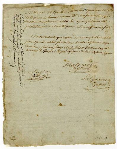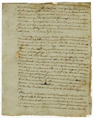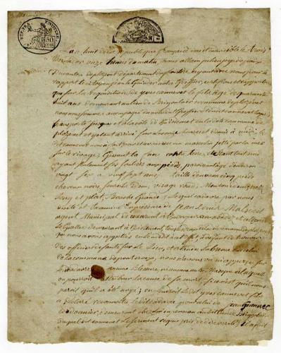 Dans la matinée du 3 thermidor an VIII (22 juillet 1800), sur une plage de la baie d’Audierne, le flot montant rejette le corps sans vie et dénudé d’un homme bientôt identifié par les riverains. Il s’agit de Jean Guennec, cordonnier et coureur de grève, âgé d’environ vingt-six à vingt-sept ans, logeant au village voisin de Brigoulaër, dans la commune de Plozévet. Alain Julien, juge de paix du canton, descendu sur les lieux afin d’examiner le défunt et recueillir d’éventuelles dépositions, conclut dans son procès-verbal à une mort accidentelle et autorise la levée du cadavre. Les témoignages convergent, Jean Guennec s’est noyé. Descendu la veille sur la grève, il s’est dépouillé de tous ses habits et les a posés sur un rocher. Chaussé de ses seuls souliers, mais coiffé de son chapeau, et aidé d’un bâton pour sonder le fond sableux afin d’assurer sa marche, il est alors entré dans la mer en direction de l’épave échouée du vaisseau de la République, Les Droits de l’Homme, un soixante-quatorze canons naufragé quelque trois ans et demi plus tôt à l’issue d’un combat naval héroïque contre les Anglais. Le premier témoin entendu, son logeur Yves Cannevet, précise « qu’il allait y chercher des effets, comme il y avait souvent été auparavant ». Marie Jacq, du village de Kerisdemet (actuellement Keristenvet), ajoute l’avoir vu tomber alors qu’il était « bien avancé dans la mer…et y étoit entré jusqu’à ses épaules…et qu’après cela elle ne le vit plus »… Procès-verbal du juge de paix Alain Julien (3 thermidor an VIII) Consultez la transcription du procès-verbal PrécédentSuivant PrécédentSuivant En savoir plus sur le naufrage du vaisseau Les Droits de l’Homme, Naufrage du vaisseau Les Droits de l’Homme, survenu le 25 nivôse an V (14 janvier 1797) sur la côte de Plozévet, le dossier du naufrage, conservé dans le fonds de la justice de paix de Plozévet 25 et 27 nivôse an V document numérisé (134 L 9) la relation du naufrage du vaisseau Les Droits de l’Homme (1841) document numérisé (1 J 924) l’ouvrage de Jakez Cornou et Bruno Jonin, L'odyssée du vaisseau “Droits de l'Homme” : l'expédition d'Irlande de 1796, éditions Dufa, 1988, 216 p. (Q8MM 268).