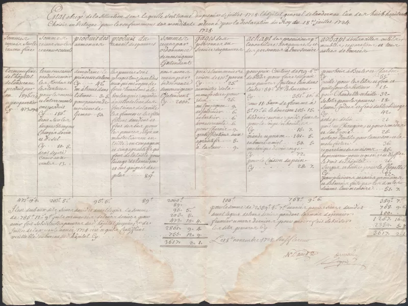 Quels documents trouver ? Le fonds de l'hôpital de Landerneau comprend des archives couvrant une période de 1526 à 2002 : archives administratives : actes de fondation, titres de propriété, registres des délibérations de la commission administrative de l'hospice, archives du bureau de bienfaisance, comptabilité, travaux, registres de population (malades, aliénés, enfants trouvés, personnel militaire) À découvrir Etat général des pauvres de l'hôpital, 1728, 3 H DEPOT F 1 Etat général des pauvres de l'hôpital, 1728, 3 H DEPOT F 1 PrécédentSuivant PrécédentSuivant Réponses au mémoire concernant les hôpitaux de la Province de Bretagne (~1750), 3 H DEPOT A 3 Réponses au mémoire concernant les hôpitaux de la Province de Bretagne (~1750), 3 H DEPOT A 3 Sources complémentaires Sources internes Série H (clergé régulier) : hôpital de Landerneau, procédures, 1657-1758, 45 H 1 Série J (archives privées) : Archives de Kernuz Hôpital de Landerneau, confirmation d'établissement et règlement, 1758, 100 J 300 Inspection des établissements de bienfaisance (Armand du Chatellier inspecteur) : Landéda, Lambézellec, Landerneau, Landivisiau, Lanmeur, Lesneven, 1839-1843, 100 J 1017 Sous-série 1 X (administration hospitalière) : Landerneau, comptabilité, 1824-1942, 1 X 38-40 Landerneau, administration, gestion (1792-1821, 1916-1924), bâtiments (1924-1926), 1 X 86 Sources externes Le portail Archives et Patrimoine(s) de la ville de Landerneau Consulter, en particulier, la série 3 Q, établissements hospitaliers. Contact : patrimoinemairie-landerneau [dot] fr Maladies et remèdes, XVème-XIXème siècles : histoire de la santé en pays de Landerneau, catalogue de l'exposition réalisée par la ville de Landerneau en 2003.