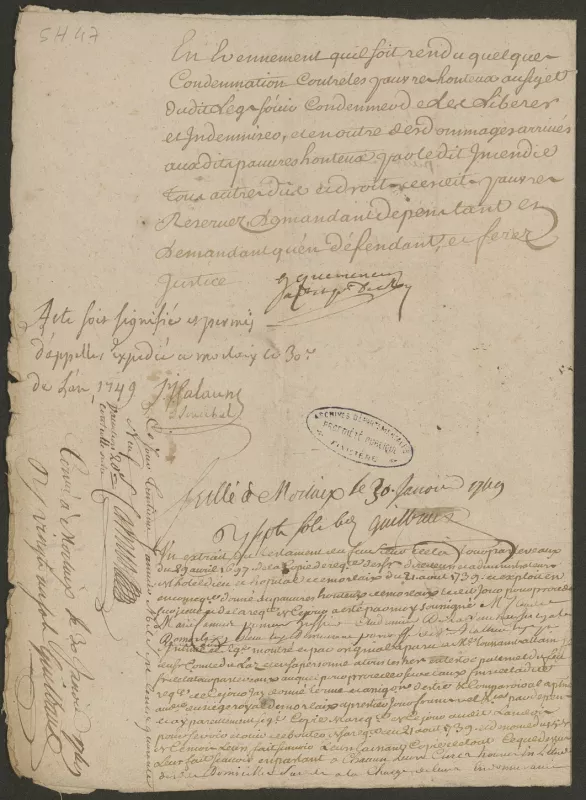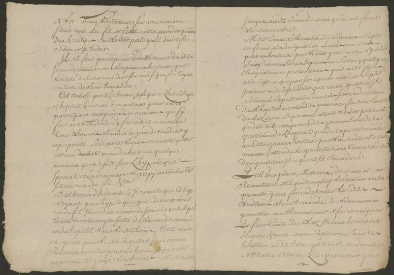 Quels documents trouver ? Le fonds de l'hôpital de Morlaix comprend des archives couvrant une période de 1408 à 2011 : archives administratives : lettres patentes du roi, titres de propriété, rentiers, registres des délibérations, répertoires des employés, comptabilité archives médicales : dossiers médicaux de patients en psychiatrie. Ces archives sont soumises aux délais prévus par les art. L. 213-1 et L. 213-2 du Code du Patrimoine. Le secret médical est couvert par un délai de 25 ans à compter du décès ou 120 ans à compter de la date de naissance (si la date de décès est inconnue). À découvrir Procédure pour venir en aide aux « pauvres honteux » de Morlaix, 1749, 47 H 5 Procédure pour venir en aide aux « pauvres honteux » de Morlaix, 1749, 47 H 5 PrécédentSuivant PrécédentSuivant Lettre patente du roy : établissement d'un hôpital général à Morlaix, 1686, 5 H DEPOT H 19 Lettre patente du roy : établissement d'un hôpital général à Morlaix, 1686, 5 H DEPOT H 19 Sources complémentaires Sources internes Série H (clergé régulier) : Hôpital de Morlaix, 1598-1790, 47 H 1-5 Sous-série 1 X (administration hospitalière) : Comptabilité, Morlaix, an XII-1920, 1 X 47-48 Dossiers administratifs, Morlaix, administration, gestion, 1792-1940, 1 X 91 et bâtiments 1811-1889, 1 X 92 Asile de Morlaix, quartier des aliénés de l’hospice, 1836-1937, 1 X 108-121 Sous-série 3 X (assistance sociale), hospice de Morlaix, notamment : Mouvements et dépenses des enfants assistés, an IV-1875, 3 X 96 Etats nominatifs trimestriels et états des dépenses des enfants placés en nourrice, an VI-1856, 3 X 100-126 Dossiers individuels des enfants assistés dépendant des hospices, 1855-1910, 3 X 203-226 Bibliothèque des archives L'école des sages-femmes de Morlaix à la fin du règne de Louis XV et sous le règne de Louis XVI [Ressource électronique] / par le Dr Henri Stofft, Société française d'histoire de la médecine, 1983 Bouestard, médecin des épidémies à Morlaix [Ressource électronique] / par le Docteur Henri Stofft, Société française d'histoire de la médecine, 1984 Source externe Service des Archives médicales du Centre hospitalier des Pays de Morlaix