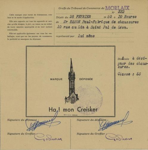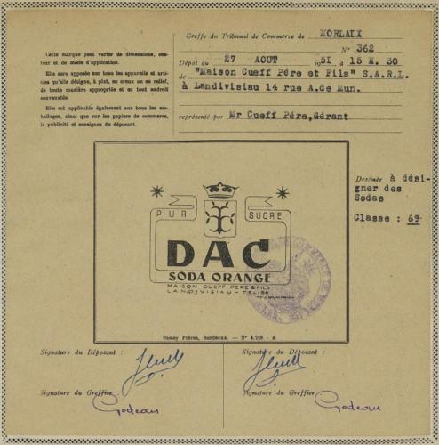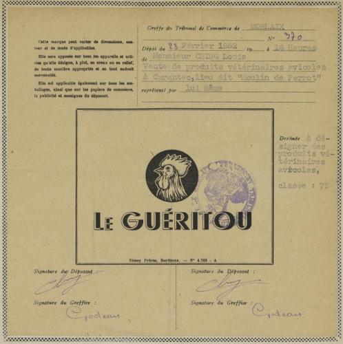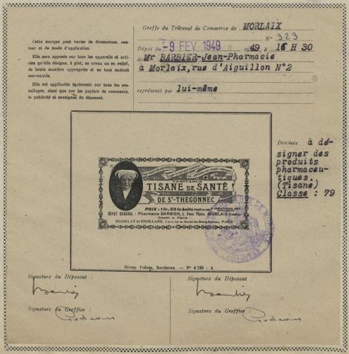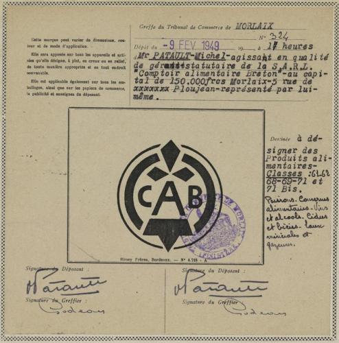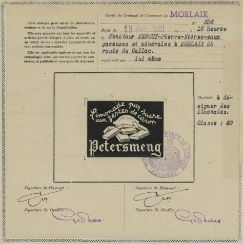 Où et comment chercher ? Ces registres sont à chercher dans les fonds des tribunaux de commerce de Morlaix (1486 W 91-92) et Brest (1719 W 234-237) Composition des registres Chaque déclaration est rédigée en double exemplaire. Elle mentionne le nom du déposant, on y appose un modèle imprimé de la marque au moyen d’un tampon, lui-même déposé, et on en décrit l’utilisation. Le résultat offre un panel de produits variés, parfois désignés très sobrement par un simple nom tamponné ou au contraire minutieusement dessiné. Extrait d'un registre des marques de fabrique, années 1950. A.d.F., 1486 W. Extrait d'un registre des marques de fabrique, années 1950. A.d.F., 1486 W. Extrait d'un registre des marques de fabrique, années 1950. A.d.F., 1486 W. Extrait d'un registre des marques de fabrique, années 1950. A.d.F., 1486 W. Extrait d'un registre des marques de fabrique, années 1950. A.d.F., 1486 W. Extrait d'un registre des marques de fabrique, années 1950. A.d.F., 1486 W. PreviousNext