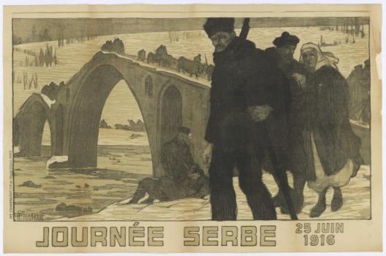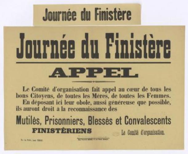 Dans l'iconothèque Vous trouverez les affiches "isolées" dans les sous-séries 12 Fi (affiches de format supérieur à 24 x 30 cm) et 13 Fi (affiches inférieures à 24 x 30 cm). Cette collection s'enrichit au gré des dons, achats, dépôts que les Archives départementales du Finistère sont susceptibles d'accueillir. Accès aux inventaires Les affiches de la Guerre 1914-1918 Elles proviennent de la sous-série 1 M (administration générale et économie du département). Ces affiches présentent les divers aspects du premier conflit mondial : l'entrée en guerre, la figure de l'ennemi, l'effort de guerre, le ravitaillement, les restrictions et les interdictions... On peut en outre y trouver les célèbres affiches consacrées aux emprunts successifs de la défense nationale et aux journées nationales (de la Serbie, du Finistère, des troupes coloniales...). Accès à l'inventaire PreviousNext Collection d'affiches Le Brun (41 Fi) Le fonds a été reçu en don en 2016. M. Le Brun a patiemment collecté tout au long de sa vie des affiches éditées dans la région de Pont-Croix, annonçant les manifestations culturelles, festives et musicales locales (fest-noz, rassemblement de véhicules anciens...). Fonds non classé, voir l'état des fonds de la série Fi Fonds de l'atelier de sérigraphie Kan-ar-Mor (46 Fi) En 2017, les Archives départementales ont reçu en don le fonds de l'atelier Kan-ar-Mor qui éditait à Douarnenez de nombreuses affiches relatives aux événements locaux. Ce fonds contient notamment la production de l'affichiste et dessinateur breton Alain Le Quernec. Fonds non classé, voir l'état des fonds de la série Fi Fonds du festival de cinéma de Douarnenez (48 Fi) Le comité d'organisation du Festival de cinéma de Douarnenez a décidé de déposer depuis 2017 les affiches éditées dans le cadre de cette manifestation. Quelques anciennes affiches du Festival étaient déjà conservées dans le fonds du Conservatoire de Locronan (215 J) et de l'atelier de sérigraphie Kan-ar-Mor (46 Fi). Fonds non classé, voir l'état des fonds de la série Fi Fonds de l'association Ti ar Vro Kemper (50 Fi) Le fonds a été reçu en don en 2017. Les affiches conservées concernent les manifestations et activités diverses organisées par la Fédération des associations culturelles du pays de Quimper entre les années 1980 et 2000. Fonds non classé, voir l'état des fonds de la série Fi