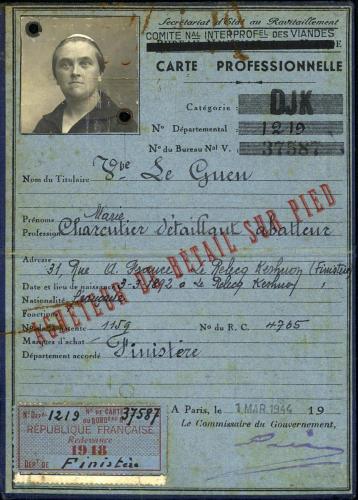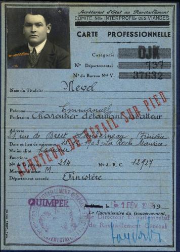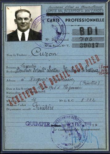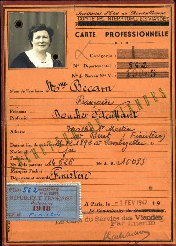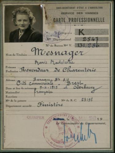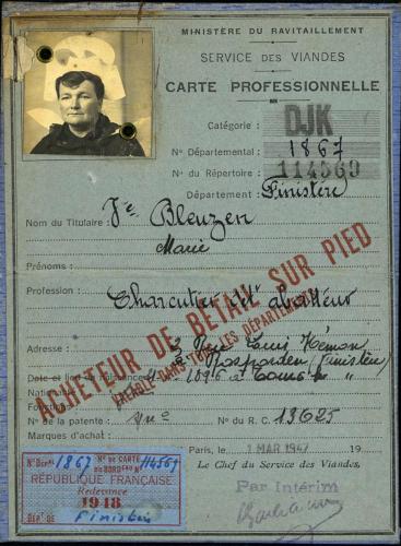 Où et comment chercher ? Ces documents ont été versés par le service économique de la Préfecture et couvre la période 1947 à 1960. Ils sont conservés sous la cote 247 W. Les dossiers sont compilés de manière chronologique. Il n'existe pas de table alphabétique. A moins de connaitre l'année de demande de la carte, la consultation directe des liasses est donc le seul moyen de retrouver le dossier vous intéressant. Composition du versement Les demandes de carte professionnelle couvrent la période 1950 à 1960. Il s'agit de dossiers composés d'une photo d'identité, d'un extrait de casier judiciaire, du formulaire de demande et d'un certificat de non collaboration. D'anciennes cartes sont parfois jointes à ces demandes. Des cartes plus anciennes, délivrées pendant la guerre et l'après-guerre, sont également conservés sous les cotes 247 W 81 à 85 parmi la correspondance administrative. Il n'y a cependant pas d'exhaustivité. Archives départementales du Finistère, 247 W Archives départementales du Finistère, 247 W Archives départementales du Finistère, 247 W Archives départementales du Finistère, 247 W Archives départementales du Finistère, 247 W Archives départementales du Finistère, 247 W Archives départementales du Finistère, 247 W Archives départementales du Finistère, 247 W Archives départementales du Finistère, 247 W PrécédentSuivant