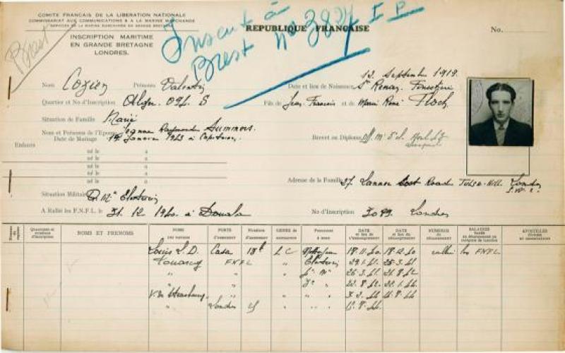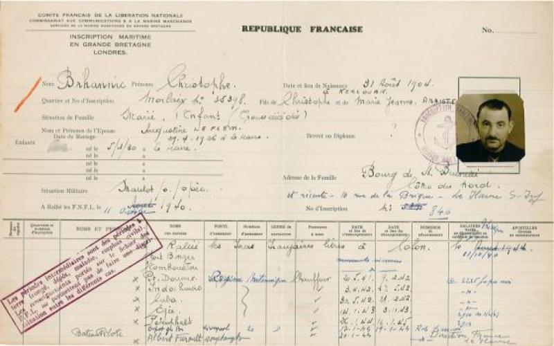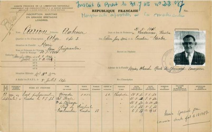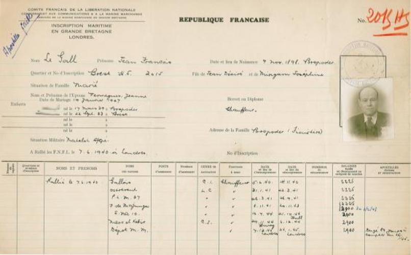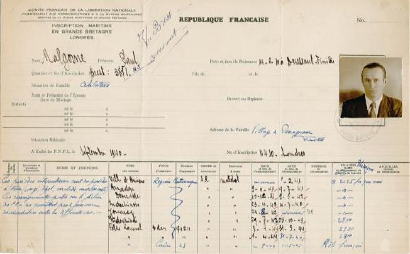 Les forces navales françaises libres s'organisent Le 1er juillet 1940, le général de Gaulle confie l'organisation et le commandement des Forces Navales Françaises Libres (FNFL) au vice-amiral Muselier, premier officier général à le rejoindre à Londres. En France, la nouvelle autorité vichyste exhorte la flotte française (civile et militaire) alors majoritairement basée à l'étranger, à accepter les conditions de l'armistice. Le 3 juillet 1940, comprenant qu'une grande partie des marins français n'est pas favorable à une poursuite de la guerre, et voulant éviter que cette flotte ne soit incorporée aux forces allemandes, W. Churchill lance l'opération "Catapult". Les unités françaises en stand-by dans les ports de Grande-Bretagne sont saisies, leurs équipages transférés dans des camps autour de Londres et Liverpool. Les bâtiments présents à Alexandrie sont immobilisés, tandis qu'à Mers El-Kebir, la flotte française est détruite par la marine britannique. Le 7 août, après de nombreuses tractations entre C. de Gaulle et W. Churchill, la charte de la France Libre est signée, reconnaissant officiellement une force française libre. Dans les jours qui suivent "Catapult", 700 marins d'État s'engagent dans la Royal Navy, 450 rejoignent les FNFL. La majorité du personnel de la Marine nationale reste fidèle à l'amiral Darlan et opte pour le retour en France. Dans les ports britanniques, ce sont près de 13000 marins qui attendent dans les camps leur rapatriement, représentant de fait un important vivier de recrutement pour la France libre. Néanmoins, ce contexte très tendu d'une France divisée sur les suites à donner au conflit, et la blessure morale résultant des évènements de Mers El-Kebir ne provoquent pas de ralliement massif aux FNFL. Bien souvent, les capitaines entrainent avec eux tout ou partie de leur équipage au moment de faire leur choix. Fin 1940 les FNFL comptent un effectif de 3300 hommes. Parmi eux, 1600 proviennent de la Marine nationale et 1026 de la marine marchande auxquels on ajoute 579 civils venus de France, et 104 transferts de la Royal Navy. En 1943, lors de la fusion entre la France libre et les Forces françaises d'Afrique du Nord, les deux forces navales s'unifient pour devenir les "Forces navales en Grande-Bretagne". Les effectifs sont désormais portés à 7000 hommes. Les fiches de l'Inscription maritime des FNFL collectées par les Archives départementales témoignent de cette diversité dans la composition des équipages, et reflètent l'éparpillement géographique de tous ces volontaires à l'été 1940. On y découvre des hommes de tous âges, marins en exercice à l'autre bout du monde ou simples civils venus de France. On y lit aussi quelques noms de cargos de renom comme l'Indochinois surnommé "le tramway de l'Atlantique" en hommage à la régularité de ses liaisons, le Fort Binger qui repousse en mai 1942 une attaque de U-Boot avec son seul canon ou encore le Félix Roussel qui la même année, débarque des renforts sous les bombardements Japonais à Singapour. Engagés FNFL du Quartier de Brest Archives départementales du Finistère, 1692 W 7 Archives départementales du Finistère, 1692 W 7 Archives départementales du Finistère, 1692 W 7 Archives départementales du Finistère, 1692 W 7 Archives départementales du Finistère, 1692 W 7 Archives départementales du Finistère, 1692 W 7 Archives départementales du Finistère, 1692 W 7 Archives départementales du Finistère, 1692 W 7 Archives départementales du Finistère, 1692 W 7 Archives départementales du Finistère, 1692 W 7 PrécédentSuivant Retourner à la frise chronologique