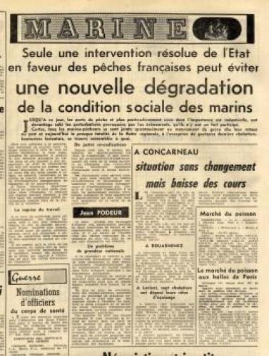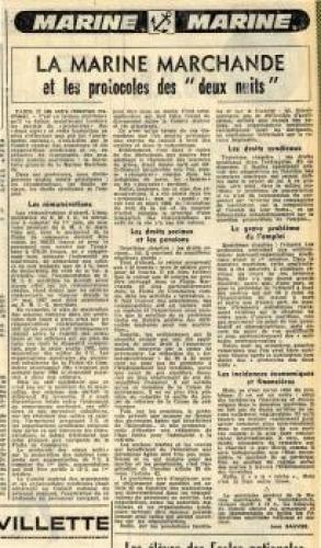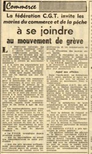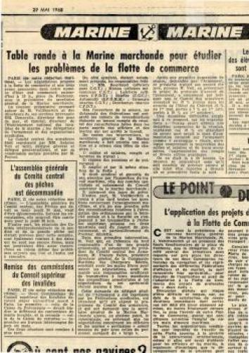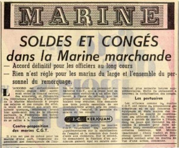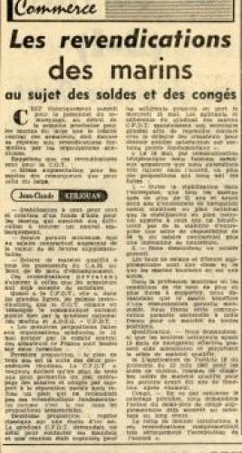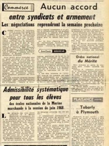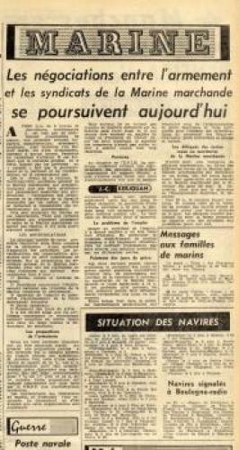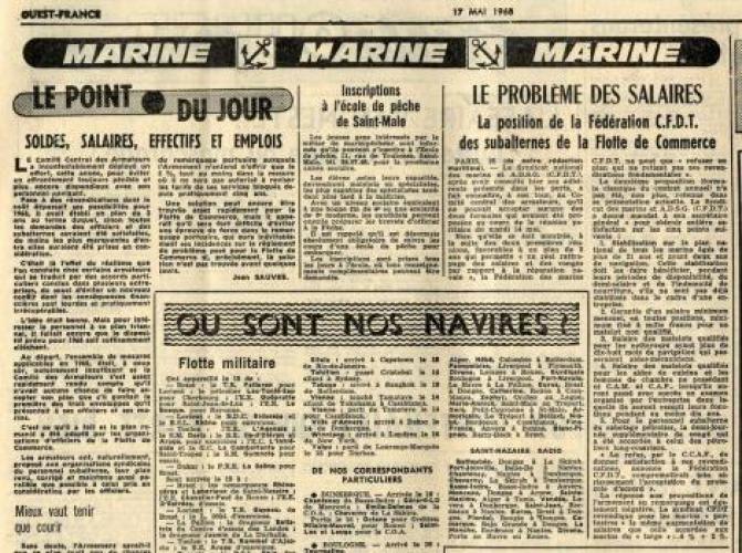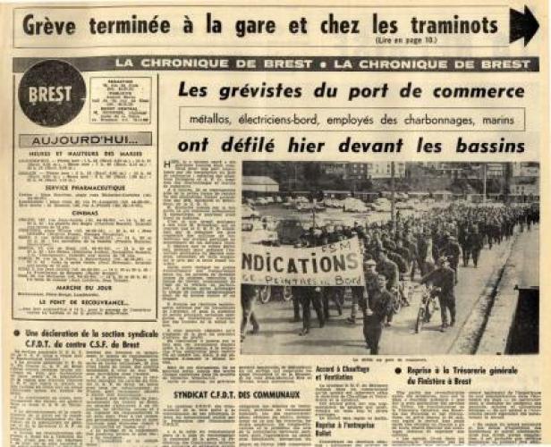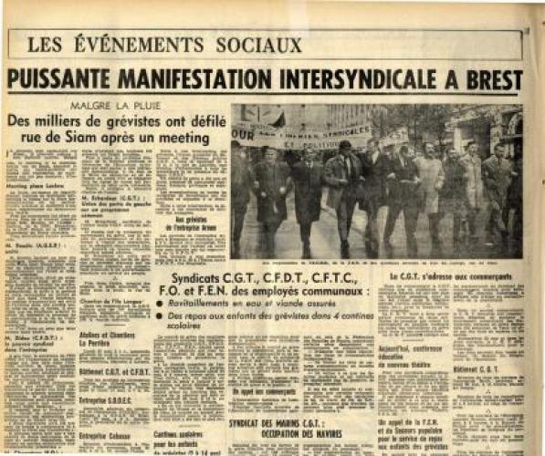 Le port de commerce de Brest est particulièrement touché, puisqu’aux marins viennent s’ajouter les pilotes, les ouvriers de l’arsenal, du chantier Dubigeon, les dockers ainsi que le personnel du bureau des douanes. Les ateliers sont désertés, les criées ne sont plus approvisionnées et les cargos immobilisés. Les négociations avec les armateurs s’ouvrent à Paris au ministère de la Marine marchande le 14 mai et portent aussi bien sur les revendications des officiers que sur sur celles du personnel d’exécution, qu’ils appartiennent à la marine marchande ou à la filière remorquage. Si les négociations entre le Comité central des armateurs et les représentants des officiers aboutissent rapidement, la situation entre armateurs et les autres corps de métiers est en revanche plus complexe. Les marins CGT et CFDT estimant les propositions armatoriales trop restreintes, le mouvement est reconduit et les revendications réafirmées : stabilisation de l'emploi et création d'un fond d'aide aux chômeurs, fixation d'un minimum salarial, instauration des congés forfaitaires, garanti des acquis sociaux et des droits syndicaux. De nouvelles négociations sont entammées dès le début du mois de juin avec pour objectif d'adapter au secteur maritime les Accords de Grenelle passés quelques jours plus tôt. Le 9 juin les ouvriers du port et le personnel naviguant défilent sur le port de commerce. Le 11 juin, après plusieurs jours de tractation, des accords sont passés entre les armateurs et les organisations syndicales de marins. Une majoration des salaires est actée en deux temps, tout d'abord de 7% avec effet immédiat, puis portée à 10% à compté du 1er octobre. En ce qui concerne les jours de congés, trois demi-journées supplémentaires par mois sont obtenues à raison d'une mise en place progressive. Côté emploi, la création d'un "Bureau central de la main d'oeuvre maritime" regroupant les représentants des armateurs et du personnel navigant doit permettre de facilité le placement des marins. Enfin le mode de calcul des pensions versées par l'Etablissement des invalides de la marine est indexé sur les majorations de salaire obtenues. Le 16 juin, satisfait par le résultat des négociation, la majorité du personnel navigant vote la reprise du travail. La situation au jour le jour Mai 1968 22 mai 1968 24 mai 1968 25 mai 1968 27 mai 1968 28 mai 1968 29 mai 1968 30 mai 1968 31 mai 1968 Juin 1968 1er juin 1968 4 juin 1968 5 juin 1968 6 juin 1968 7 juin 1968 8 juin 1968 10 juin 1968 11 juin 1968 12 juin 1968 13 juin 1968 Revue de presse Le Télégramme, 16 mai 1968. 4 MI103/226. Ouest France, 17 mai 1968. JAL 2/220. Le Télégramme, 21 mai 1968. 4 MI103/226. Le Télégramme, 29 mai 1968. 4 MI103/226. Le Télégramme, 30 mai 1968. 4 MI103/226. Le Télégramme, 31 mai 1968. 4 MI103/226. Le Télégramme, 26 mai 1968. 4 MI103/226. Ouest France 9 juin 1968. Jal 2/220. Ouest France, 28 mai 1968. JAL 2/220. Ouest France, 29 mai 1968. JAL 2/220. PrécédentSuivant Retourner à la frise chronologique