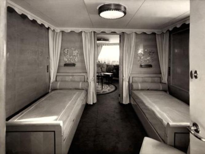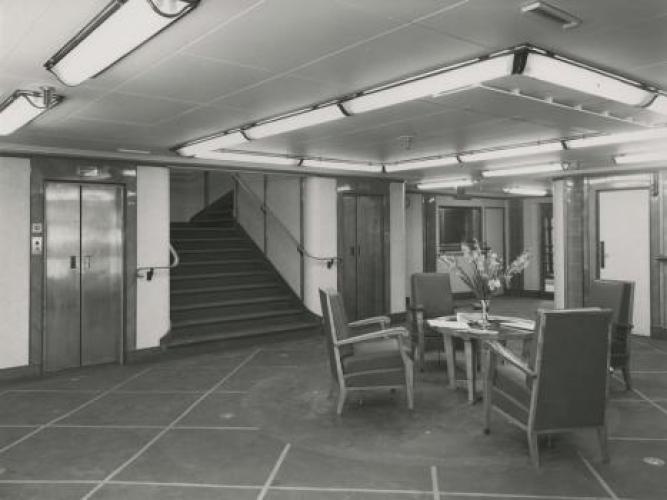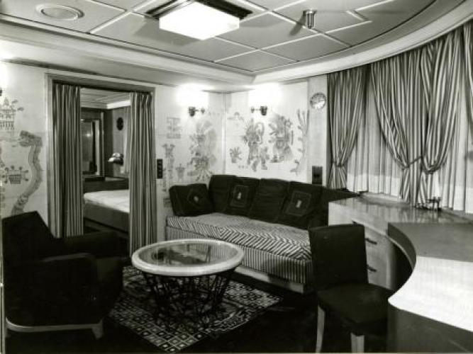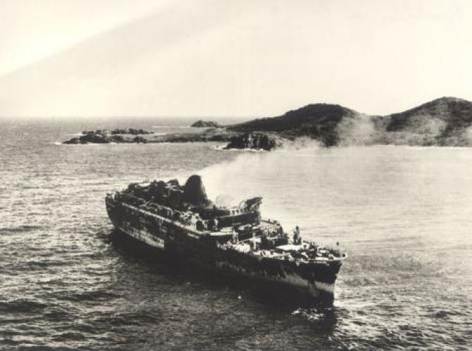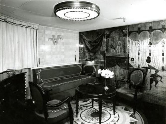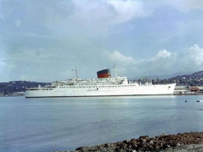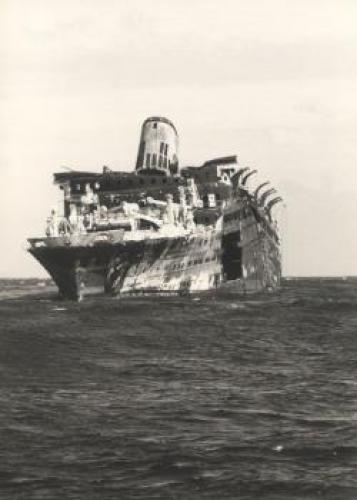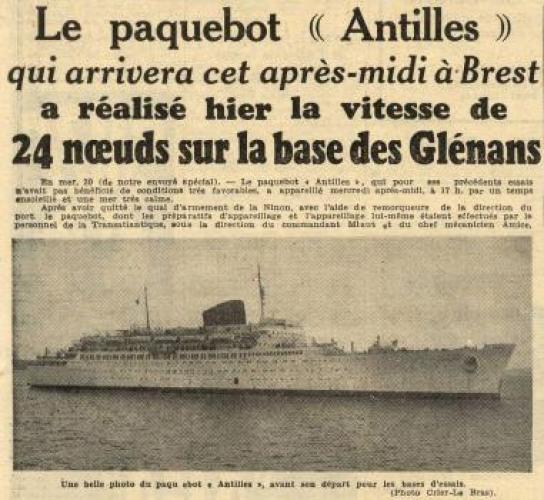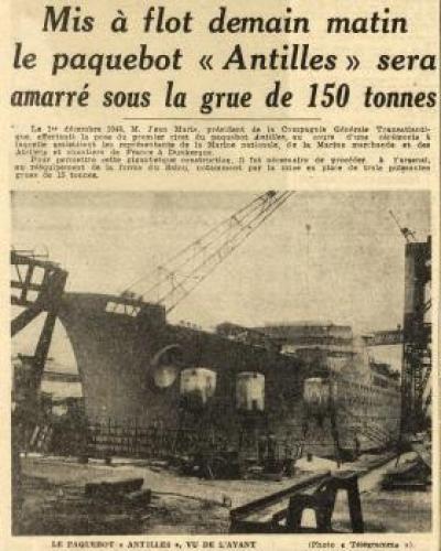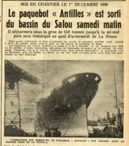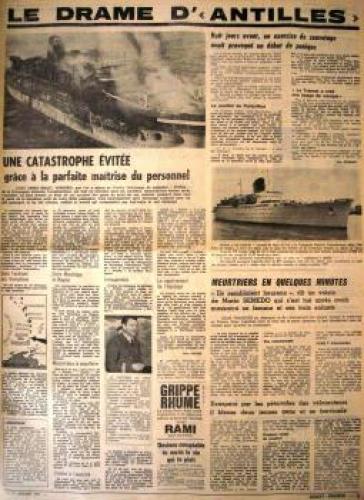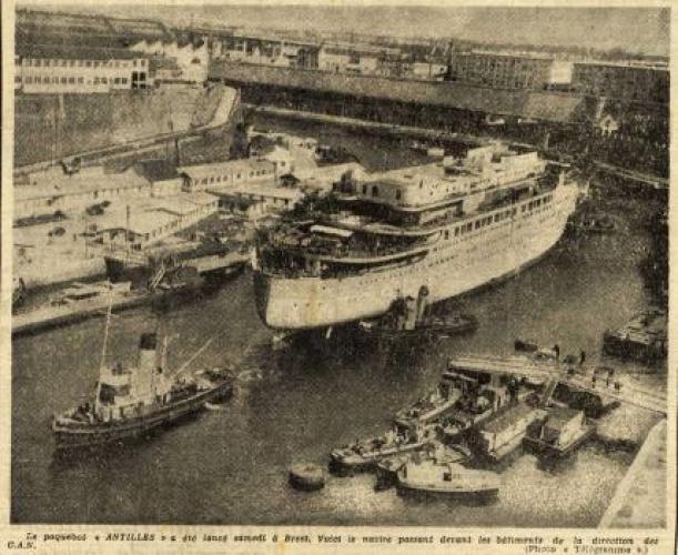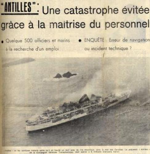 A ces disfonctionnements vient s’ajouter l’ouverture d’une enquête pour sabotage sur le système de pompe à eau sanitaire dans lequel plusieurs morceaux de ferrailles semblent avoir été placés délibérément. Le 21 septembre 1952, l’ingénieur en chef déclare : « J’ignore la gravité exacte des avaries survenues aux pompes mais l’intention de nuire n’est pas douteuse dans cette affaire. Il n’y avait aucune raison pour découper en cinq morceaux le tronçon de tuyautage supprimé. En admettant que ce travail exécuté au chalumeau ait été fait sans mauvaise intention, on pourrait tout au plus admettre un seul morceau d’acier. Pour qu’il s’en soit trouvé cinq entre les deux pompes, il a fallu qu’ils soient déposés dans le collecteur de façon délibérée ». Les interrogatoires des différents ouvriers ayant travaillé sur le site ne nous permettent pas de connaitre le fin mot de l’histoire. Malgré le retard accumulé, la première mise à l’eau s’effectue le 26 avril 1951 et les moteurs sont montés à l’été 1952. Les essais en mer sont programmés les 19, 20 et 21 février 1953. Coté équipage, Antilles embarque 400 hommes répartis comme tel : 30 officiers d’état major, 46 hommes de pont, 62 affectés au service machine et 264 au service général. Le 28 avril 1953, avec 10 mois de retard, le paquebot intègre définitivement la flotte de la « Transat ». Les premières années de navigation du paquebot sont presque exclusivement réservées à la desserte France – Antilles. Une fois arrivé à Fort-de-France, le paquebot fait escale dans plusieurs ports de la mer des Caraïbes. Occasionnellement, il est utilisé pour des croisières dans les eaux européennes et américaines. Dans les années 1960, la demande s’intensifie et les formules proposées par la Transat se divisent entre liaisons régulières et croisières. Antilles navigua près de 18 ans entre la France et les Caraïbes. Le 8 janvier 1971 alors qu’il descend vers le Venezuela, il heurte un récif non signalé devant l’Ile Moustique provocant la rupture d’une soute à mazout. L’incendie se déclare aussitôt, l’évacuation des 635 passagers est inévitable. Bien que remplacé par le paquebot De Grasse, c’est tout un symbole qui disparaît avec la perte d’Antilles, son naufrage marquant le déclin des grandes lignes régulières transatlantiques alors qu'au même moment la concurrence des lignes aériennes se faisait de plus en plus pressante. De fait, le De Grasse ne navigua que deux ans avant que la décision soit prise de fermer définitivement la ligne Le Havre - Antilles. Le paquebot Antilles (CGT 1953-1971) à quai. (© Collection French Lines. Tous droits réservés). Le paquebot Antilles (CGT 1953-1971) dans le port du Havre, le 2 mars 1953. (© Collection French Lines. Tous droits réservés). Hall du paquebot Antilles (CGT 1953-1971). Auteur : Desboutin J. (© Collection French Lines. Tous droits réservés). Salon de l'appartement Louisiane de la première classe à bord du paquebot Antilles (CGT 1953-1971). (© Collection French Lines. Tous droits réservés). Grand salon de la première classe à bord du paquebot Antilles (CGT 1953-1971). (© Collection French Lines. Tous droits réservés). Salle à manger de la première classe à bord du paquebot Antilles (CGT 1953-1971). (© Collection French Lines. Tous droits réservés). Salon de la suite Mexique de la première classe à bord du paquebot Antilles (CGT 1953- 1971). (© Collection French Lines. Tous droits réservés). Appartement de luxe Louisiane à bord du paquebot Antilles (CGT 1953-1971). Auteur : Meheux. (© Collection French Lines. Tous droits réservés). Incendie du paquebot Antilles (CGT 1953-1971) survenu le 8 janvier 1971, au large de l'île Moustique. (© Collection French Lines. Tous droits réservés). Incendie du paquebot Antilles (CGT 1953-1971) survenu le 8 janvier 1971, au large de l'île Moustique. (© Collection French Lines. Tous droits réservés). PrécédentSuivant Revue de presse Le Télégramme, 27 avril 1951. 4 mi 103/28 Le Télégramme, 1er mai 1951. 4 mi 103/28 Le Télégramme, 1er mai 1951. 4 mi 103/28 Le Télégramme, 21 février 1953. 4 mi 103/39 Ouest France, 11 janvier 1971. Jal 2/252 Ouest France, 11 janvier 1971. Jal 2/252 PrécédentSuivant Antilles aux actualités Retourner à la frise chronologique