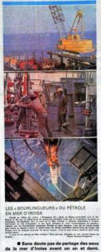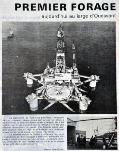 Revue de presse Le télégramme, 24-25 mai 1975. 4 MI 103/344. Le télégramme, 26 mai 1975. 4 MI 103/344 Le télégramme, 29 mai 1975. 4 MI 103/344 Le télégramme, 11 juillet 1975. 4 MI 103/345 Le télégramme, 4 juillet 1975. 4 MI 103/345 Le télégramme, 19 août 1975. 4 MI 103/345 PrécédentSuivant La pression s'intensifie en octobre 1973 avec le premier choc pétrolier. La production mondiale diminue, les cours du baril flambent. La nécessité de trouver de nouveaux gisements pour tendre à l'indépendance énergétique devient donc une priorité. La mer d'Iroise qui n'avait jusqu'à présent fait l'objet d'aucun forage devient l'objectif prioritaire des compagnies, d'autant plus que des études menées préalablement laissent espérer que la zone abriterait un riche gisement. La première autorisation de prospection est octroyée à la Société nationale des pétroles d'Aquitaine sous certaines contraintes : interdiction de l'emploi de charges explosives, aménagement des programmes de recherches de manière qu'elles ne coïncident pas avec les périodes de pêche saisonnières, interdiction de toute recherche ou exploitation à l'intérieur d'une bande de dix milles à partir de la côte. Le littoral est divisé en trois zones : Iroise, Armor et Celtique. La prospection débute en mai 1975 avec l'arrivée de la plateforme semi-submersible "Pentagone 84" dans la zone dite "Armor" sur le site de "Lizenn 1" (la sole en breton) à 60 km au nord-ouest d'Ouessant. Deux autres forages se mettent rapidement en place, "Lenkett" (le mulet) dans la zone Iroise et Brezell (le maquereau) dans la zone Armor. Rapidement les forages de prospection se multiplient. La force des courants et de la houle en mer d'Iroise constituant des contraintes importantes, ces trois premiers forages sont l'occasion d'étudier la faisabilité de l'implantation durable de plateformes dans la région. A ce titre, le rapport de l'ingénieur des mines quelques jours avant la fin de cette première campagne met en avant ces contraintes naturelles délicates : " Le forage de Lizenn 1 [...] a mis en évidence l'importance des courants au large des côtes du Finistère. Cette importance est préjudiciable au niveau du déplacement de la plate-forme et également au niveau de la bonne tenue du riser. [...] Les conditions météorologiques en mer d'Iroise risquent d'entrainer des arrêts de forage et déconnections du riser assez fréquents." Cette première expérience est peu concluante, le puis n'a atteind aucun gisement de pétrole, et techniquement l'installation de plates-formes apparait très compliquée. Cependant, au printemps 1978 deux nouveaux forages sont programmés en zone Mer Celtique : Glazenn 1 et Levneg 1. Le contexte local a évolué puisqu'en mars de la même année, les côtes finistériennes ont été souillées par la marée noire dû au naufrage de l'Amoco Cadiz. Déjà en 1976 les naufrages successifs de l'Olympic Bravery et du Böhlen faisaient poindre les dangers résultant de l'exploitation du pétrole. Si l'écologie et la sauvegarde du littoral deviennent à l'orée des années 1980 de nouvelles préocupations, cette campagne de prospection pétrolière et la menace éventuelle d'une exploitation intensive ne sont que peu relayée dans la presse locale. Cette fois encore, le pétrole espéré n'est pas au rendez-vous. Les forages s'échelonnèrent jusqu'en 1985. Aucun des sédiments prélevés sur ces différents puits ne révéla la présence de pétrole au large de la Bretagne. Cartographie des forages L'exemple d'Aberdeen à l'Est de l'Ecosse, qui s'est vue profondément transformée par la découverte de pétrole en mer du Nord Retourner à la frise chronologique