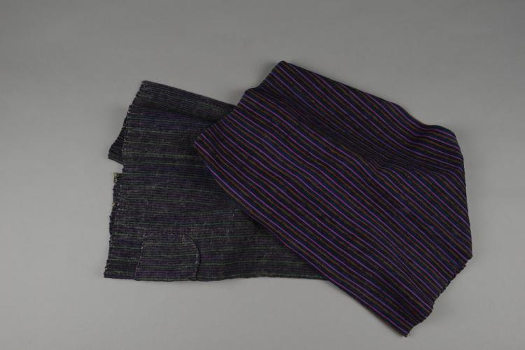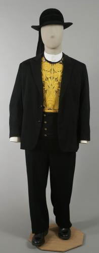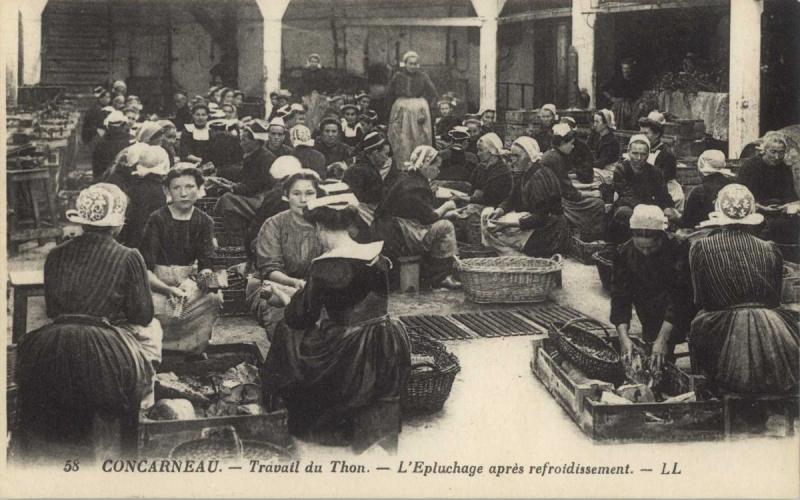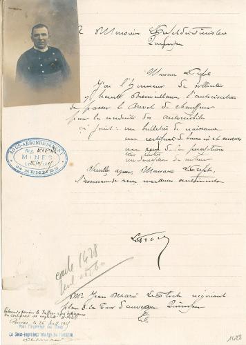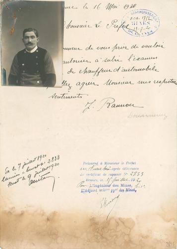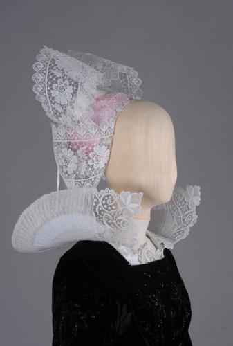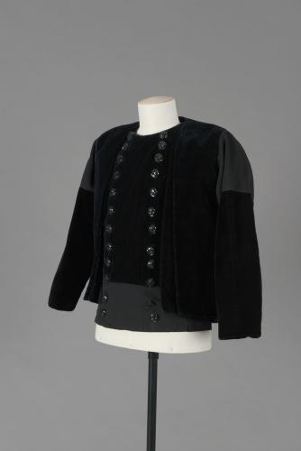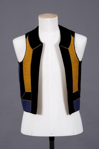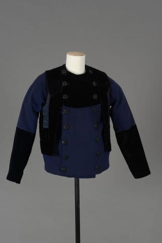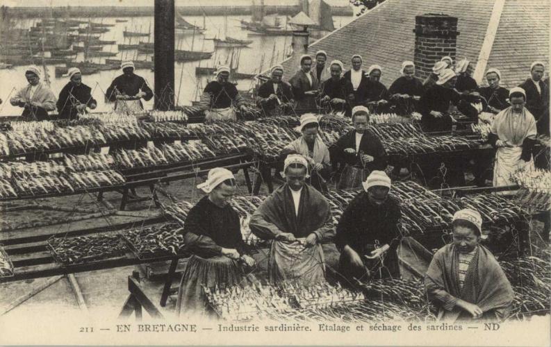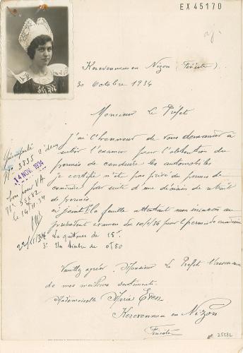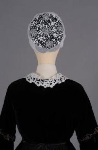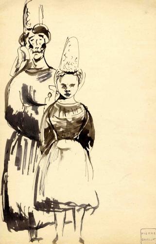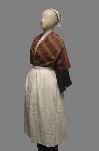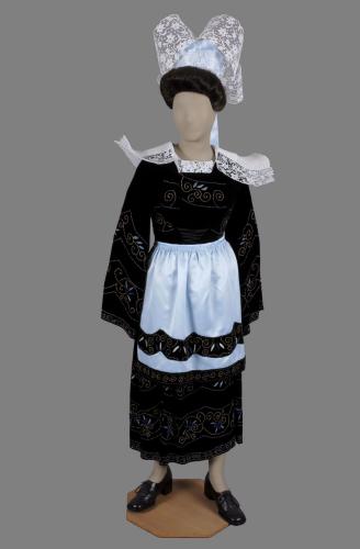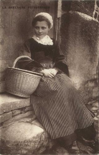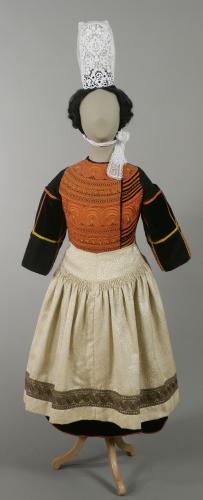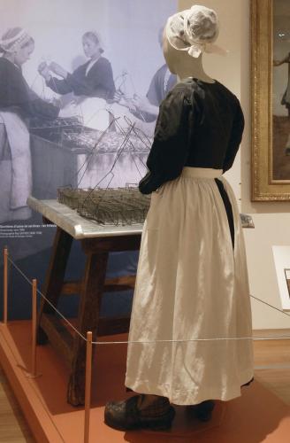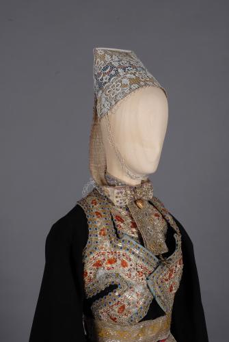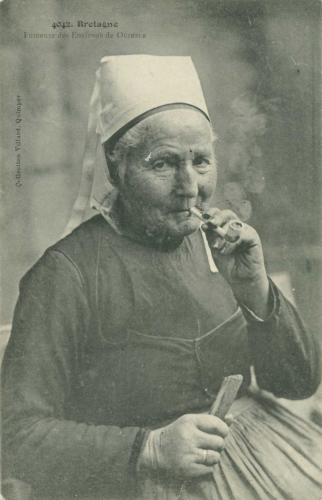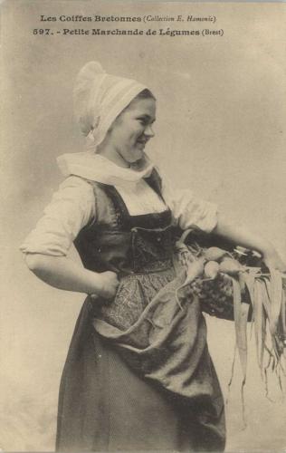 Carte postale : vendeuse de légumes Pour travailler, cette vendeuse de légumes du pays de Daoulas a endossé coiffe et costume. Mais cette photographie est une mise en scène et contient quelques erreurs : l'usage du col, de ce type de corsage et l'étoffe du tablier ne sont pas adaptés. (AD29, 2 Fi 19/902) Pièces de droguet servant à faire des tabliers (fin XIXe-début XXe siècle) Contrairement à ce que montre la carte postale, la jeune femme devrait porter un tablier de droguet (pièces ci-contre). (MDB, 2000.37.135. et 136.) Carte postale : jeune faneur Le costume masculin est, comme celui des femmes, adapté pour pouvoir travailler. Loin des broderies du dimanche et des cérémonies, le costume du pays "glazig" de ce jeune homme se compose d’un pantalon, d’une chemise de travail et d’une veste. Le "chupenn", veste portée par dessus la chemise, est normalement un élément du costume du dimanche. Cependant, lorsqu'il est usé, il arrive qu'il soit également porté aux champs. Comme la coiffe féminine, le chapeau se porte également pour travailler. (AD29, 2 Fi 20/22) Veste masculine de la région de Quimper (début XXe) La veste portée par le jeune homme représenté sur la carte postale est assez courante et l'on en trouve quelques unes dans les collections du Musée breton. (MDB, 1954.209.2.) Coiffe de Carhaix (1930-1950) Type de coiffe portée par la jeune fille de la carte postale ci-contre. (MDB, 1991.25.5.) Carte postale : jeune femme de Carhaix Bien que de velours, les vêtements portés par cette jeune femme sont sombres et sobres. La présence du panier semble indiquer qu'elle se rend au marché. D'ailleurs, sans être de cérémonie, ses vêtements sont soignés comme la coiffe et la collerette,qui, elles aussi, sont traditionnelles du pays de Carhaix. (AD29, 2 Fi 24/70) Carte postale : vieille femme qui fume la pipe Cette vieille femme, sobrement habillée, fume la pipe. Ce type de photographie, montrant une femme âgée avec une pipe, est courant. Comme en témoigne sa coiffe ''borledenn'' à l'ancienne, il s’agit ici d’une femme de la région de Quimper. Elle porte des vêtements de tous les jours, sans faste ; la collerette plissée ajoute un peu d'élégance. (AD29, 2 Fi 303/262) Coiffe ''borledenn" du Juch (fin XIXe) Bien que cette coiffe soit utilisée pour les cérémonies, elle ressemble beaucoup, dans sa forme, à celle que porte la fumeuse ci-contre. (MDB, 1995.15.4.) Gilet et veste ''giz fouen'', vers 1910 Type de vêtements que peut porter Jean-Marie Le Floc'h sur sa photographie d'identité. (MDB, 2009.0.340. et 2009.0.341.) Photographie sur document administratif concernant Jean-Marie Le Floch, 1915 Le costume breton pouvait se porter partout, même pour prendre une photo d’identité. On en retrouve dans les dossiers de demande de candidature au certificat de capacité donnant droit de conduire un véhicule. Voici la photographie d'un homme sans doute originaire du pays "giz fouen". (AD29, 12 S 9) Gilet et veste ''glazig", vers 1900 Ensemble qui aurait pu être porté par Pierre Huiban. (MDB, 2013.10.1.) Photographie sur document administratif concernant Pierre Huiban, 1920 Sur cette photographie, le gilet de Pierre Huiban n'est pas boutonné du bon côté : cela signifie que, soit le plastron du dessous est venu recouvrir celui du dessus trop usé, soit la photographie est à l'envers. (AD29, 12 S 15) Chapeau ''giz fouen'' avec boucle à la mode ''glazig'', vers 1905 Type de chapeau pouvant compléter le costume porté par Joseph Rannou (MDB, 2009.0.337.) Photographie sur document administratif concernant Joseph Rannou, 1920 (AD29, 12 S 17) Costume bigouden de mariage du tailleur Pierre Goenvic (1911) Comme sur la photographie de Corentin Ronarc'h, le plastron brodé est ici accompagné d'une veste. (MDB, 1965.3.) Photographie sur document administratif concernant Corentin Ronarc’h, 1920 Le plastron de Corentin Ronarc’h nous indique son origine bigoudène. Remarquons que le plastron brodé peut se porter avec une veste citadine, elle aussi réalisée par le tailleur de la ville. (AD29, 12 S 18) Photographie sur document administratif concernant Marie Even, 1934 Dans les premières demandes de certificat de capacité, les femmes ne sont que très peu présentes, mais elles deviennent de plus en plus nombreuses durant l’entre-deux-guerres. Marie Even porte ici un costume de cérémonie, reconnaissable à son décor perlé. Sa coiffe et son col sont dépareillés. Ses cheveux crantés et son collier sont typiques des années 1930. (AD29, 12 S 21) Photographie : Femme du pays bigouden Datée des années 1925, cette photographie témoigne du fait que, si l’on peut porter la coiffe tous les jours, il paraît difficile d’effectuer les travaux quotidiens dans le lourd costume du dimanche. On a alors recours à des vêtements de travail plus simples et avec lesquels on est à son aise. Cette femme, en vêtements de travail dont la jupe est ornée de galons de velours, porte une très belle coiffe en organdi. (AD29, 16 Fi 119) Costume de mariage de Fouesnant (1937) La coiffe de Fouesnant compte quatre ailes, contrairement à celle portée par Marie Even, de Nizon. (MDB, 1995.4.1.) Coiffe bigoudène démontée, vers 1925 (MDB, 1996.14.4.) Dessin de Pierre Cavellat : Bigoudène au tribunal Le fonds Cavellat est composé des dossiers du juge Pierre Cavellat (1901-1995), de Quimper. Y figure nombre de dessins réalisés par le juge illustrant des scènes de tribunal, des caricatures d’hommes de loi, des militaires, des accusés et des plaignants… Parmi eux, certains sont en costume. Pierre Cavellat a immortalisé des scènes réelles ou imaginaires, toujours inspirées de ce qu’il avait vu. (AD29, 18 Fi 70) Costume bigouden avec un tablier bleuté (années 1930) (MDB, 1990.77.2.3.) Dessin de Pierre Cavellat : femme en costume « Giz Fouen » au tribunal La femme de la région de Rosporden dessinée par Pierre Cavellat porte un col de 