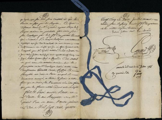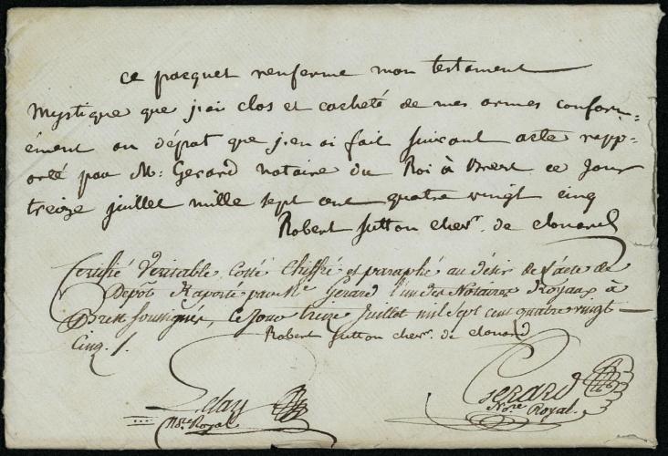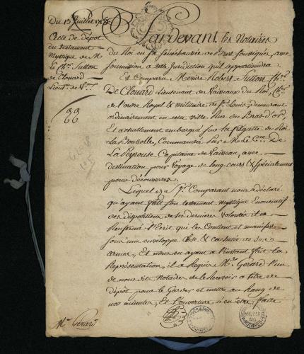 Issu d’une famille jacobite ayant émigré en France, Robert Sutton, chevalier de Clonard, est né à Wexford (Irlande), le 11 août 1751. Fils de Thomas Sutton, Comte de Clonard, négociant installé dans le Sud-Ouest, et de Phillis Masterson de Casteltown. Aux âpres joutes du commerce auxquelles s’adonna son père, Robert Sutton préféra le grand large et le pont des vaisseaux, ceux de la Compagnie des Indes. Ses voyages, de la Baltique à l’océan indien en passant par les Amériques, lui permirent d’engranger une solide expérience de marin. En 1775, sous les ordres d’un certain Jean-François De Galaup, Comte de La Pérouse, (déjà !) il participa à la libération du comptoir de Mahé. Sa conduite glorieuse incita le roi de France à lui octroyer une rente de 300 livres, mais le jeune officier préféra la croix de Saint-Louis ; la guerre d’indépendance américaine lui apporta celle de Cincinnatus. En 1784, à Brest, il travailla à l’armement de la « Boussole ». La grande expédition vers le Pacifique voulue par Louis XVI et prévue pour durer plusieurs années, était en cours de préparation. En 1785, pour le seconder sur la « Boussole », le Comte de La Pérouse choisit assez naturellement l’officier jacobite, un homme qu’il connaissait bien et sur lequel il ne tarissait pas d’éloges. Le commandement de « L’Astrolabe » fut confié au breton Paul-Antoine Fleuriot Vicomte De Langle. Le premier août 1785, les deux navires sortirent du goulet de Brest. Aux équipages se mêlaient de nombreux savants, des astronomes comme Joseph Lepaute d’Agelet et Louis Monge, des botanistes comme Joseph De la Martinière et Jean-Nicolas Collignon, des dessinateurs comme Gaspard Duche de Vancy et Jean-Louis-Robert Prevost. En décembre 1787, l’expédition connut un premier drame avec la mort de Fleuriot de Langle, attaqué par des indigènes alors qu’il venait s’approvisionner en eau sur l’ile de Tutuila (Samoa). Le chevalier de Monti, second de Fleuriot prit alors le commandement de « L’Astrolabe ». Les deux navires arrivèrent à « Botany Bay », l’actuelle Sydney australienne, le 26 Janvier 1788. Robert Sutton y remplaça De Monti aux commandes de « L’Astrolabe ». Quelques mois plus tard l’expédition connaîtra une fin tragique en se brisant sur les récifs de Vanikoro (îles Santa-Cruz, Salomon). Dès 1791, D’Entrecasteaux lança des recherches mais il faudra attendre l’année 1826 et plusieurs décennies de rumeurs plus ou moins folles avant que l’irlandais Peter Dillon ne trouve les premières traces. Suivront de nombreuses expéditions. On retrouvera sur le site dit de la « Faille », une fourchette portant les armoiries de Robert Sutton avec sa devise : « Fide et Fortitudine » : Loyauté et Courage. Texte par Henri Chalm, lecteur aux Archives départementales du Finistère. Le parcours de l'expédition La Pérouse Un testament mystique Pour un marin, pour un officier surtout, rédiger un testament était chose assez courante. Si le vaisseau arrivait à bon port, le document devenait obsolète. On trouve parfois, dans certains fonds notariaux, des testaments non-décachetés, preuve de la survie de leurs auteurs. L’expédition du Comte de La Pérouse fut déclarée officiellement perdue le 14 février 1791. On peut donc légitimement penser que le testament de Robert Sutton fut ouvert peu de temps après cette date. Laissons à ceux qui ont une profonde connaissance du sujet le soin de faire parler ce document. Il ne contient aucune révélation fracassante, mais conforte l’image d’un homme connu pour préférer l’honneur à la richesse. Le chevalier De Clonard était certes l’héritier d’une grande fortune mais, fidèle à sa réputation, il traversa la vie avec bien peu de choses : quelques malles, quelques actions de la Compagnie des Indes, quelques paniers de vin de Bordeaux et, du côté de Paris, un dépôt de fourrures, des habits de velours et une épée d’acier. C’est ce que révèle son testament mystique qui dormait dans le fonds de Maître Gerard, notaire royal à Brest, depuis près de 230 ans ; nous l’avons réveillé. Testament mystique de Robert Sutton déposé à l'étude de Maître Gérard, notaire royal à Brest, en 1785. Archives départementales du Finistère, 4 E 18/37 PrécédentSuivant