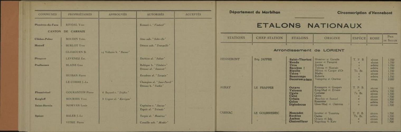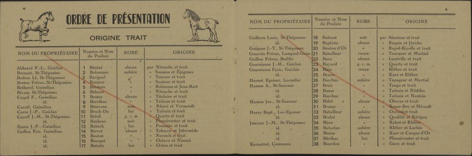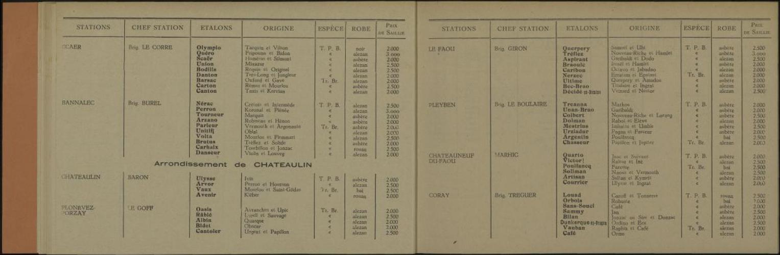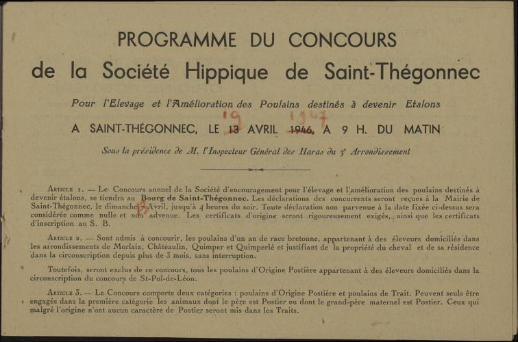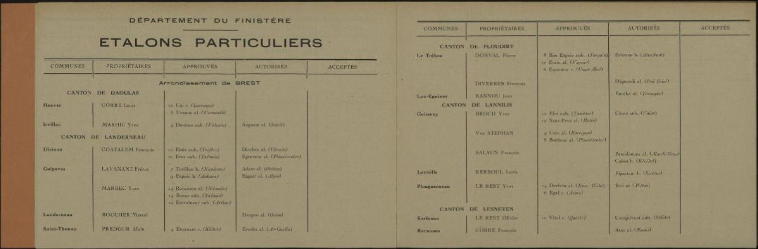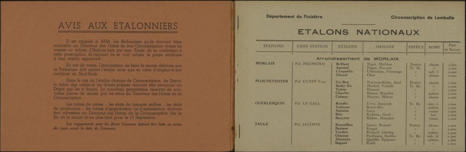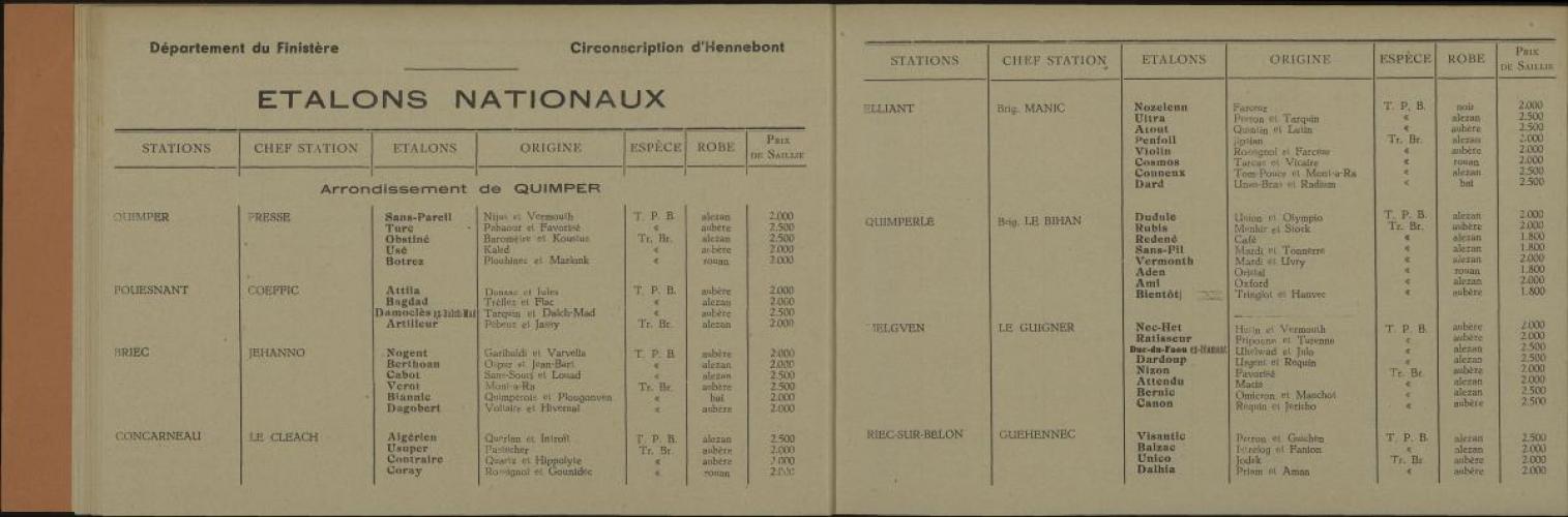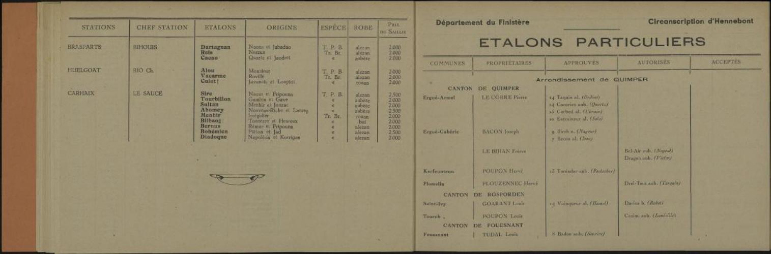 Procès-verbal d’un concours de juments à Châteauneuf-du-Faou en 1948 cote : 245 W 4 Le terme poulinière suitée signifie que la jument est accompagnée de son petit Affiche pour le concours d'étalons de Landerneau en 1952 cote : 245 W 8 Le concours de Landerneau était l'un des événements annuels les plus attendus Procès-verbal d’un concours de juments à Châteauneuf-du-Faou en 1948 cote: 245 W 4 PrécédentSuivant PrécédentSuivant Catalogue du concours de la société hippique de Saint-Thégonnec 1946 (245 W 3) Sur la page de couverture, le cheval de gauche est un trait breton celui de droite un postier breton. PrécédentSuivant PrécédentSuivant L’État, par l’intermédiaire de la Préfecture et des Haras de Lamballe pour le Finistère Nord et d’Hennebont pour le Finistère Sud, contrôle la reproduction des chevaux. Les Haras achètent des étalons appelés étalons nationaux. Les autre étalons, appelés étalons particuliers, doivent être validés par une commission spéciale pour pouvoir se reproduire. La mise en œuvre de ce système appelé "monte publique" peut être étudiée dans les dossiers 245 W 17 à 245 W 20. Recueil des étalons bretons de 1951 (245 W 18) Ne sont présentées que les pages concernant les étalons du Finistère, mais le recueil regroupe tous les étalons de la race bretonne admis à la monte. PrécédentSuivant PrécédentSuivant Bibliographie Sur l'élevage du cheval breton Après-guerre : Bécot Y-L, « L’élevage des chevaux en Bretagne », L’Association bretonne, t. 56, 1948, p. 139-173, PER 134 À consulter également Fonds du Haras national de Lamballe - 1065 W 1-290 ; 1700 W 1-727. Archives départementales des Côtes d'Armor. Le Finistère Nord dépendait du ressort géographique du Haras de Lamballe.