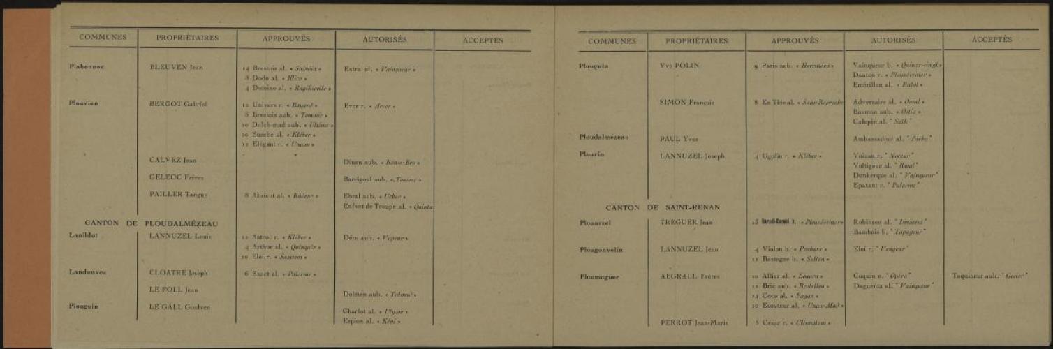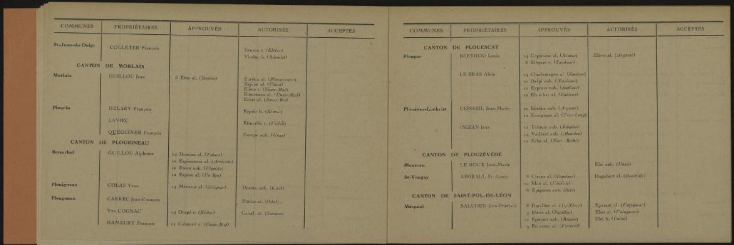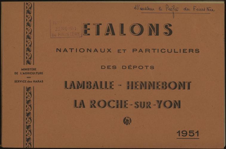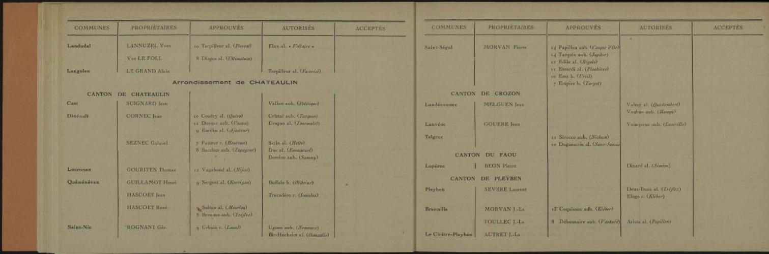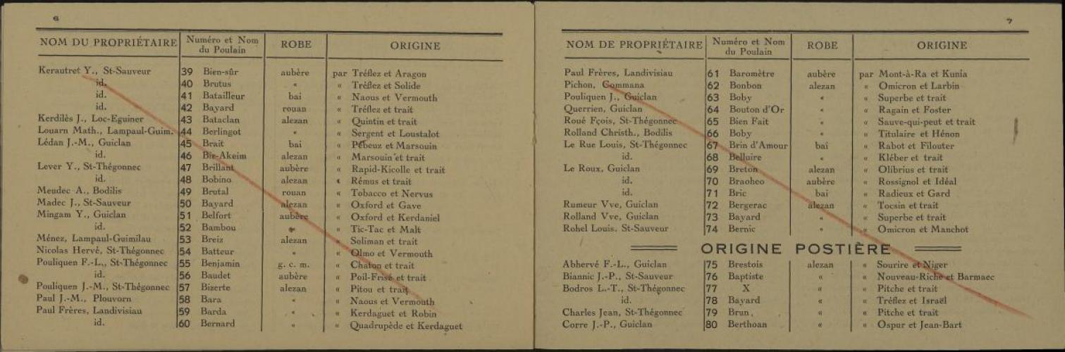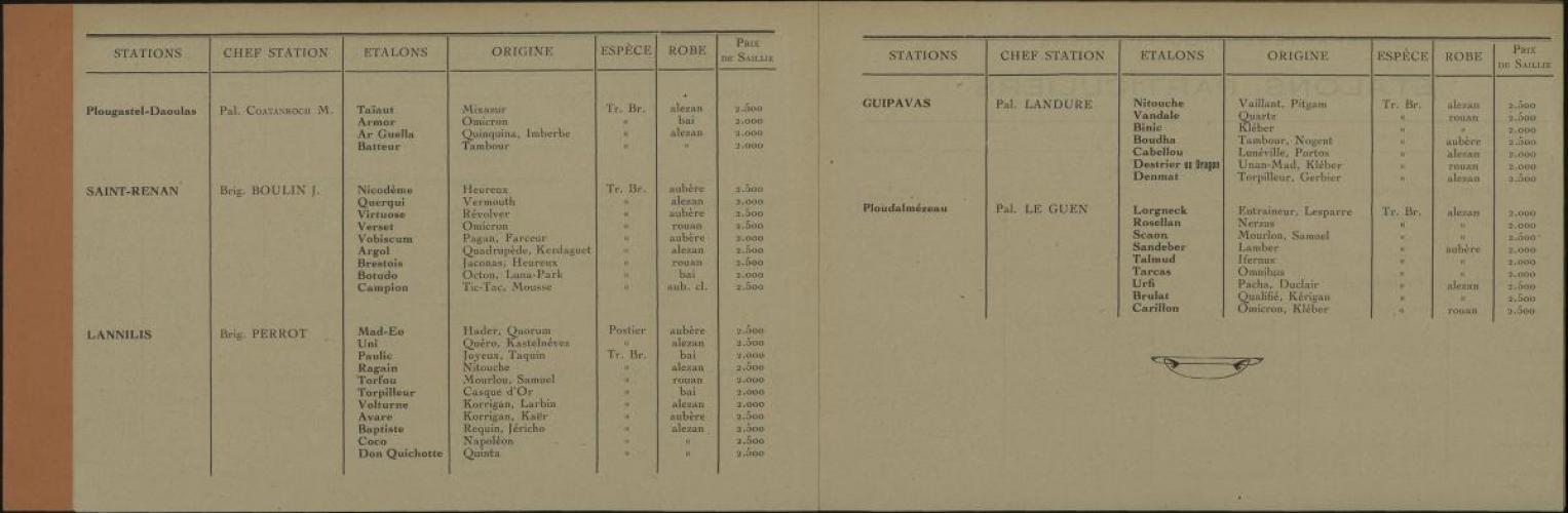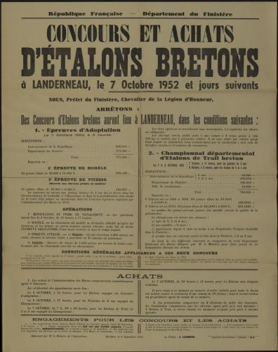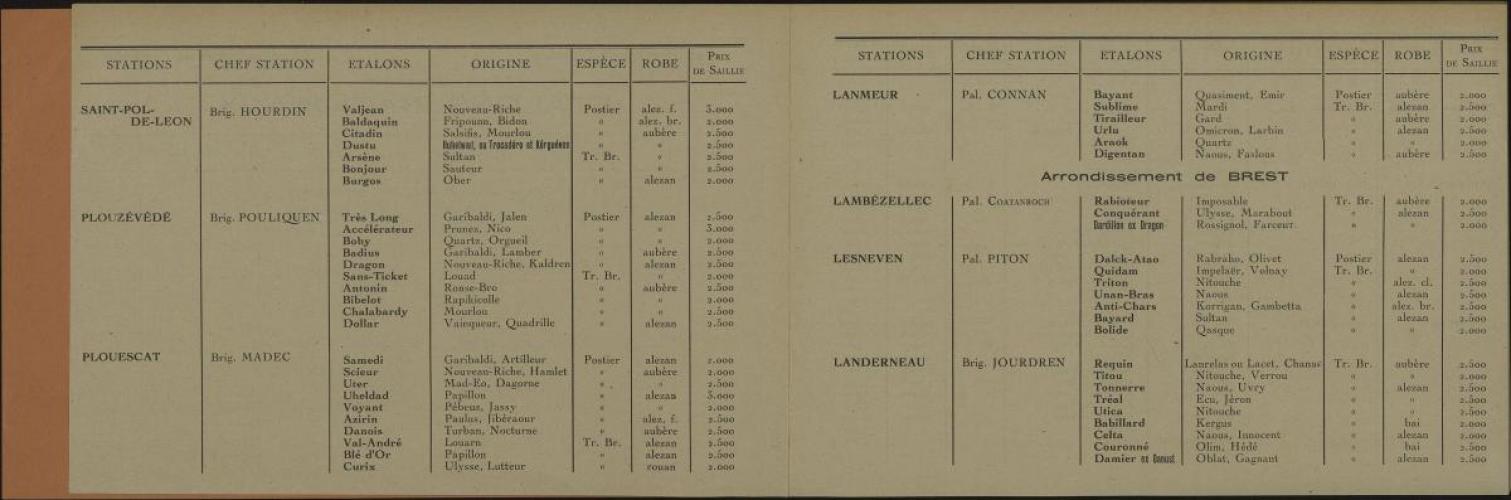 Procès-verbal d’un concours de juments à Châteauneuf-du-Faou en 1948 cote : 245 W 4 Le terme poulinière suitée signifie que la jument est accompagnée de son petit Affiche pour le concours d'étalons de Landerneau en 1952 cote : 245 W 8 Le concours de Landerneau était l'un des événements annuels les plus attendus Procès-verbal d’un concours de juments à Châteauneuf-du-Faou en 1948 cote: 245 W 4 PrécédentSuivant PrécédentSuivant Catalogue du concours de la société hippique de Saint-Thégonnec 1946 (245 W 3) Sur la page de couverture, le cheval de gauche est un trait breton celui de droite un postier breton. PrécédentSuivant PrécédentSuivant L’État, par l’intermédiaire de la Préfecture et des Haras de Lamballe pour le Finistère Nord et d’Hennebont pour le Finistère Sud, contrôle la reproduction des chevaux. Les Haras achètent des étalons appelés étalons nationaux. Les autre étalons, appelés étalons particuliers, doivent être validés par une commission spéciale pour pouvoir se reproduire. La mise en œuvre de ce système appelé "monte publique" peut être étudiée dans les dossiers 245 W 17 à 245 W 20. Recueil des étalons bretons de 1951 (245 W 18) Ne sont présentées que les pages concernant les étalons du Finistère, mais le recueil regroupe tous les étalons de la race bretonne admis à la monte. PrécédentSuivant PrécédentSuivant Bibliographie Sur l'élevage du cheval breton Après-guerre : Bécot Y-L, « L’élevage des chevaux en Bretagne », L’Association bretonne, t. 56, 1948, p. 139-173, PER 134 À consulter également Fonds du Haras national de Lamballe - 1065 W 1-290 ; 1700 W 1-727. Archives départementales des Côtes d'Armor. Le Finistère Nord dépendait du ressort géographique du Haras de Lamballe.