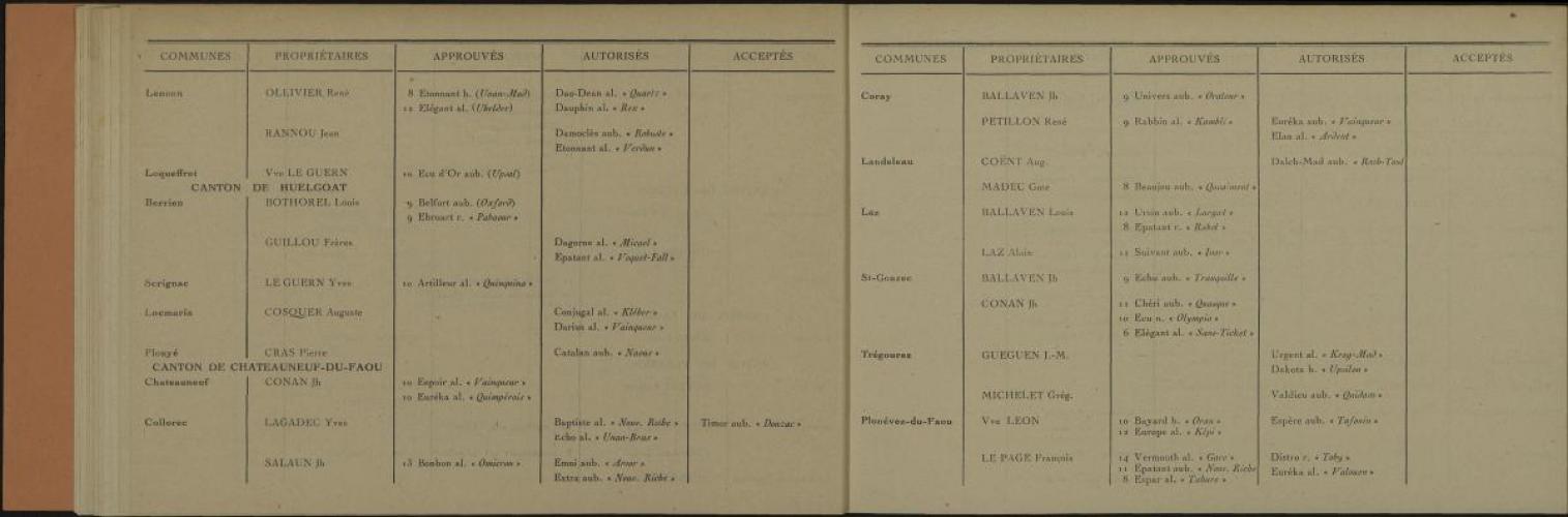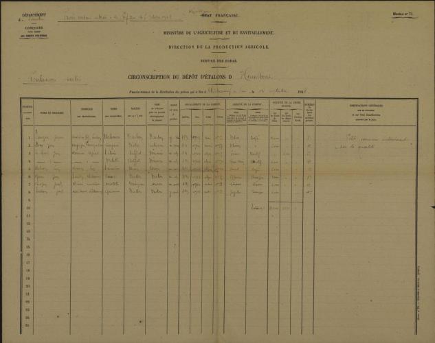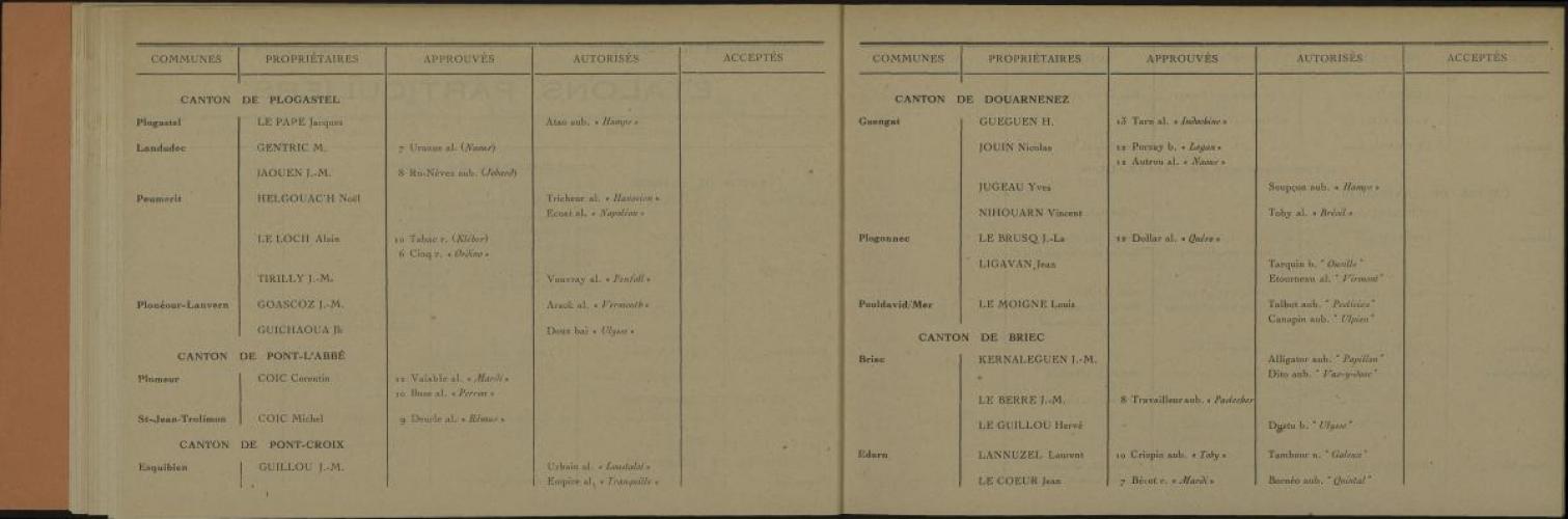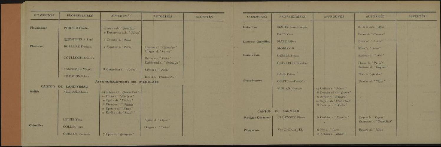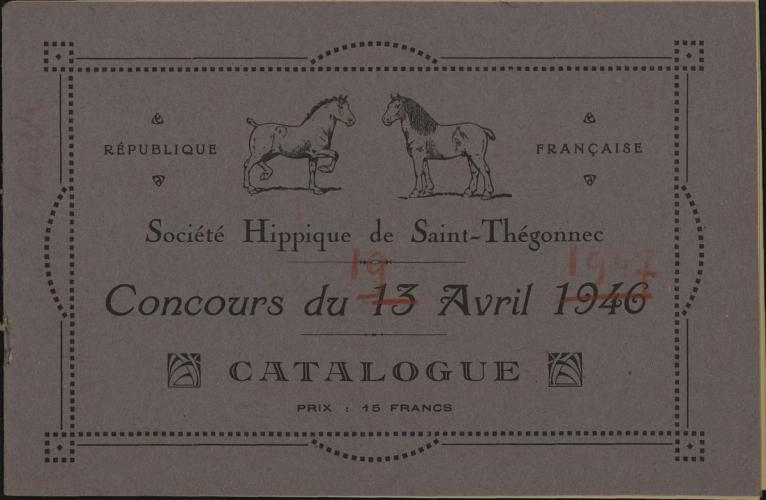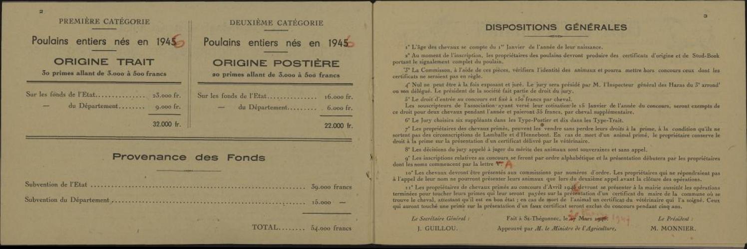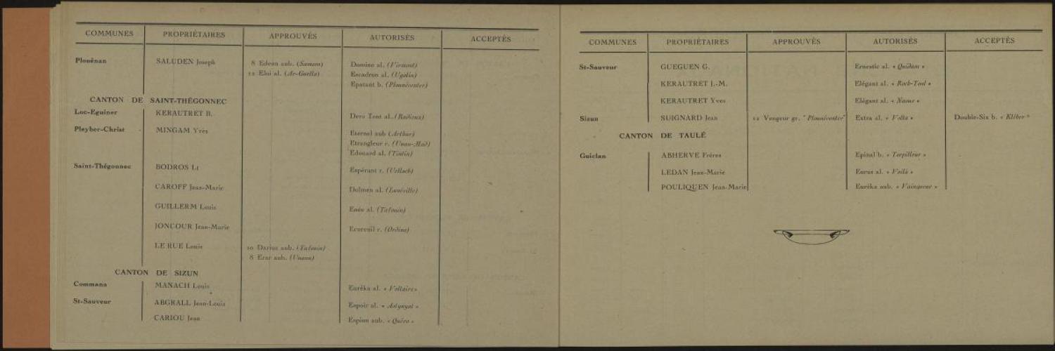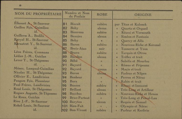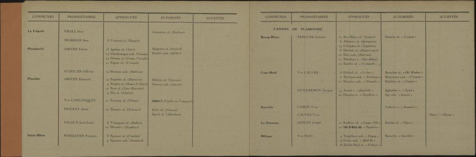 Procès-verbal d’un concours de juments à Châteauneuf-du-Faou en 1948 cote : 245 W 4 Le terme poulinière suitée signifie que la jument est accompagnée de son petit Affiche pour le concours d'étalons de Landerneau en 1952 cote : 245 W 8 Le concours de Landerneau était l'un des événements annuels les plus attendus Procès-verbal d’un concours de juments à Châteauneuf-du-Faou en 1948 cote: 245 W 4 PrécédentSuivant PrécédentSuivant Catalogue du concours de la société hippique de Saint-Thégonnec 1946 (245 W 3) Sur la page de couverture, le cheval de gauche est un trait breton celui de droite un postier breton. PrécédentSuivant PrécédentSuivant L’État, par l’intermédiaire de la Préfecture et des Haras de Lamballe pour le Finistère Nord et d’Hennebont pour le Finistère Sud, contrôle la reproduction des chevaux. Les Haras achètent des étalons appelés étalons nationaux. Les autre étalons, appelés étalons particuliers, doivent être validés par une commission spéciale pour pouvoir se reproduire. La mise en œuvre de ce système appelé "monte publique" peut être étudiée dans les dossiers 245 W 17 à 245 W 20. Recueil des étalons bretons de 1951 (245 W 18) Ne sont présentées que les pages concernant les étalons du Finistère, mais le recueil regroupe tous les étalons de la race bretonne admis à la monte. PrécédentSuivant PrécédentSuivant Bibliographie Sur l'élevage du cheval breton Après-guerre : Bécot Y-L, « L’élevage des chevaux en Bretagne », L’Association bretonne, t. 56, 1948, p. 139-173, PER 134 À consulter également Fonds du Haras national de Lamballe - 1065 W 1-290 ; 1700 W 1-727. Archives départementales des Côtes d'Armor. Le Finistère Nord dépendait du ressort géographique du Haras de Lamballe.