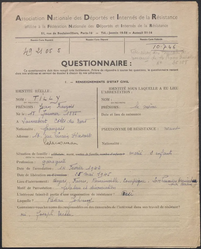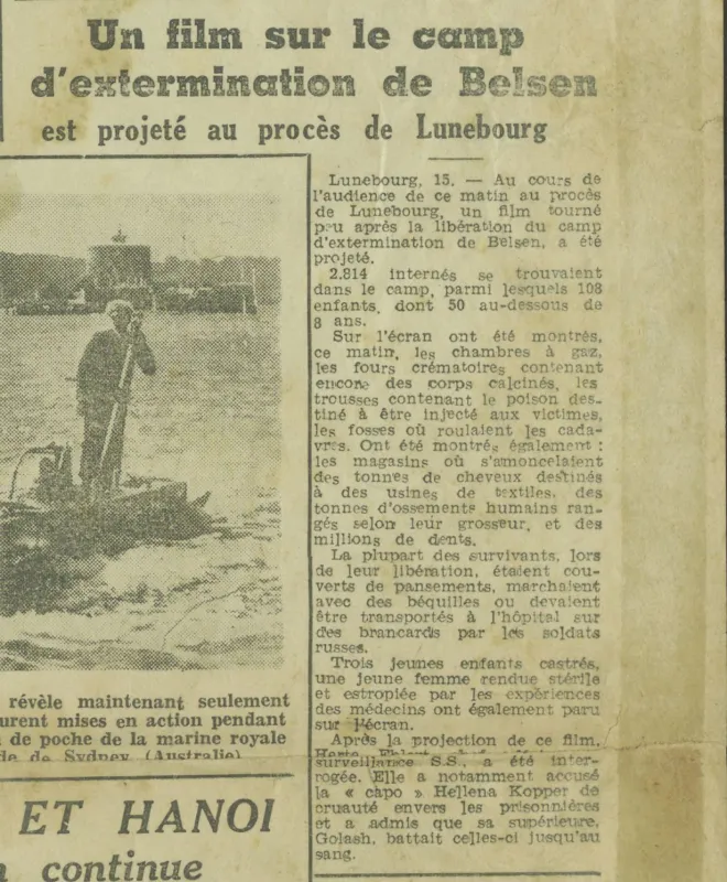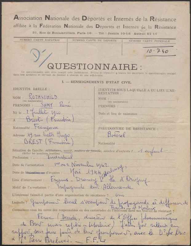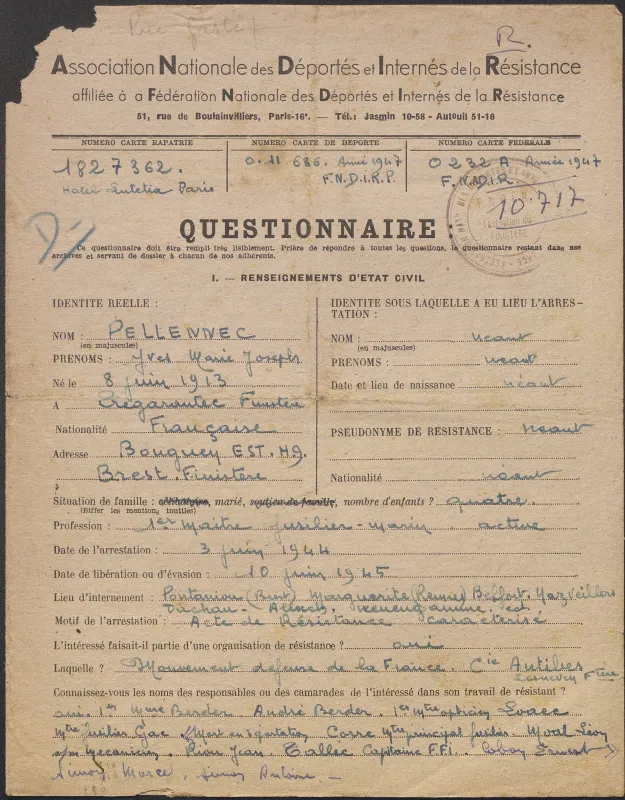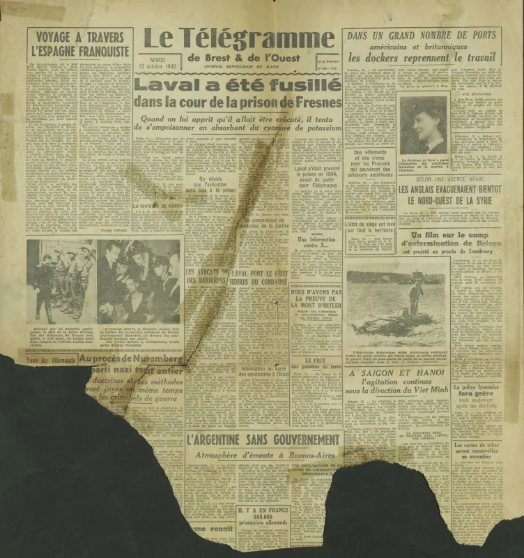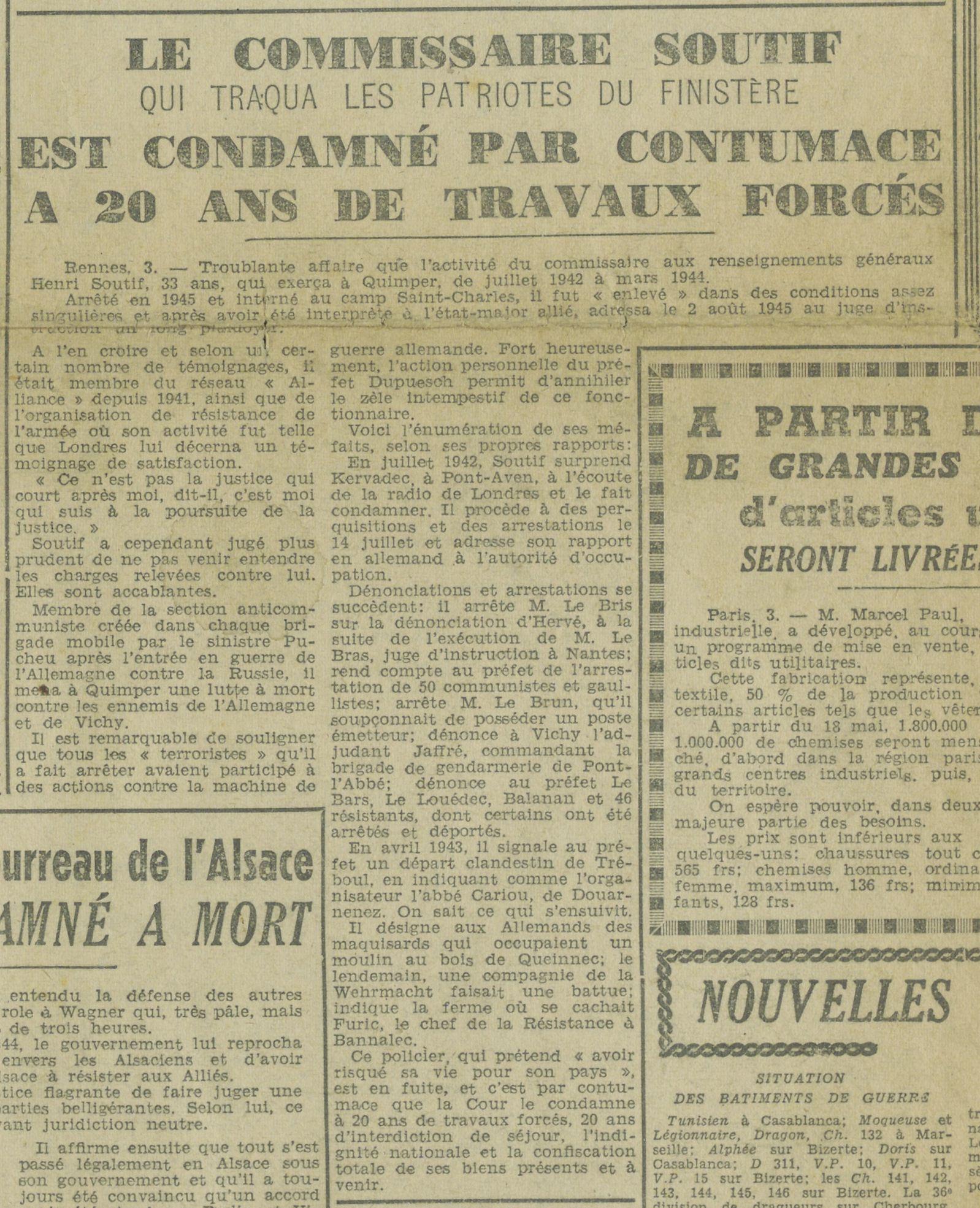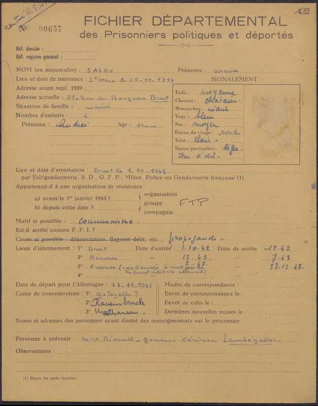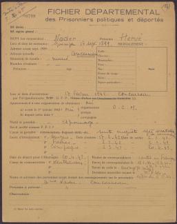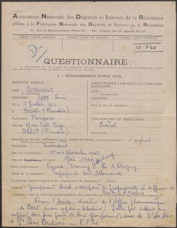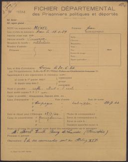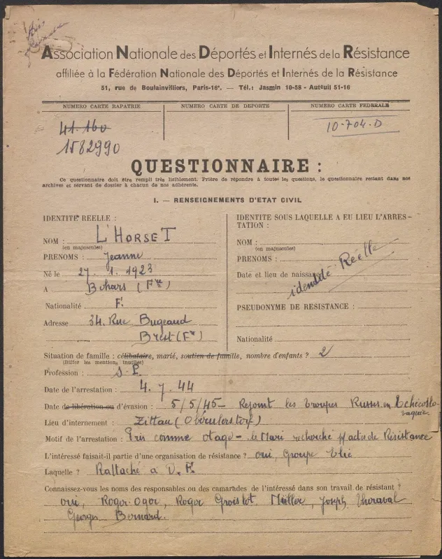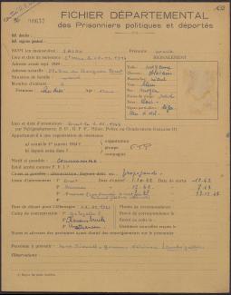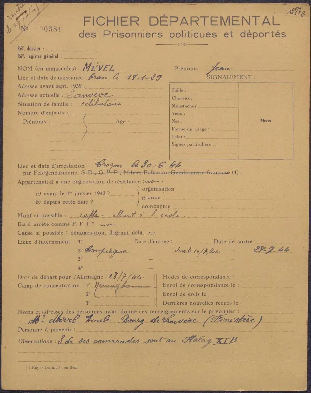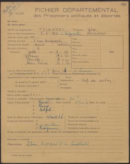 Survivre à l’univers concentrationnaire nazi et à la Shoah Liste des camps de concentration Liste des camps de concentration Cliquez pour accéder au document numérisé (31 W 611) Libération du Camp de Zéthain en Silésie par les russes (23 avril 1945) Libération du Camp de Zéthain en Silésie par les russes (23 avril 1945) https://recherche.archives.finistere.fr/viewer/series/medias/collections/W/178W/178W021/19/ Des archives permettant de retracer le parcours de déportés survivants : Le fichier de dénombrement des victimes de guerre (décret du 16 février 1945). L'intégralité du fichier, conservé sous les références 1 W 197-204 et 178 W 1-19, a été numérisé et est consultable en ligne sur notre portail. Les fichiers de recensement des prisonniers politiques et des déportés. Un premier fichier, dressé par l'Office National des Anciens Combattants et Victimes de guerre, recense les prisonniers politiques et déportés finistériens. Conservées sous la référence 1397 W, elles sont classées par ordre alphabétique et sont accessibles en ligne. Le fonds Alain Le Grand, représentant départemental du Comité d'histoire de la Deuxième Guerre mondiale, pour l'élaboration de la "carte de la souffrance". Ce fichier concerne uniquement les déportés. Conservées sous la référence 208 J 17 à 19, les fiches sont classées par collections puis ordre alphabétique et sont accessibles en ligne. Retrouvez toutes ces informations sur la page Rechercher une victime de guerre. Le fonds de la section de Brest de l'Association des déportés, internés et familles de disparus du Finistère (ADIF). Ce fonds contient quelques documents relatifs à l'organisation et au fonctionnement de la section locale brestoise de l'ADIF (statuts, correspondance, comptabilité...) et surtout des dossiers individuels d'adhérents. Quelques parcours de déportés survivants issus de ce fond : Bernard Fouquereau Bernard Fouquereau https://archives.finistere.fr/sites/default/files/frad029_228j_0011_001-1.pdf https://archives.finistere.fr/sites/default/files/frad029_228j_0011_004.pdf Jeanne L'Horset Jeanne L'Horset https://archives.finistere.fr/sites/default/files/frad029_228j_0011_004.pdf Yves Pellenec Yves Pellenec 228 J 12 Fichier départemental des prisonniers politiques et déportés - 1397 W Hervé Nader Hervé Nader Hervé Nader - 228 J 12 Fichier départemental des prisonniers politiques et déportés - 1397 W Fonds Hervé Nader - Archives municipales de Quimper - 14 J Samy Rotschild Samy Rotschild Fichier départemental des prisonniers politiques et déportés - 1397 W 2 Judith Sigoura Judith Sigoura Fichier départemental des prisonniers politiques et déportés - 1397 W 2 À consulter également : Fiches du Mémorial de la Shoah Fiche de son mari Jaques Sigoura (décédé) au Fichier départemental des prisonniers politiques et déportés Famille Arnstein Famille Arnstein https://afmdgard.org/arnstein-hermann/ Jean-François Tilly Jean-François Tilly Témoigner Les journaux racontent le retour des déportés Des expositions sur les crimes nazis sont organisées Des associations sont créées pour aider les déportés (Fonds de l’Amicale de Neuengame et de ses commandos - 233 J) Les déportés résistants commencent à témoigner auprès de la jeunesse .... Les journaux racontent le retour des déportés Les journaux racontent le retour des déportés Courrier Français Témoignage chrétien 11 mai 1945 (208 J 301) Les premières expositions sur les crimes nazis Les premières expositions sur les crimes nazis Des déportés résistants qui ont témoigné auprès des jeunes : Jean Mevel Des déportés résistants qui ont témoigné auprès des jeunes : Jean Mevel Consultez d'autres témoignages de Jean Mevel, le plus jeune déporté du Finistère, sur le site de la fondation pour la mémoire de la déportation. Fichier des déportés - 1397 W 2/1 Des déportés résistants qui ont témoigné auprès des jeunes : Marie Salou (Cam) Des déportés résistants qui ont témoigné auprès des jeunes : Marie Salou (Cam) Fichier départemental des prisonniers politiques et déportés : Marie Salou Consultez également : La page du pôle Jean Moulin La page du site Résistance-Brest Juger et rendre justice La presse relate les procès des criminels nazis Rendre justice : la mise en place du statut de déporté (1945-1948) Des mesures sont prises pour accompagner le retour des déportés : prise en charge médicale, bons d’achat de vêtements… Laval a été fusillé Laval a été fusillé Article daté du 16 octobre 1945 Cote 208 J 299 Article sur le camp de Bergen Belsen - film projeté au tribunal de Lunebourg Article sur le camp de Bergen Belsen - film projeté au tribunal de Lunebourg Titre 208 J 299 Article daté du 16 octobre 1945 Cote 208 J 299 Le Commissaire Soutif condamné aux travaux forcés Le Commissaire Soutif condamné aux travaux forcés Titre Commissaire Soutif condamné aux travaux forcés Article du 4 mai 1946 Cote 208 J 299 Wagner, le bourreau d'Alsace a été condamné à mort Wagner, le bourreau d'Alsace a été condamné à mort Titre Wagner, le bourreau d'Alsace a été condamné à mort Article du 4 mai 1945 Cote 208 J 299 La sentence de Nuremberg La sentence de Nuremberg Titre La sentence de Nuremberg Article du 9 novembre 1946 Cote 208 J 299 Circulaire déporté résistant Circulaire déporté résistant Cliquez pour consulter le document numérisé dans sont intégralité Cote 228 J 1