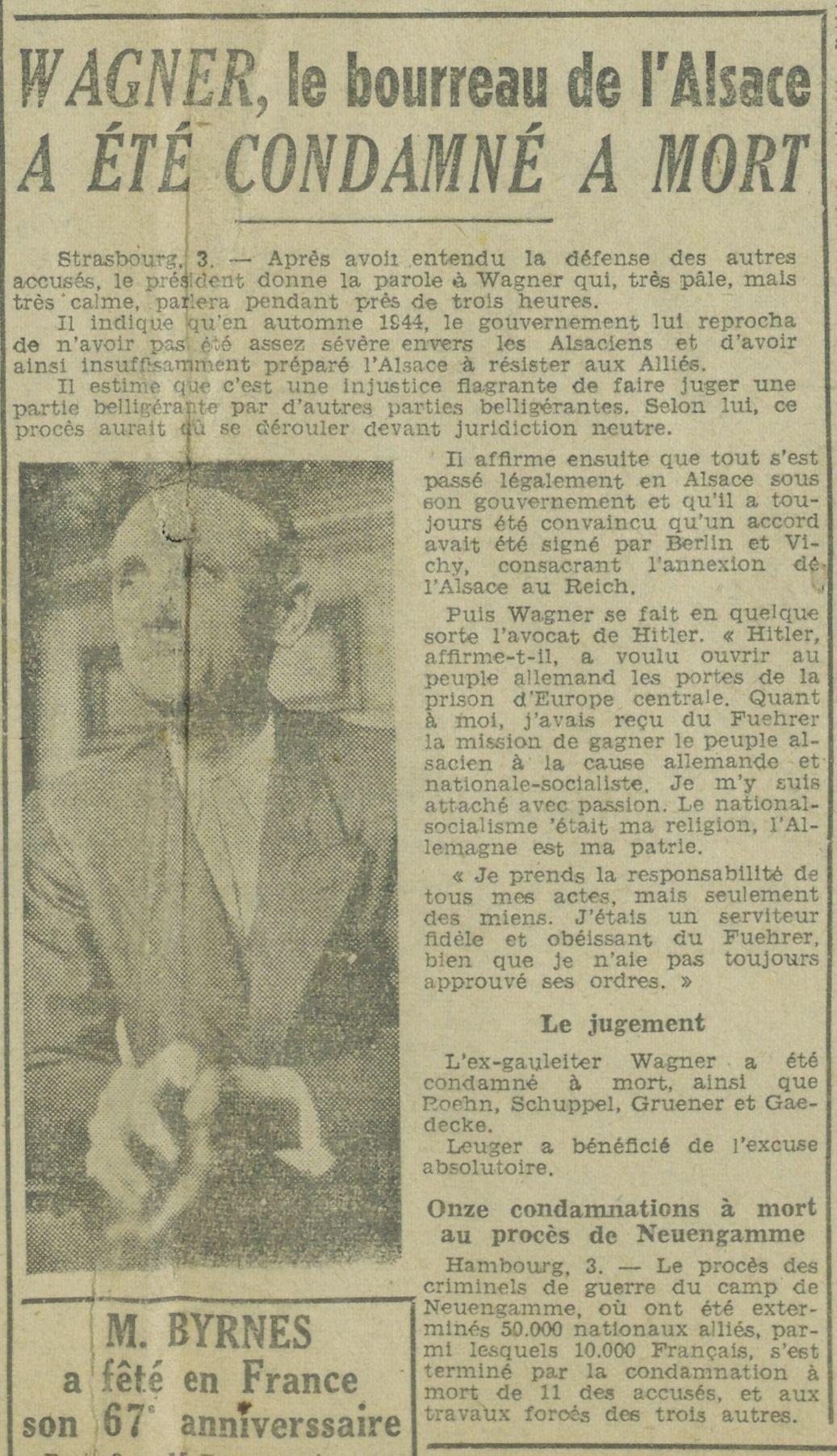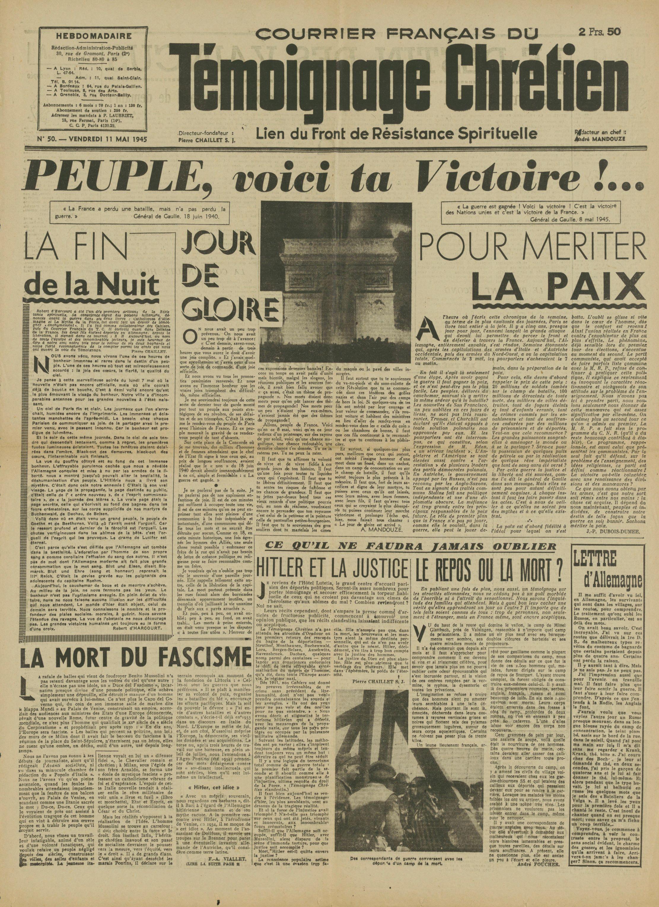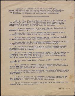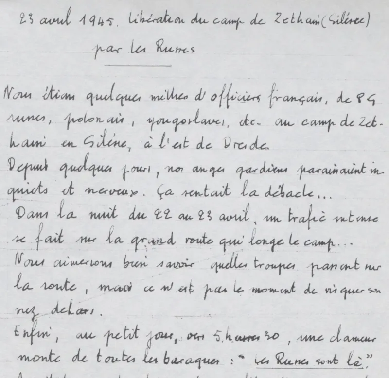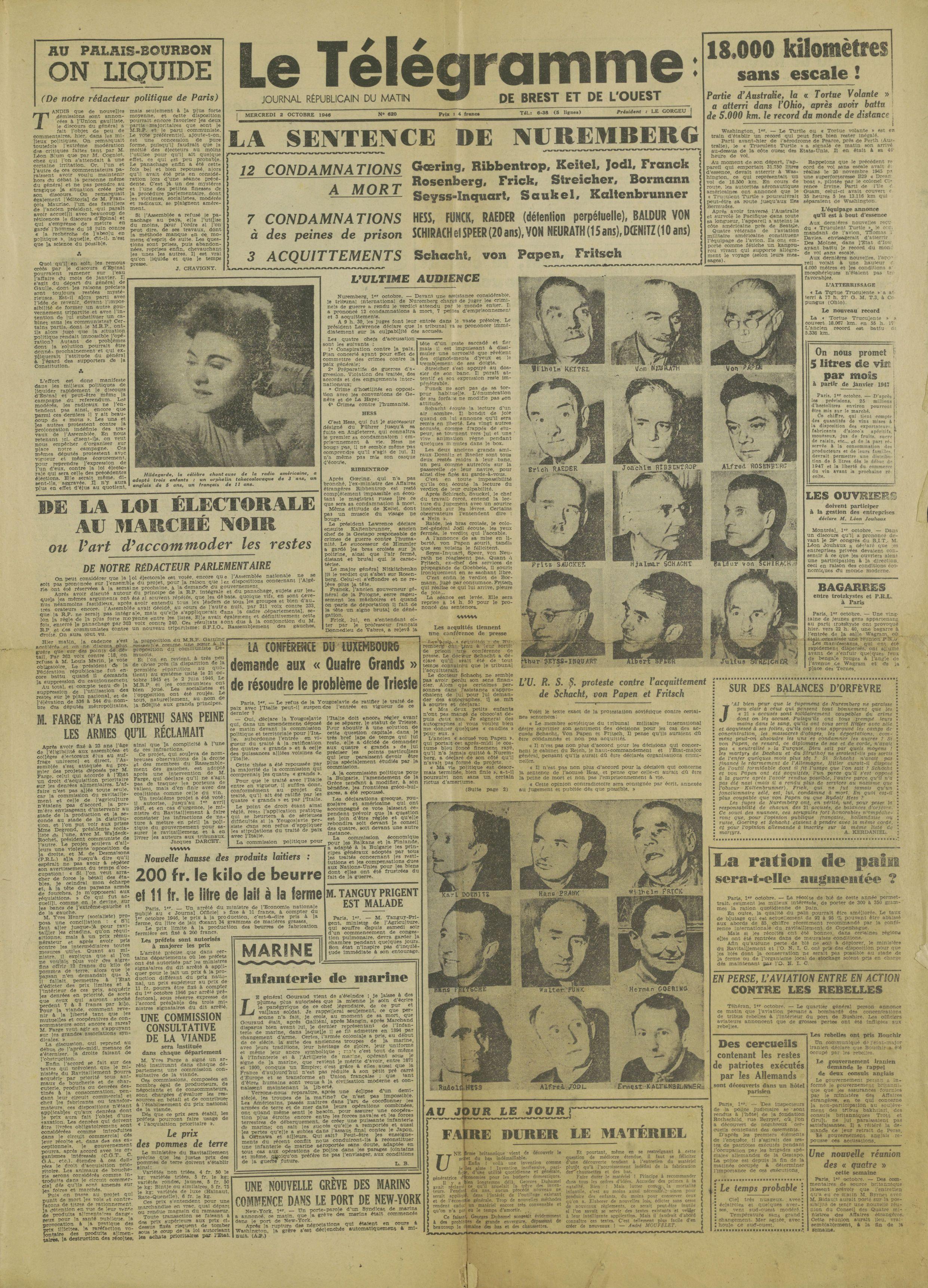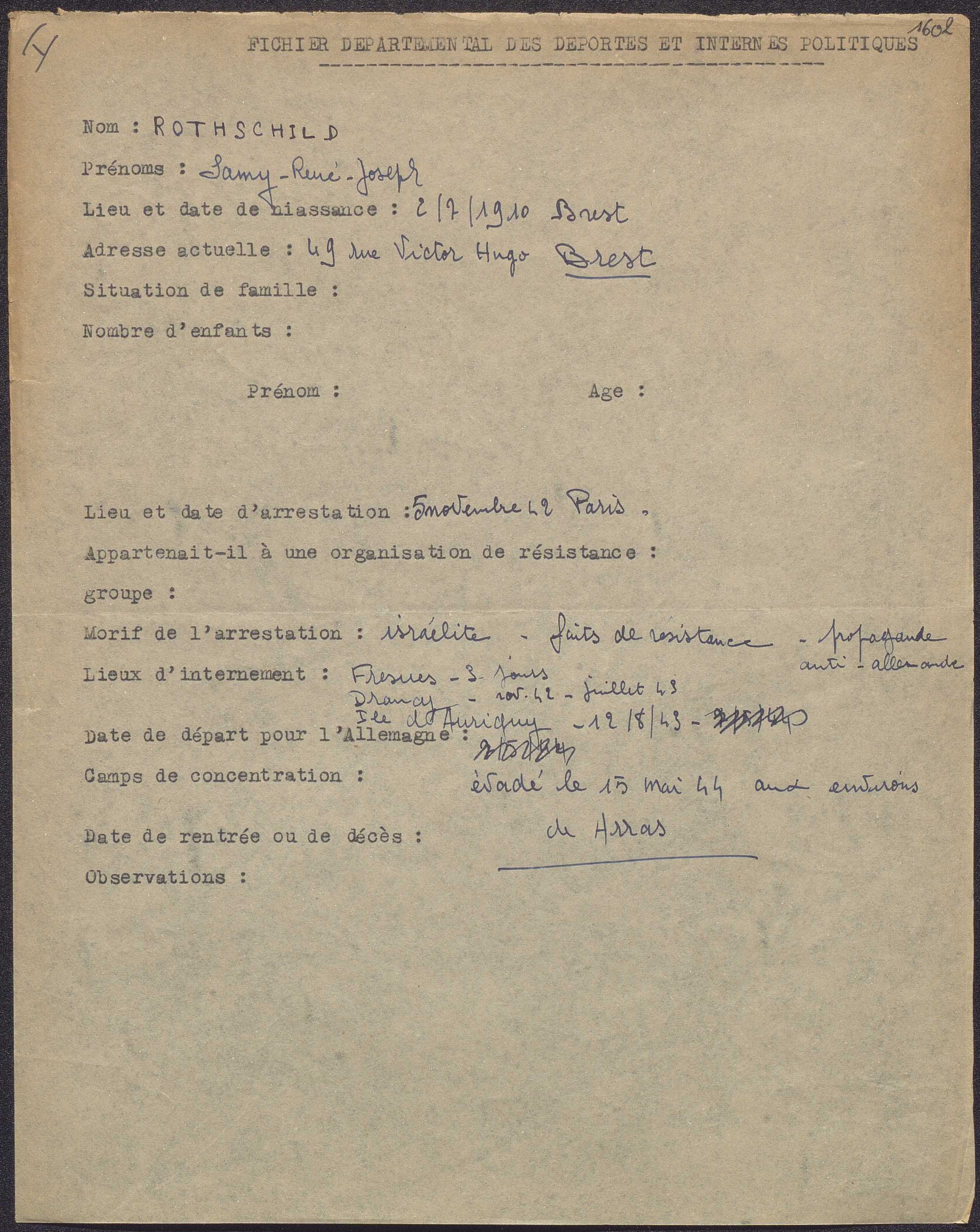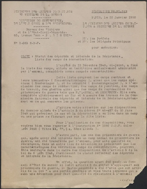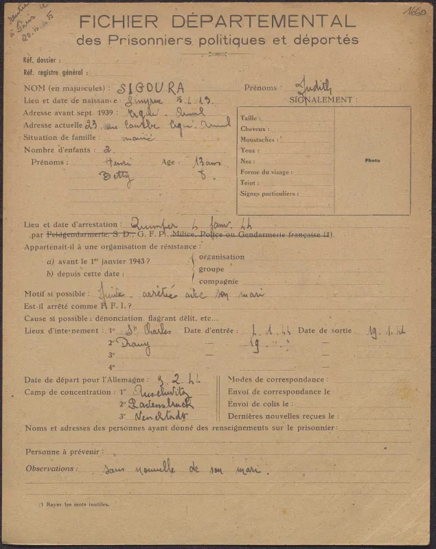 Survivre à l’univers concentrationnaire nazi et à la Shoah Liste des camps de concentration Liste des camps de concentration Cliquez pour accéder au document numérisé (31 W 611) Libération du Camp de Zéthain en Silésie par les russes (23 avril 1945) Libération du Camp de Zéthain en Silésie par les russes (23 avril 1945) https://recherche.archives.finistere.fr/viewer/series/medias/collections/W/178W/178W021/19/ Des archives permettant de retracer le parcours de déportés survivants : Le fichier de dénombrement des victimes de guerre (décret du 16 février 1945). L'intégralité du fichier, conservé sous les références 1 W 197-204 et 178 W 1-19, a été numérisé et est consultable en ligne sur notre portail. Les fichiers de recensement des prisonniers politiques et des déportés. Un premier fichier, dressé par l'Office National des Anciens Combattants et Victimes de guerre, recense les prisonniers politiques et déportés finistériens. Conservées sous la référence 1397 W, elles sont classées par ordre alphabétique et sont accessibles en ligne. Le fonds Alain Le Grand, représentant départemental du Comité d'histoire de la Deuxième Guerre mondiale, pour l'élaboration de la "carte de la souffrance". Ce fichier concerne uniquement les déportés. Conservées sous la référence 208 J 17 à 19, les fiches sont classées par collections puis ordre alphabétique et sont accessibles en ligne. Retrouvez toutes ces informations sur la page Rechercher une victime de guerre. Le fonds de la section de Brest de l'Association des déportés, internés et familles de disparus du Finistère (ADIF). Ce fonds contient quelques documents relatifs à l'organisation et au fonctionnement de la section locale brestoise de l'ADIF (statuts, correspondance, comptabilité...) et surtout des dossiers individuels d'adhérents. Quelques parcours de déportés survivants issus de ce fond : Bernard Fouquereau Bernard Fouquereau https://archives.finistere.fr/sites/default/files/frad029_228j_0011_001-1.pdf https://archives.finistere.fr/sites/default/files/frad029_228j_0011_004.pdf Jeanne L'Horset Jeanne L'Horset https://archives.finistere.fr/sites/default/files/frad029_228j_0011_004.pdf Yves Pellenec Yves Pellenec 228 J 12 Fichier départemental des prisonniers politiques et déportés - 1397 W Hervé Nader Hervé Nader Hervé Nader - 228 J 12 Fichier départemental des prisonniers politiques et déportés - 1397 W Fonds Hervé Nader - Archives municipales de Quimper - 14 J Samy Rotschild Samy Rotschild Fichier départemental des prisonniers politiques et déportés - 1397 W 2 Judith Sigoura Judith Sigoura Fichier départemental des prisonniers politiques et déportés - 1397 W 2 À consulter également : Fiches du Mémorial de la Shoah Fiche de son mari Jaques Sigoura (décédé) au Fichier départemental des prisonniers politiques et déportés Famille Arnstein Famille Arnstein https://afmdgard.org/arnstein-hermann/ Jean-François Tilly Jean-François Tilly Témoigner Les journaux racontent le retour des déportés Des expositions sur les crimes nazis sont organisées Des associations sont créées pour aider les déportés (Fonds de l’Amicale de Neuengame et de ses commandos - 233 J) Les déportés résistants commencent à témoigner auprès de la jeunesse .... Les journaux racontent le retour des déportés Les journaux racontent le retour des déportés Courrier Français Témoignage chrétien 11 mai 1945 (208 J 301) Les premières expositions sur les crimes nazis Les premières expositions sur les crimes nazis Des déportés résistants qui ont témoigné auprès des jeunes : Jean Mevel Des déportés résistants qui ont témoigné auprès des jeunes : Jean Mevel Consultez d'autres témoignages de Jean Mevel, le plus jeune déporté du Finistère, sur le site de la fondation pour la mémoire de la déportation. Fichier des déportés - 1397 W 2/1 Des déportés résistants qui ont témoigné auprès des jeunes : Marie Salou (Cam) Des déportés résistants qui ont témoigné auprès des jeunes : Marie Salou (Cam) Fichier départemental des prisonniers politiques et déportés : Marie Salou Consultez également : La page du pôle Jean Moulin La page du site Résistance-Brest Juger et rendre justice La presse relate les procès des criminels nazis Rendre justice : la mise en place du statut de déporté (1945-1948) Des mesures sont prises pour accompagner le retour des déportés : prise en charge médicale, bons d’achat de vêtements… Laval a été fusillé Laval a été fusillé Article daté du 16 octobre 1945 Cote 208 J 299 Article sur le camp de Bergen Belsen - film projeté au tribunal de Lunebourg Article sur le camp de Bergen Belsen - film projeté au tribunal de Lunebourg Titre 208 J 299 Article daté du 16 octobre 1945 Cote 208 J 299 Le Commissaire Soutif condamné aux travaux forcés Le Commissaire Soutif condamné aux travaux forcés Titre Commissaire Soutif condamné aux travaux forcés Article du 4 mai 1946 Cote 208 J 299 Wagner, le bourreau d'Alsace a été condamné à mort Wagner, le bourreau d'Alsace a été condamné à mort Titre Wagner, le bourreau d'Alsace a été condamné à mort Article du 4 mai 1945 Cote 208 J 299 La sentence de Nuremberg La sentence de Nuremberg Titre La sentence de Nuremberg Article du 9 novembre 1946 Cote 208 J 299 Circulaire déporté résistant Circulaire déporté résistant Cliquez pour consulter le document numérisé dans sont intégralité Cote 228 J 1