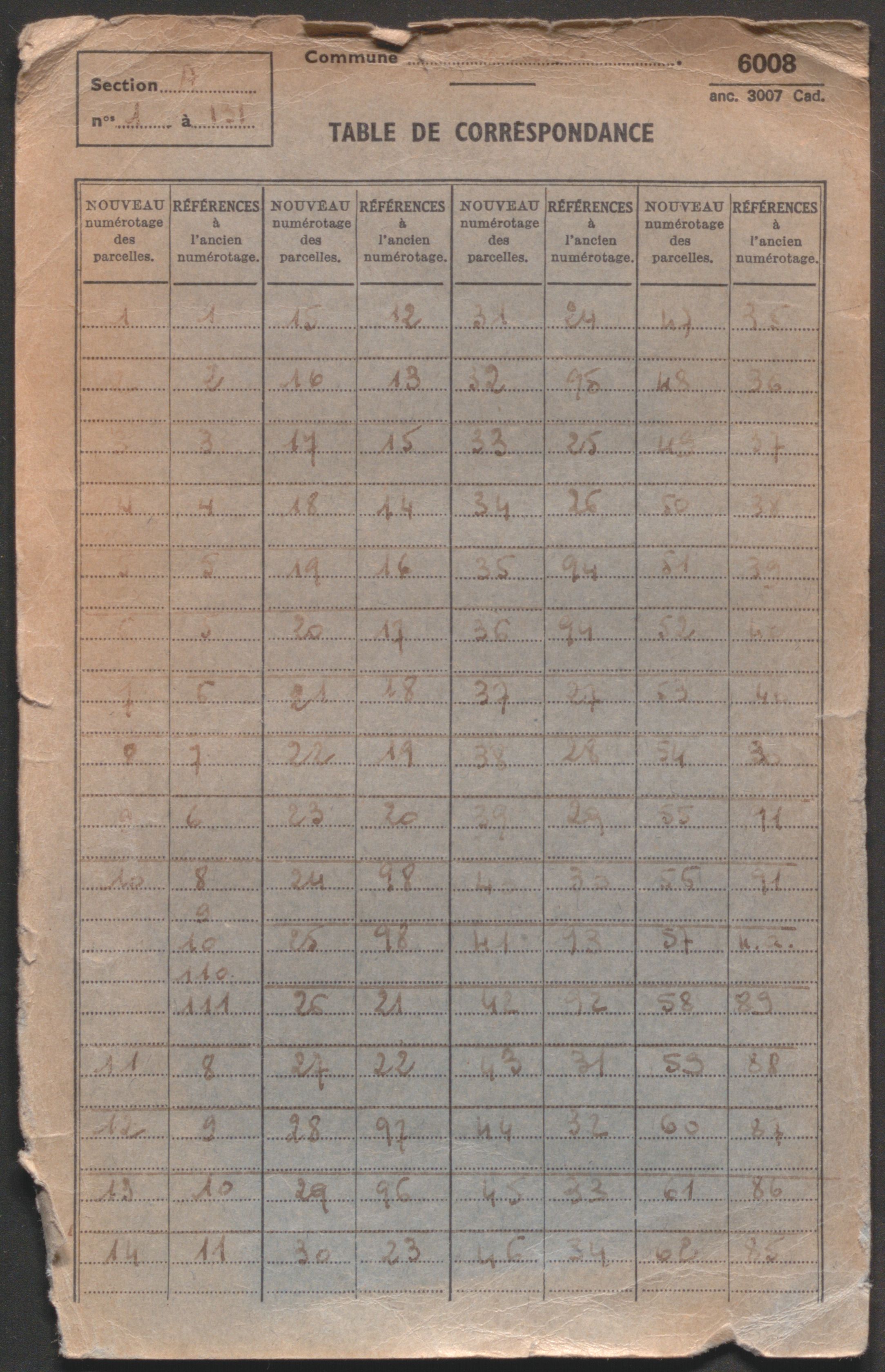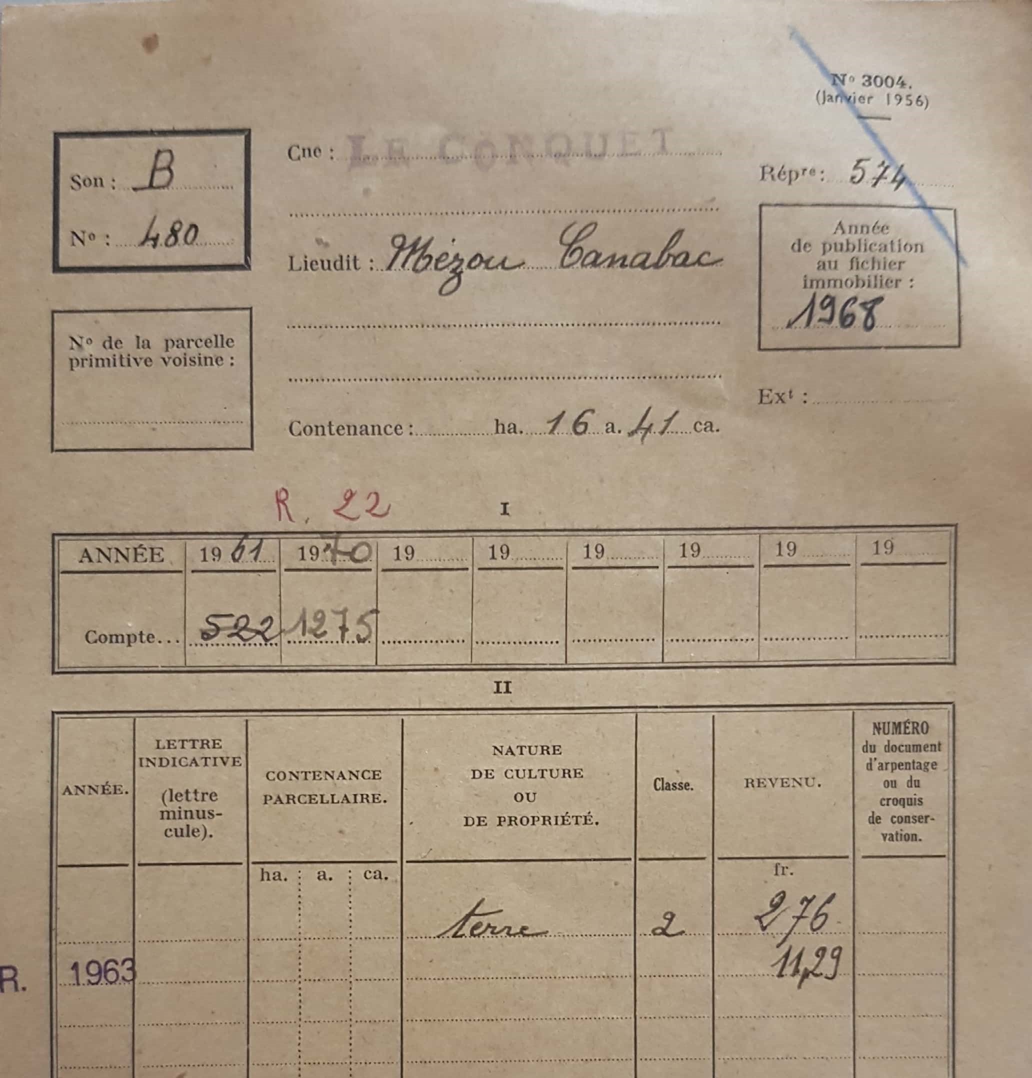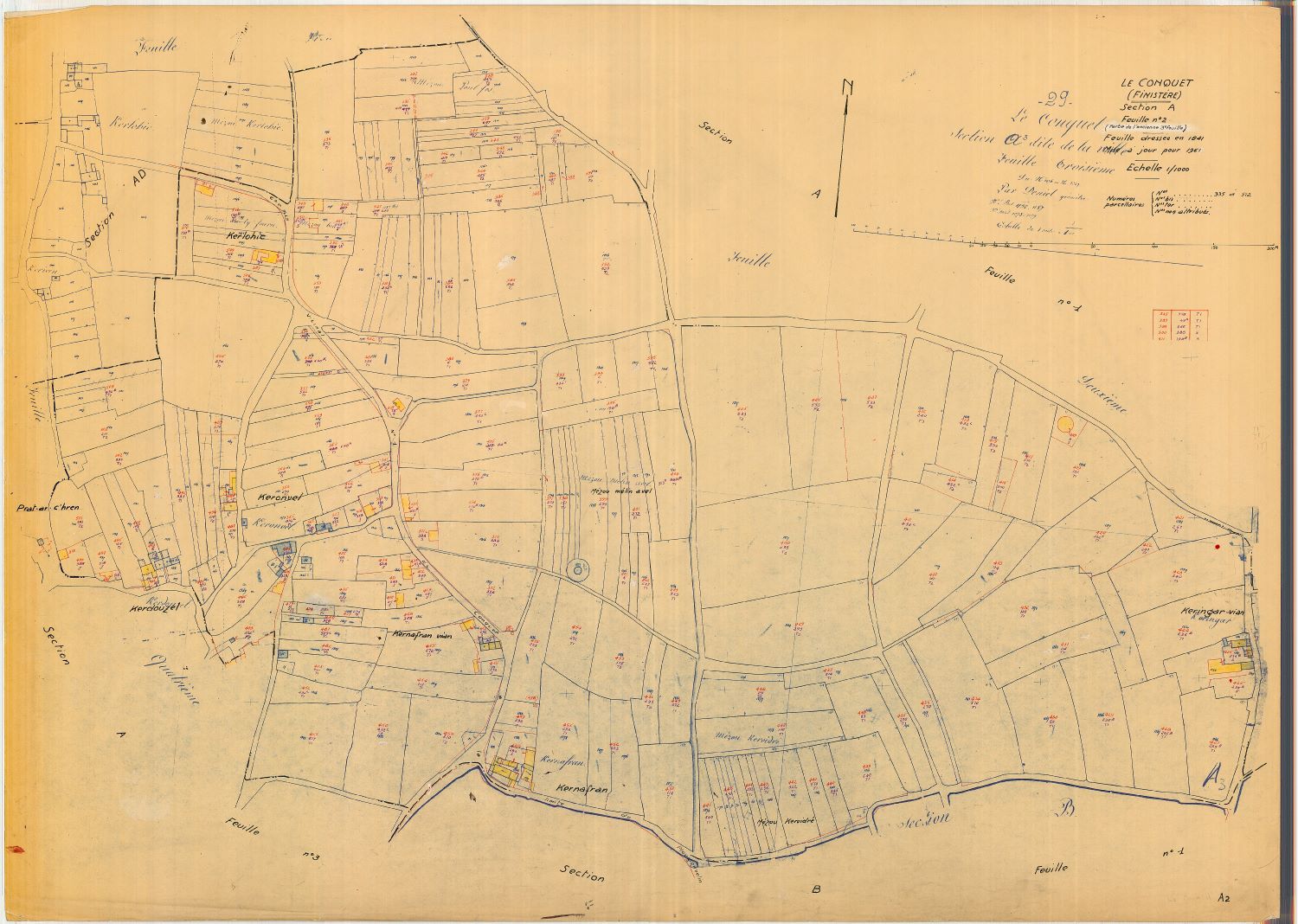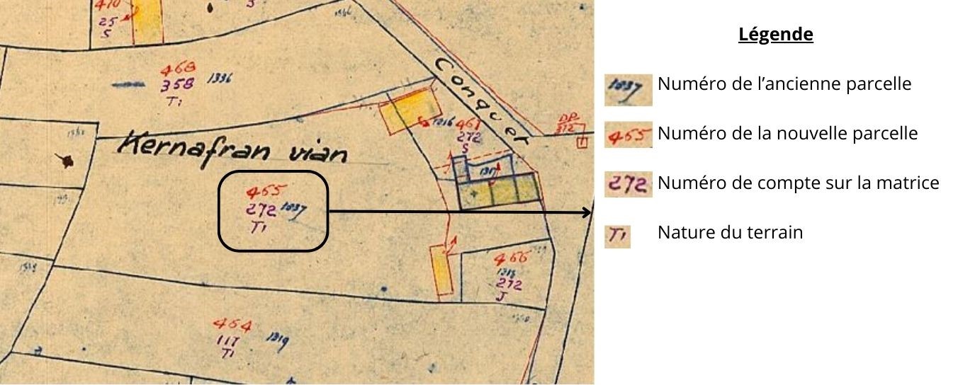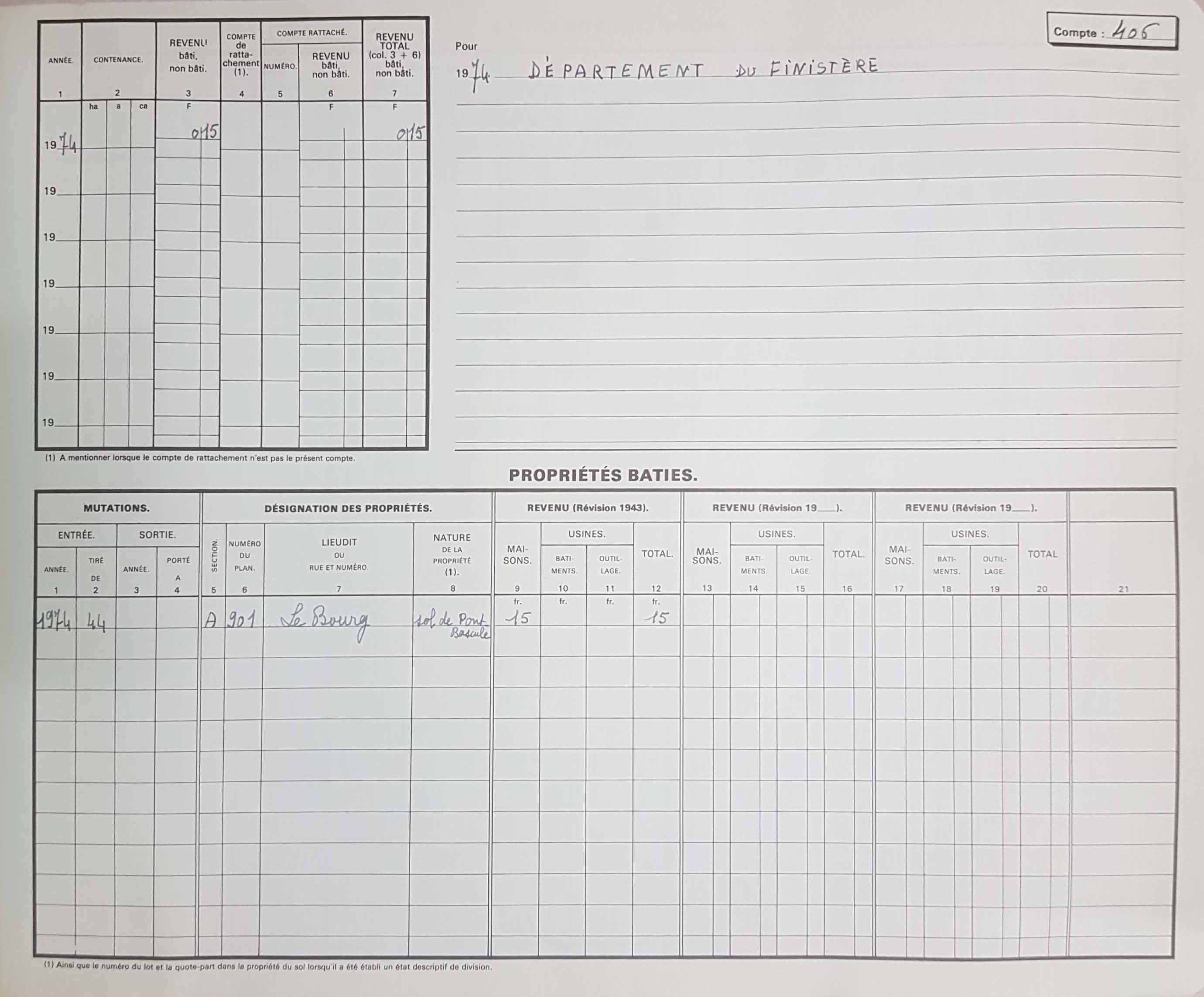 Les documents Les documents produits pour le cadastre rénové sont similaires à ceux du cadastre napoléonien (plans, états de section et matrices). Leur présentation est cependant modernisée et les mises à jour plus nombreuses. Une nouvelle catégorie de document fait son apparition : la table de correspondance, qui permet de faire le lien entre les parcelles rénovées et les parcelles napoléoniennes. Le plan parcellaire Commune de Trébabu, rénovation par renouvellement : section unique, feuille 3 (1941), 1961 W 74 Le plan parcellaire dressé au moment des opérations comprend pour chaque commune : un tableau d’assemblage, qui présente la division du territoire communal en sections alphabétiques (A, B…). les plans numérotés (A1, A2, AA, AB, ZA, ZB,…) composant les sections. Chaque plan contient les parcelles numérotées, avec mention du bâti. Il peut exister plusieurs versions des plans parcellaires, en fonction des actualisations et des opérations foncières. Les plans du cadastre rénové ont été numérisés par la Direction départementale des Finances publiques et sont accessibles en ligne sur notre portail L'état de section Commune du Conquet : fiche d'état de section, B480, 2147 W 51 L’état de section se présente, pour chaque commune, sous forme de fiche ou de liste par parcelle, classée par sections. Il contient les éléments relatifs à la parcelle : le numéro de la parcelle (section + numéro) le nom de la parcelle (localisation de la voie ou du lieu-dit) la contenance le numéro de compte du propriétaire dans la matrice cadastrale (la fiche ne mentionne pas le nom du propriétaire) la nature de la parcelle le revenu Il existe 2 modèles de fiches (1er modèle : 1956-1974 ; 2nd modèle : 1974-1979) puis des listes ou microfiches (1980-1989) mais le contenu est similaire. L'état de section est mis à jour, en fonction des actualisations et des opérations foncières, ce qui permet d'avoir un historique sur l'évolution de la parcelle. En 1974, les numéros de compte communaux sont réattribués. Le nouveau numéro est composé de la première lettre du nom de famille + numéro d'ordre (Ex : R22). On retrouve sur la même fiche l'ancien numéro de compte (Ex : 1275) et le nouveau numéro de compte en rouge (Ex : R22). A savoir : En cas de recherche parcellaire, si vous ne disposez pas du nom du propriétaire, l'état de section permet de retrouver le compte associé à la parcelle. La matrice La matrice cadastrale permet de connaître pour chaque contribuable la liste de ses propriétés (bâties ou non bâties) avec leur description (adresse, numéro de parcelle, nature, contenance, impositions) et les mutations. Elle évolue au fil des changements d'organisation : De la rénovation jusqu'à 1974 : la matrice grise, du nom de la couleur de la couverture De 1974 à 1979 : la matrice mécanographique, suite au changement du système informatique A partir de 1979 : apparition des microfiches cadastrales Commune de Tréogat : matrice cadastrale, compte du département du Finistère, 1974, 222 W 616 Matrice grise (de la rénovation jusqu'à 1974) Elle contient : une table des comptes : elle fournit, dans l'ordre numérique des comptes, l'identité du titulaire. les comptes actifs : dans l'ordre alphabétique des propriétaires ; les personnes morales étant placées en tête de classement. les comptes supprimés : dans l'ordre numérique des comptes. Chaque compte possède différents feuillets : feuillets roses (propriétés bâties) et feuillets blancs (propriétés non bâties), de la rénovation jusqu'aux années 1960 feuillets bleus (propriétés bâties - recto et non bâties - verso), des années 1960 jusqu'à 1974 A savoir : Les biens exemptés permanents (ex : édifices publics, bâtiments ruraux, ...) ne sont pas mentionnés dans les matrices. Commune de Guilligomarc'h : matrice cadastrale, compte du département du Finistère, 223 W 220 Matrice mécanographique (1974-1979) Le changement de système informatique - passage au système Majic 1 (Mise à jour des informations cadastrales 1) - entraîne la création d'une nouvelle matrice. L'organisation de la matrice évolue : retrait en début d’année des relevés périmés (suppression ou ajout de parcelles, modification du revenu ou de la contenance, …), tamponnés de l’année de suppression, archivés dans une reliure et remplacés par les actualisés. A savoir : Seules les matrices mécanographiques pour l'arrondissement de Quimper ont été versées aux Archives départementales Microfiches cadastrales (à partir de 1979) A partir de 1979, les matrices sont remplacées par des microfiches cadastrales, qui ne sont pour le moment pas consultables, car nécessitant une remise en ordre et une numérisation au préalable. La table de correspondance La table de correspondance permet de faire le lien entre le numéro du cadastre rénové et celui du cadastre napoléonien. La fiche est organisée dans l'ordre numérique des numéros du cadastre rénové. Attention : en cas de découpage, une référence de parcelle napoléonienne peut correspondre à plusieurs parcelles rénovées. Commune du Conquet : table de correspondance, 2147 W 550 Cependant, il n'en existe que pour 18 communes de l'arrondissement de Brest et 1 commune de l'arrondissement de Quimper : Brest (lacunaire : 7 fiches de la section A) Guilers Guipavas Guissény Hanvec La Forêt-Fouesnant Lampaul-Plouarzel Landéda Landerneau Landunvez Le Conquet Locmaria-Plouzané Ouessant Plougastel-Daoulas Plougonvelin Plouguerneau Plounéour-Brignogan-Plages (Plounéour-Trez) Plouzané Saint-Renan Les tables numérisées sont accessibles dans la rubrique "Etat de section" du répertoire méthodique, dans le dossier des communes concernées. S’il n’existe pas de table de correspondance pour la commune que vous recherchez, vous pouvez retrouver cette information dans le bleu de rénovation qui contient pour chaque parcelle le numér