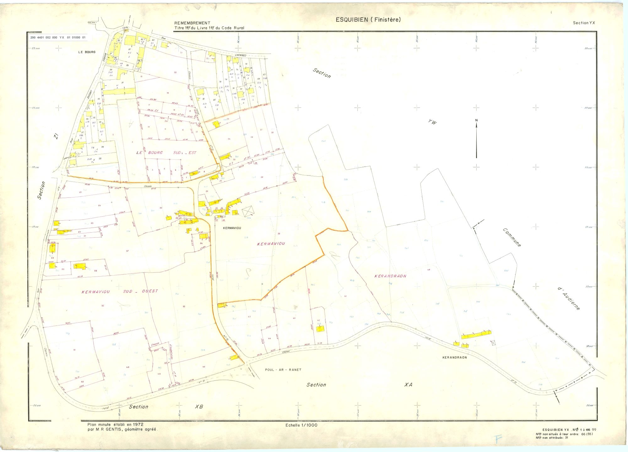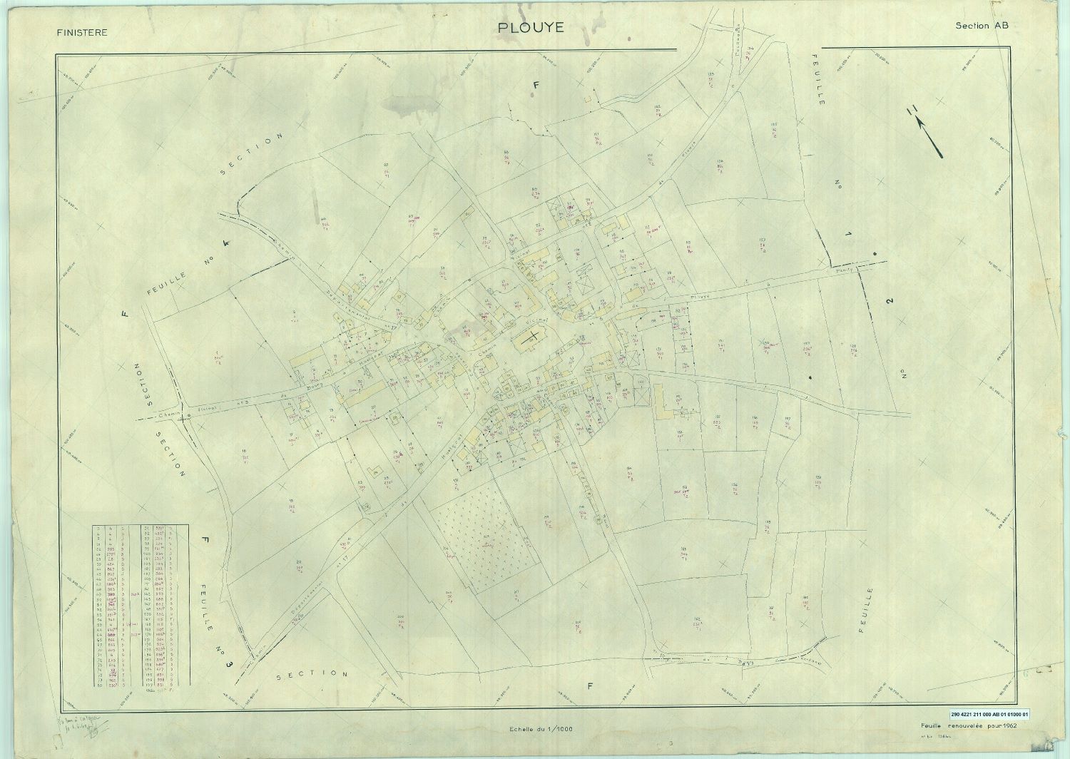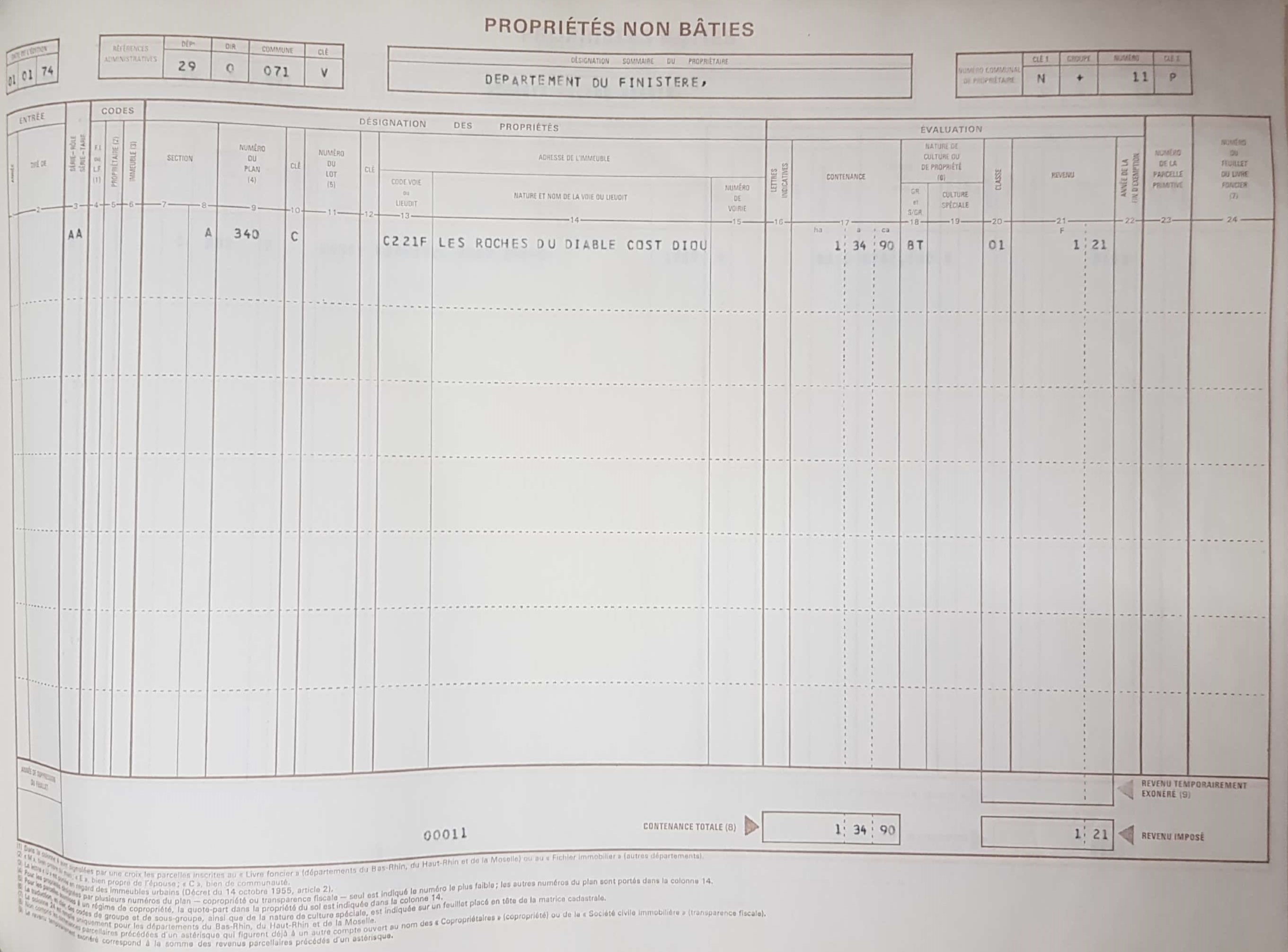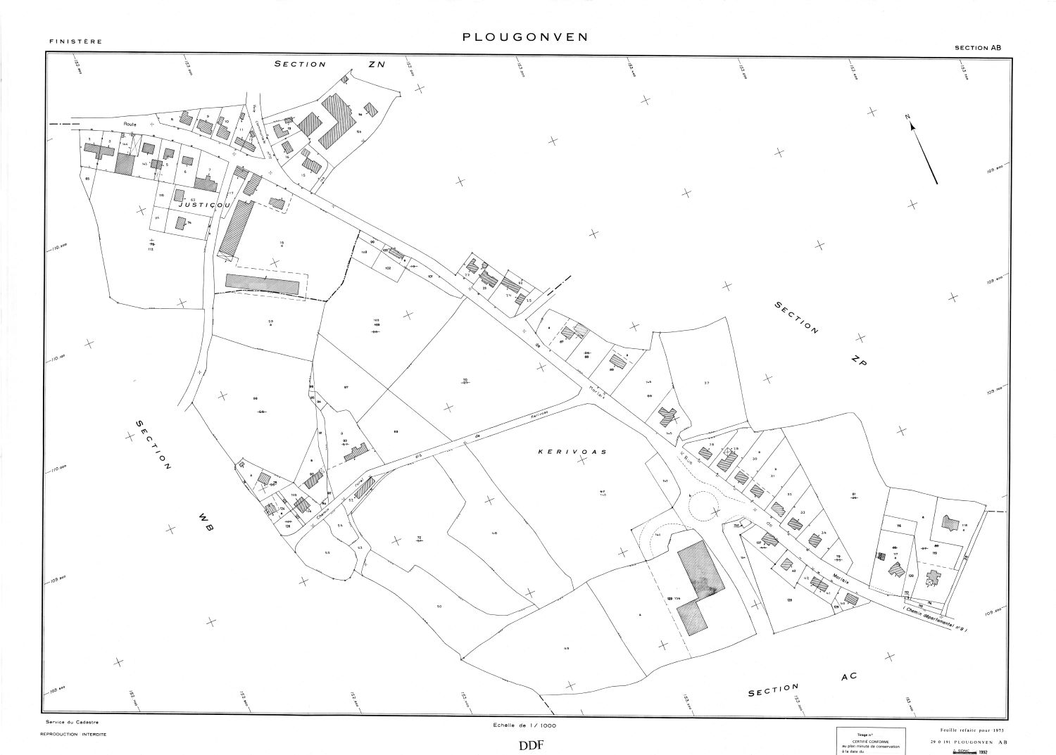 Les documents Les documents produits pour le cadastre rénové sont similaires à ceux du cadastre napoléonien (plans, états de section et matrices). Leur présentation est cependant modernisée et les mises à jour plus nombreuses. Une nouvelle catégorie de document fait son apparition : la table de correspondance, qui permet de faire le lien entre les parcelles rénovées et les parcelles napoléoniennes. Le plan parcellaire Commune de Trébabu, rénovation par renouvellement : section unique, feuille 3 (1941), 1961 W 74 Le plan parcellaire dressé au moment des opérations comprend pour chaque commune : un tableau d’assemblage, qui présente la division du territoire communal en sections alphabétiques (A, B…). les plans numérotés (A1, A2, AA, AB, ZA, ZB,…) composant les sections. Chaque plan contient les parcelles numérotées, avec mention du bâti. Il peut exister plusieurs versions des plans parcellaires, en fonction des actualisations et des opérations foncières. Les plans du cadastre rénové ont été numérisés par la Direction départementale des Finances publiques et sont accessibles en ligne sur notre portail L'état de section Commune du Conquet : fiche d'état de section, B480, 2147 W 51 L’état de section se présente, pour chaque commune, sous forme de fiche ou de liste par parcelle, classée par sections. Il contient les éléments relatifs à la parcelle : le numéro de la parcelle (section + numéro) le nom de la parcelle (localisation de la voie ou du lieu-dit) la contenance le numéro de compte du propriétaire dans la matrice cadastrale (la fiche ne mentionne pas le nom du propriétaire) la nature de la parcelle le revenu Il existe 2 modèles de fiches (1er modèle : 1956-1974 ; 2nd modèle : 1974-1979) puis des listes ou microfiches (1980-1989) mais le contenu est similaire. L'état de section est mis à jour, en fonction des actualisations et des opérations foncières, ce qui permet d'avoir un historique sur l'évolution de la parcelle. En 1974, les numéros de compte communaux sont réattribués. Le nouveau numéro est composé de la première lettre du nom de famille + numéro d'ordre (Ex : R22). On retrouve sur la même fiche l'ancien numéro de compte (Ex : 1275) et le nouveau numéro de compte en rouge (Ex : R22). A savoir : En cas de recherche parcellaire, si vous ne disposez pas du nom du propriétaire, l'état de section permet de retrouver le compte associé à la parcelle. La matrice La matrice cadastrale permet de connaître pour chaque contribuable la liste de ses propriétés (bâties ou non bâties) avec leur description (adresse, numéro de parcelle, nature, contenance, impositions) et les mutations. Elle évolue au fil des changements d'organisation : De la rénovation jusqu'à 1974 : la matrice grise, du nom de la couleur de la couverture De 1974 à 1979 : la matrice mécanographique, suite au changement du système informatique A partir de 1979 : apparition des microfiches cadastrales Commune de Tréogat : matrice cadastrale, compte du département du Finistère, 1974, 222 W 616 Matrice grise (de la rénovation jusqu'à 1974) Elle contient : une table des comptes : elle fournit, dans l'ordre numérique des comptes, l'identité du titulaire. les comptes actifs : dans l'ordre alphabétique des propriétaires ; les personnes morales étant placées en tête de classement. les comptes supprimés : dans l'ordre numérique des comptes. Chaque compte possède différents feuillets : feuillets roses (propriétés bâties) et feuillets blancs (propriétés non bâties), de la rénovation jusqu'aux années 1960 feuillets bleus (propriétés bâties - recto et non bâties - verso), des années 1960 jusqu'à 1974 A savoir : Les biens exemptés permanents (ex : édifices publics, bâtiments ruraux, ...) ne sont pas mentionnés dans les matrices. Commune de Guilligomarc'h : matrice cadastrale, compte du département du Finistère, 223 W 220 Matrice mécanographique (1974-1979) Le changement de système informatique - passage au système Majic 1 (Mise à jour des informations cadastrales 1) - entraîne la création d'une nouvelle matrice. L'organisation de la matrice évolue : retrait en début d’année des relevés périmés (suppression ou ajout de parcelles, modification du revenu ou de la contenance, …), tamponnés de l’année de suppression, archivés dans une reliure et remplacés par les actualisés. A savoir : Seules les matrices mécanographiques pour l'arrondissement de Quimper ont été versées aux Archives départementales Microfiches cadastrales (à partir de 1979) A partir de 1979, les matrices sont remplacées par des microfiches cadastrales, qui ne sont pour le moment pas consultables, car nécessitant une remise en ordre et une numérisation au préalable. La table de correspondance La table de correspondance permet de faire le lien entre le numéro du cadastre rénové et celui du cadastre napoléonien. La fiche est organisée dans l'ordre numérique des numéros du cadastre rénové. Attention : en cas de découpage, une référence de parcelle napoléonienne peut correspondre à plusieurs parcelles rénovées. Commune du Conquet : table de correspondance, 2147 W 550 Cependant, il n'en existe que pour 18 communes de l'arrondissement de Brest et 1 commune de l'arrondissement de Quimper : Brest (lacunaire : 7 fiches de la section A) Guilers Guipavas Guissény Hanvec La Forêt-Fouesnant Lampaul-Plouarzel Landéda Landerneau Landunvez Le Conquet Locmaria-Plouzané Ouessant Plougastel-Daoulas Plougonvelin Plouguerneau Plounéour-Brignogan-Plages (Plounéour-Trez) Plouzané Saint-Renan Les tables numérisées sont accessibles dans la rubrique "Etat de section" du répertoire méthodique, dans le dossier des communes concernées. S’il n’existe pas de table de correspondance pour la commune que vous recherchez, vous pouvez retrouver cette information dans le bleu de rénovation qui contient pour chaque parcelle le numér