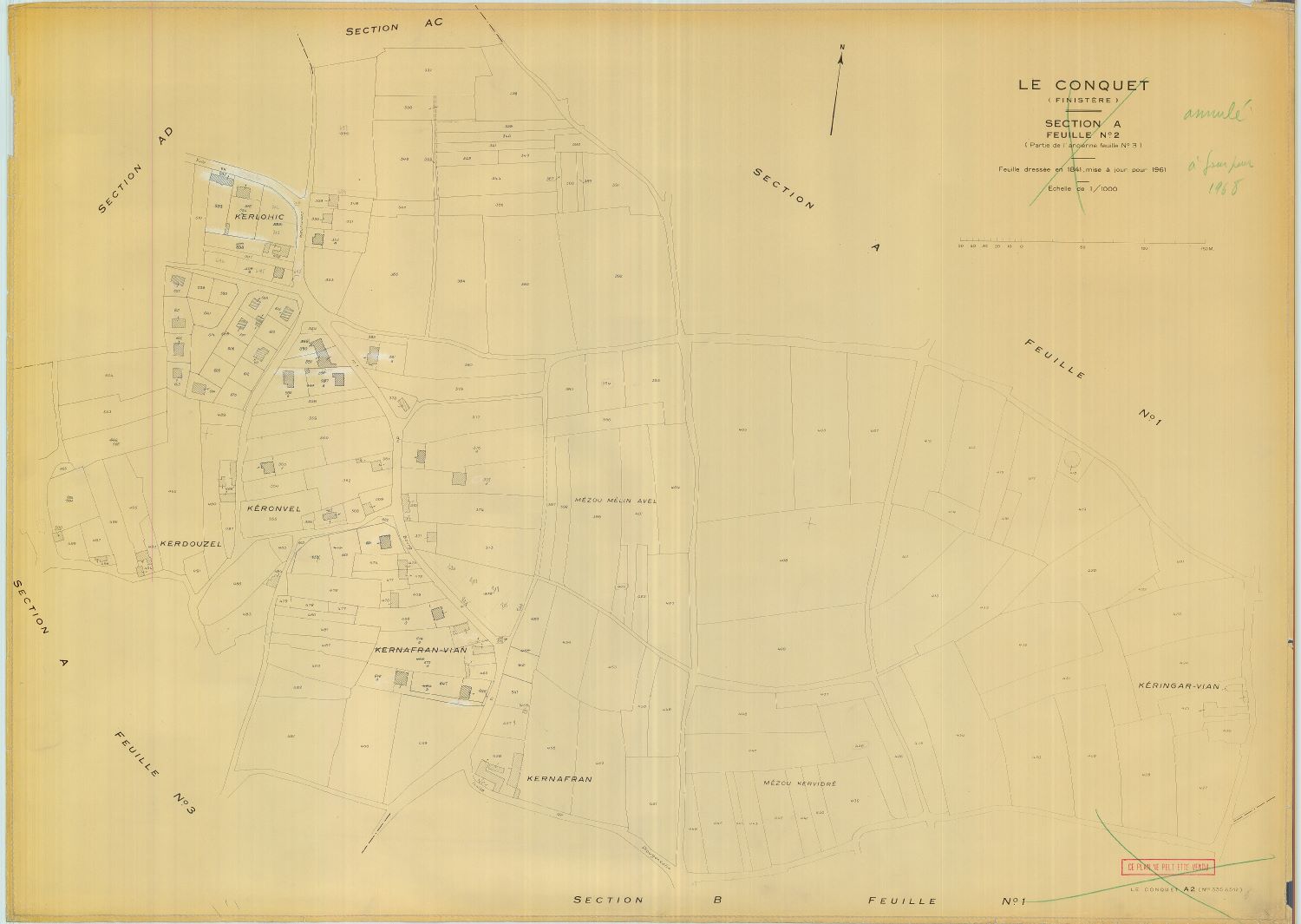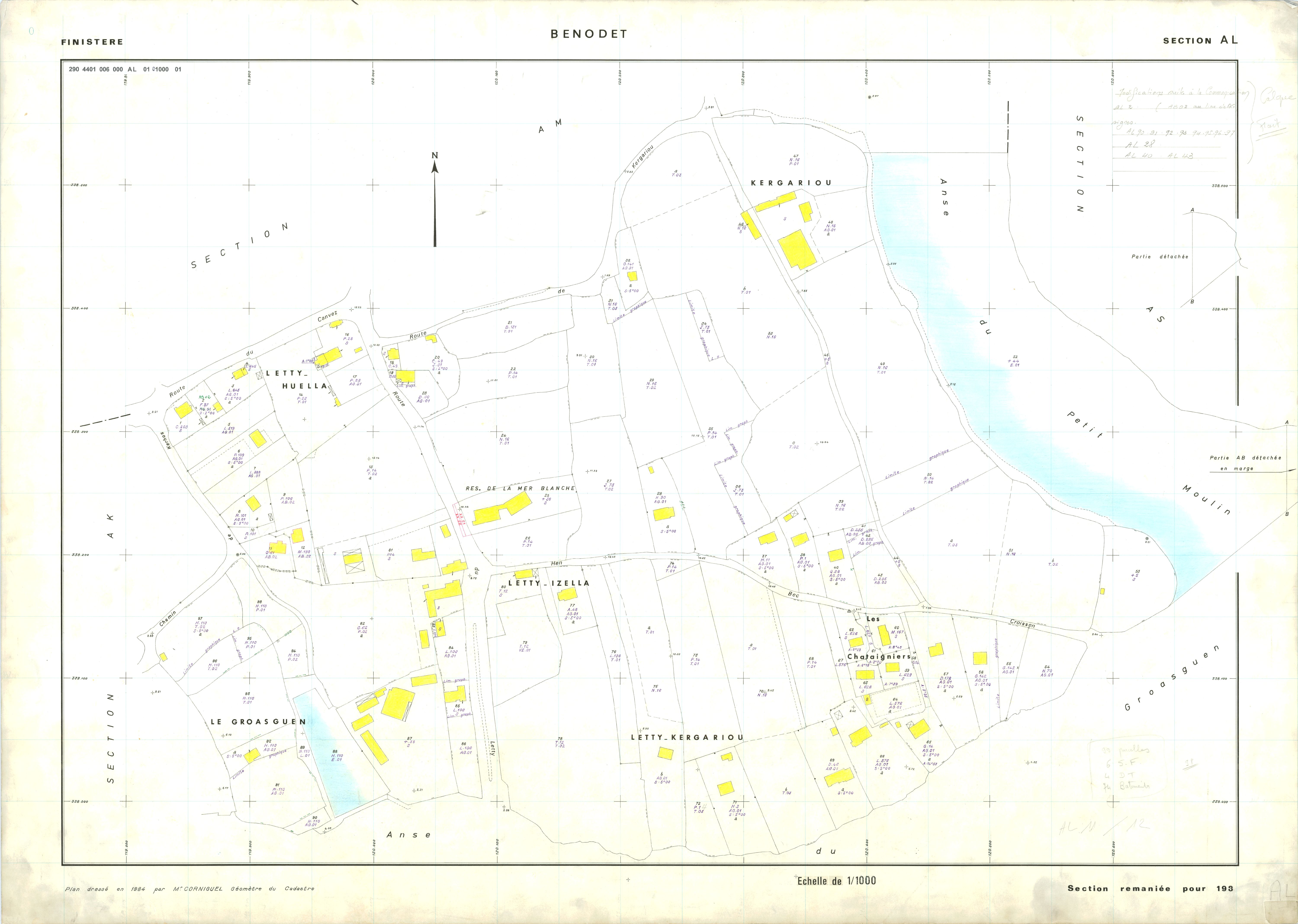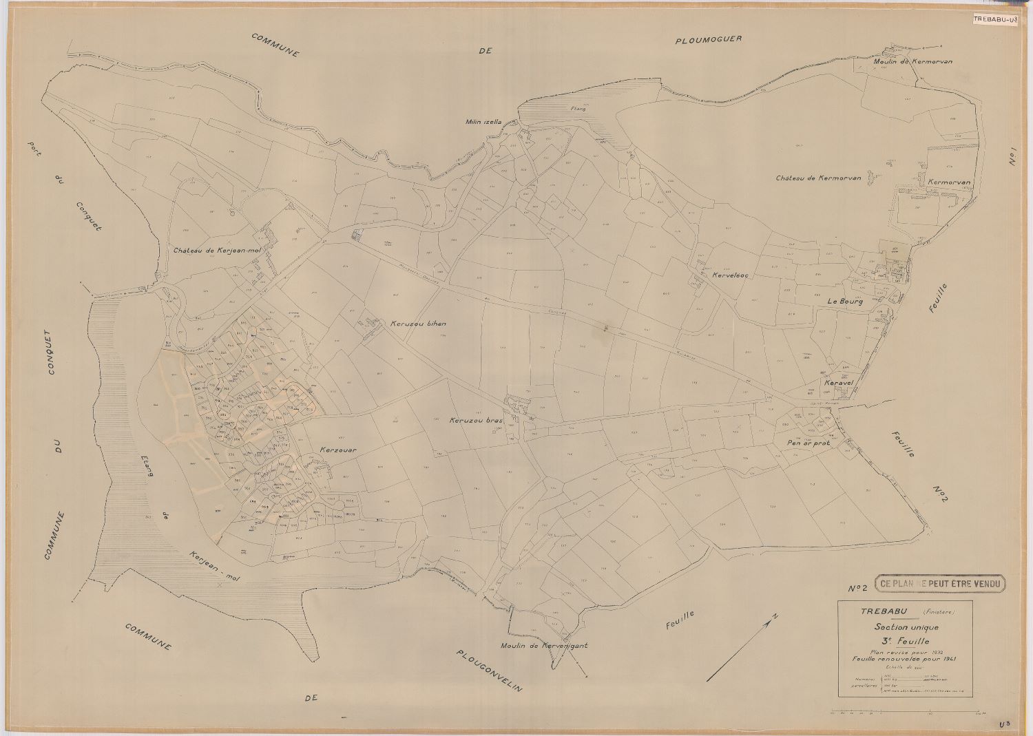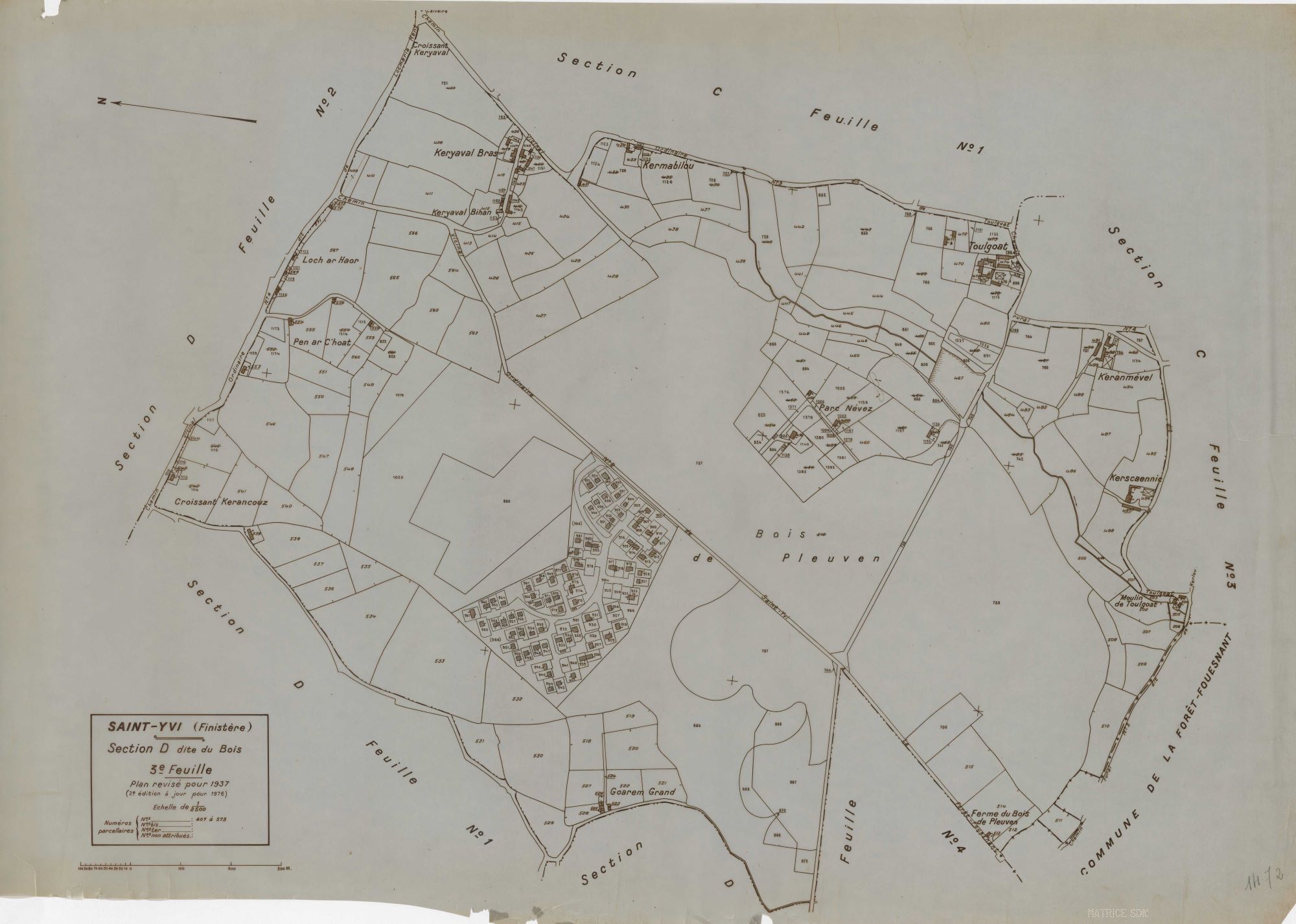Les documents Les documents produits pour le cadastre rénové sont similaires à ceux du cadastre napoléonien (plans, états de section et matrices). Leur présentation est cependant modernisée et les mises à jour plus nombreuses. Une nouvelle catégorie de document fait son apparition : la table de correspondance, qui permet de faire le lien entre les parcelles rénovées et les parcelles napoléoniennes. Le plan parcellaire Commune de Trébabu, rénovation par renouvellement : section unique, feuille 3 (1941), 1961 W 74 Le plan parcellaire dressé au moment des opérations comprend pour chaque commune : un tableau d’assemblage, qui présente la division du territoire communal en sections alphabétiques (A, B…). les plans numérotés (A1, A2, AA, AB, ZA, ZB,…) composant les sections. Chaque plan contient les parcelles numérotées, avec mention du bâti. Il peut exister plusieurs versions des plans parcellaires, en fonction des actualisations et des opérations foncières. Les plans du cadastre rénové ont été numérisés par la Direction départementale des Finances publiques et sont accessibles en ligne sur notre portail L'état de section Commune du Conquet : fiche d'état de section, B480, 2147 W 51 L’état de section se présente, pour chaque commune, sous forme de fiche ou de liste par parcelle, classée par sections. Il contient les éléments relatifs à la parcelle : le numéro de la parcelle (section + numéro) le nom de la parcelle (localisation de la voie ou du lieu-dit) la contenance le numéro de compte du propriétaire dans la matrice cadastrale (la fiche ne mentionne pas le nom du propriétaire) la nature de la parcelle le revenu Il existe 2 modèles de fiches (1er modèle : 1956-1974 ; 2nd modèle : 1974-1979) puis des listes ou microfiches (1980-1989) mais le contenu est similaire. L'état de section est mis à jour, en fonction des actualisations et des opérations foncières, ce qui permet d'avoir un historique sur l'évolution de la parcelle. En 1974, les numéros de compte communaux sont réattribués. Le nouveau numéro est composé de la première lettre du nom de famille + numéro d'ordre (Ex : R22). On retrouve sur la même fiche l'ancien numéro de compte (Ex : 1275) et le nouveau numéro de compte en rouge (Ex : R22). A savoir : En cas de recherche parcellaire, si vous ne disposez pas du nom du propriétaire, l'état de section permet de retrouver le compte associé à la parcelle. La matrice La matrice cadastrale permet de connaître pour chaque contribuable la liste de ses propriétés (bâties ou non bâties) avec leur description (adresse, numéro de parcelle, nature, contenance, impositions) et les mutations. Elle évolue au fil des changements d'organisation : De la rénovation jusqu'à 1974 : la matrice grise, du nom de la couleur de la couverture De 1974 à 1979 : la matrice mécanographique, suite au changement du système informatique A partir de 1979 : apparition des microfiches cadastrales Commune de Tréogat : matrice cadastrale, compte du département du Finistère, 1974, 222 W 616 Matrice grise (de la rénovation jusqu'à 1974) Elle contient : une table des comptes : elle fournit, dans l'ordre numérique des comptes, l'identité du titulaire. les comptes actifs : dans l'ordre alphabétique des propriétaires ; les personnes morales étant placées en tête de classement. les comptes supprimés : dans l'ordre numérique des comptes. Chaque compte possède différents feuillets : feuillets roses (propriétés bâties) et feuillets blancs (propriétés non bâties), de la rénovation jusqu'aux années 1960 feuillets bleus (propriétés bâties - recto et non bâties - verso), des années 1960 jusqu'à 1974 A savoir : Les biens exemptés permanents (ex : édifices publics, bâtiments ruraux, ...) ne sont pas mentionnés dans les matrices. Commune de Guilligomarc'h : matrice cadastrale, compte du département du Finistère, 223 W 220 Matrice mécanographique (1974-1979) Le changement de système informatique - passage au système Majic 1 (Mise à jour des informations cadastrales 1) - entraîne la création d'une nouvelle matrice. L'organisation de la matrice évolue : retrait en début d’année des relevés périmés (suppression ou ajout de parcelles, modification du revenu ou de la contenance, …), tamponnés de l’année de suppression, archivés dans une reliure et remplacés par les actualisés. A savoir : Seules les matrices mécanographiques pour l'arrondissement de Quimper ont été versées aux Archives départementales Microfiches cadastrales (à partir de 1979) A partir de 1979, les matrices sont remplacées par des microfiches cadastrales, qui ne sont pour le moment pas consultables, car nécessitant une remise en ordre et une numérisation au préalable. La table de correspondance La table de correspondance permet de faire le lien entre le numéro du cadastre rénové et celui du cadastre napoléonien. La fiche est organisée dans l'ordre numérique des numéros du cadastre rénové. Attention : en cas de découpage, une référence de parcelle napoléonienne peut correspondre à plusieurs parcelles rénovées. Commune du Conquet : table de correspondance, 2147 W 550 Cependant, il n'en existe que pour 18 communes de l'arrondissement de Brest et 1 commune de l'arrondissement de Quimper : Brest (lacunaire : 7 fiches de la section A) Guilers Guipavas Guissény Hanvec La Forêt-Fouesnant Lampaul-Plouarzel Landéda Landerneau Landunvez Le Conquet Locmaria-Plouzané Ouessant Plougastel-Daoulas Plougonvelin Plouguerneau Plounéour-Brignogan-Plages (Plounéour-Trez) Plouzané Saint-Renan Les tables numérisées sont accessibles dans la rubrique "Etat de section" du répertoire méthodique, dans le dossier des communes concernées. S’il n’existe pas de table de correspondance pour la commune que vous recherchez, vous pouvez retrouver cette information dans le bleu de rénovation qui contient pour chaque parcelle le numér