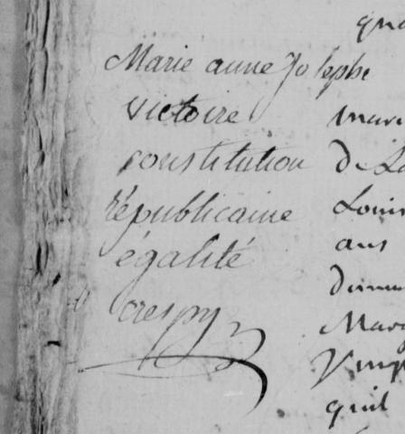 Les documents Avant 1793, les registres paroissiaux Avant 1793, les registres paroissiaux contiennent des actes de baptêmes, mariages et sépultures (BMS). On y trouve également des actes relatifs à l'état civil protestant. Ce que contiennent généralement les actes : Baptême date de la naissance et du baptême nom, prénom(s) et sexe de l'enfant noms et prénoms des parents noms et prénoms du parrain et de la marraine Mariage date du mariage noms et prénoms des mariés, paroisse d'origine et mention de leur veuvage et identité du conjoint défunt le cas échéant noms, prénoms, paroisse d'origine de leurs parents et mention de leur décès le cas échéant date d'un décret de justice le cas échéant noms et prénoms des témoins Indiquent parfois l'âge ou la date de naissance des mariés. Sépulture date du décès et de l'inhumation nom et prénom(s) du défunt noms et prénoms des parents paroisse voire village d'origine âge du défunt date et lieu d'inhumation Le contenu des actes évolue avec le temps. Le plus souvent, plus les actes sont anciens moins ils comportent d'informations. À partir de 1793, les registres de l'état civil À partir de 1793, les registres d'état civil contiennent des actes de naissances, mariages et décès (NMD) et des tables décennales (TD). Ce que contiennent généralement les actes : Naissance date, heure et lieu de naissance nom, prénom(s) et sexe de l'enfant noms, prénoms, âges, professions et domicile des parents noms, prénoms, âges, professions des témoins et liens de parenté avec les parents Peuvent comporter des mentions marginales. Pour en savoir plus, se reporter à l'onglet "Mentions marginales" ci-dessous. Mariage date et lieu du mariage noms, prénoms, dates et lieux de naissance, professions et domiciles des mariés noms, prénoms, état matrimonial, professions et domicile des parents noms, prénoms, âges, professions, domiciles et liens éventuels de parenté des témoins Peut éventuellement comporter : l'état matrimonial des mariés veufs ou divorcés avec nom, prénom(s), profession et domicile du précédent conjoint, ainsi que lieu et date du décès ou du jugement de divorce la mention d'un contrat de mariage avec date, nom du notaire et lieu de l'étude si minorité des mariés : noms, prénoms, professions des tuteurs ou curateurs et date de la dispense d’âge, de parenté ou d’alliance accordée Décès date, heure, lieu du décès nom, prénom(s), âge, profession et domicile du défunt noms et prénoms des parents situation matrimoniale du défunt nom, prénom(s) du conjoint avec indication de son décès ou du divorce le cas échéant nom, prénom(s), âge, profession, domicile et lien de parenté du déclarant parfois la cause du décès Les tables décennales sont des listes qui recensent tous les actes inscrits dans une commune dans les 10 dernières années. La plupart du temps, elles sont subdivisées en trois parties dans cet ordre : naissances, mariages, décès. Les noms des personnes y sont classés par ordre alphabétique avec mention de la date de l'acte. À savoir Selon les époques et l'évolution de la législation, de nombreux actes ont pu être retranscrits ou enregistrés sur les registres : adoptions, annulations d'actes, baptêmes de cloches, divorces, extraits baptismaux ou mortuaires, fiançailles, jugements (rectificatifs ou rétablissement d'actes disparus), légitimations ou reconnaissances d'enfants, mariages de mineurs, naturalisations, noviciats ou prises d'habits de religieux, oppositions à des mariages, professions de foi, promesses de mariages, publications de mariages ou de bans, relevés d'actes et tables diverses, etc. Focus sur un acte de naissance représentatif de son époque 1793... Marie Anne Josèphe Victoire Constitution Républicaine Égalité Crespy Un prénom patriotique ! Le citoyen Noël Jean Étienne CRESPY, âgé de 33 ans, épicier de la place Saint-Thomas dans la ville de Landerneau appartient au groupe des Montagnards, un des courants révolutionnaires dominants et exaltant le plus les valeurs de la Révolution (source infobretagne.com). Le 24 juin 1793, la Constitution de l’an I est proclamée par la Convention. Elle est ensuite soumise le mois suivant au plébiscite des communes de France. Les citoyens de Landerneau sont dès lors invités à exprimer leur adhésion à la nouvelle Constitution. Le 27 juillet 1793, la veille du plébiscite, le sieur Crespy se présente à la mairie pour faire la déclaration de la naissance de sa fille. Cet acte, dont la copie numérique est accessible sous la cote 1372 E-dépôt 34, présente un aspect singulier de cette époque bouillonnante. Imaginons la scène : Notre épicier, fervent républicain, s’adresse à l’officier public nommé Le Guen et lui déclare tout haut et fièrement qu’il souhaite nommer sa fille « MARIE ANNE JOSÈPHE VICTOIRE CONSTITUTION RÉPUBLICAINE ÉGALITÉ ». Par ce choix, le citoyen Crespy affirme son attachement aux valeurs démocratiques de la Révolution française, témoignant de l’existence d’une « révolution culturelle » en l’an II. Ce prénom s’inscrit dans l’actualité de cette période par l’adhésion à la nouvelle Constitution et à la Ière République née en septembre 1792. À Epernay, nous avons retrouvé une enfant née le 10 juillet 1793 et prénommée « VICTORINE CONSTITUTION LIBERTÉ ÉGALITÉ ». Pour autant, comme dans la majorité des cas où l’on retrouve des prénoms révolutionnaires, il choisit un compromis en conservant malgré tout des références chrétiennes. Cependant, l’originalité tient surtout ici de l’accumulation des éléments révolutionnaires dans le prénom. À Paris cela ne concerne par exemple que 2 à 3 % des actes durant la décennie révolutionnaire. La proportion de prénoms faisant référence à la Révolution est toutefois assez faible puisqu’il n’en existe que deux exemples sur 179 naissances à La