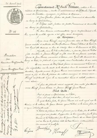 Les documents La présentation qui suit est volontairement limitée aux principaux actes et répertoires, ainsi qu’à quelques documents complémentaires utiles à la recherche conservés dans la sous-série 4 E. Documents principaux La minute La minute est le nom donné à l’original d’un acte notarial. Si la forme d’une minute varie sensiblement selon l’époque de sa rédaction, certains de ses éléments demeurent cependant intangibles (date, nature et objet de l’acte, noms et signatures des parties, nom, résidence et signature du notaire, mention d’enregistrement ou de contrôle…). Établies le plus souvent sur feuilles volantes, les minutes sont par la suite enliassées chronologiquement et ordonnées par année, constituant ainsi le minutier de l’étude. Ces actes sont rédigés en diverses circonstances et concernent souvent l’activité économique : contrats de vente, baux, adjudications, échanges, opérations de crédit (rentes, quittances, obligations, prêts mutuels, reconnaissances de dettes), actes de sociétés et d’associations, dépôts de pièces, bornages, mitoyennetés et servitudes… la personne ou la famille : promesses et contrats de mariage, donations entre époux, testaments, inventaires après décès, successions, donations, partages, tutelles et curatelles, actes de notoriété, tirages au sort, contrats d’apprentissage... Langue de rédaction Les minutes sont rédigées en langue française, conformément à l'ordonnance de Villers-Cotterêts d'août 1539, même si, jusqu'au début du XIXème siècle en Basse-Bretagne, de nombreuses affaires se traitent avec "explications en breton", langue alors familière à bien des notaires. Certains d’entre eux continueront, jusqu’au début du XXème siècle, à insérer ponctuellement du breton dans leurs actes (des testaments de clients monolingues, notamment), ou à l’utiliser à haute voix, en concomitance du français, devant les contractants lors de la lecture finale du document. Signatures En vertu d’une ordonnance de janvier 1561, la minute doit être revêtue des signatures des parties. Le notaire rédacteur de l'acte (dit notaire principal, rapporteur, instrumenteur, registrateur ou receveur) signe en bas à droite et le notaire qui – le cas échéant – sert de témoin (dit notaire secondaire), en bas à gauche. Conservation et établissement de copies Antérieurement à la loi de ventôse an XI (mars 1803), lorsque deux notaires rédigent un acte commun, c'est le notaire rapporteur qui garde la minute. Dans les contrats de mariage, l'usage veut que ce soit le notaire de la future épousée qui la verse à son minutier. Dans le cas des contrats de vente, elle reste en possession du notaire de l'acquéreur. La minute a valeur probatoire et doit réglementairement être conservée 75 ans après sa rédaction par le notaire rédacteur puis par ses successeurs, avant d’être versée aux Archives départementales pour une conservation définitive. À partir de l’orignal conservé dans ses archives, un notaire peut établir des copies authentiques qu’il remet aux parties concernées. Ces actes, appelés grosses ou expéditions, sont considérés comme des archives privées puisque détenus par les parties contractantes. L’extrait, pour sa part, consiste en une transcription partielle d’une copie authentique. Malgré leur statut d’archives privées, ces divers documents se retrouvent parfois dans nos fonds d’archives publiques, en regard de la minute originale ou à sa place si elle est manquante. Le cas particulier du brevet Dans la loi de ventôse an XI (mars 1803) la minute est distinguée de l’acte passé en brevet. Les notaires ne sont pas tenus de passer en minutes les actes dits « simples » comme les certificats de vie, procurations, notoriétés, quittances, arrérages de pensions et rentes,… La rédaction de ces actes sous forme de minutes est possible mais s’ils les établissent sous forme de brevets, les notaires n’ont pas pour obligation de les conserver. En effet, contrairement à la minute, l’original de l’acte passé en brevet, signé selon les cas entre les parties ou par le notaire seul, est remis aux parties contractantes. L'acte ne sera par conséquent retrouvé dans le minutier que si le notaire en a conservé et classé lui-même une copie. S'ils ne sont pas conservés dans le minutier, ces différents actes sont cependant obligatoirement inscrits au répertoire. Présentation illustrée d'un acte Fichier Accéder à la présentation illustrée d’un acte notarié du début du XXe siècle (.pdf - 949.56 Ko) Le répertoire L’accès aux minutes et brevets (s’ils sont présents dans les fonds) est facilité par l’existence d’un répertoire tenu réglementairement depuis 1791. Les actes passés par le notaire en son étude y sont inscrits chronologiquement de façon journalière. Le répertoire prend la forme d’un registre ou d’un cahier visé, coté et paraphé par le président du tribunal civil du ressort de l'étude. Depuis l’an VII, il est composé de plusieurs colonnes contenant des informations résumant l’acte : numéro d’ordre date nature de l’acte noms, prénoms et domicile des parties contractantes indication, situation et prix des biens date et références de l’enregistrement Des répertoires existent également pour la période de l’Ancien Régime. Ils ne sont pas structurés en cette forme normalisée qu’ils prendront à partir de l’an VII. Néanmoins, les éléments qui les composent sont assez similaires et consistent en un résumé plus ou moins détaillé de chaque acte (date, nature de l’acte, noms des parties contractantes, date et référence du contrôle et de l’insinuation). Depuis 1791, le répertoire doit être tenu en double exemplaire : Le premier est conservé à l’étude puis versé aux services d’Archives départementales en même temps que les minutes correspondantes. 